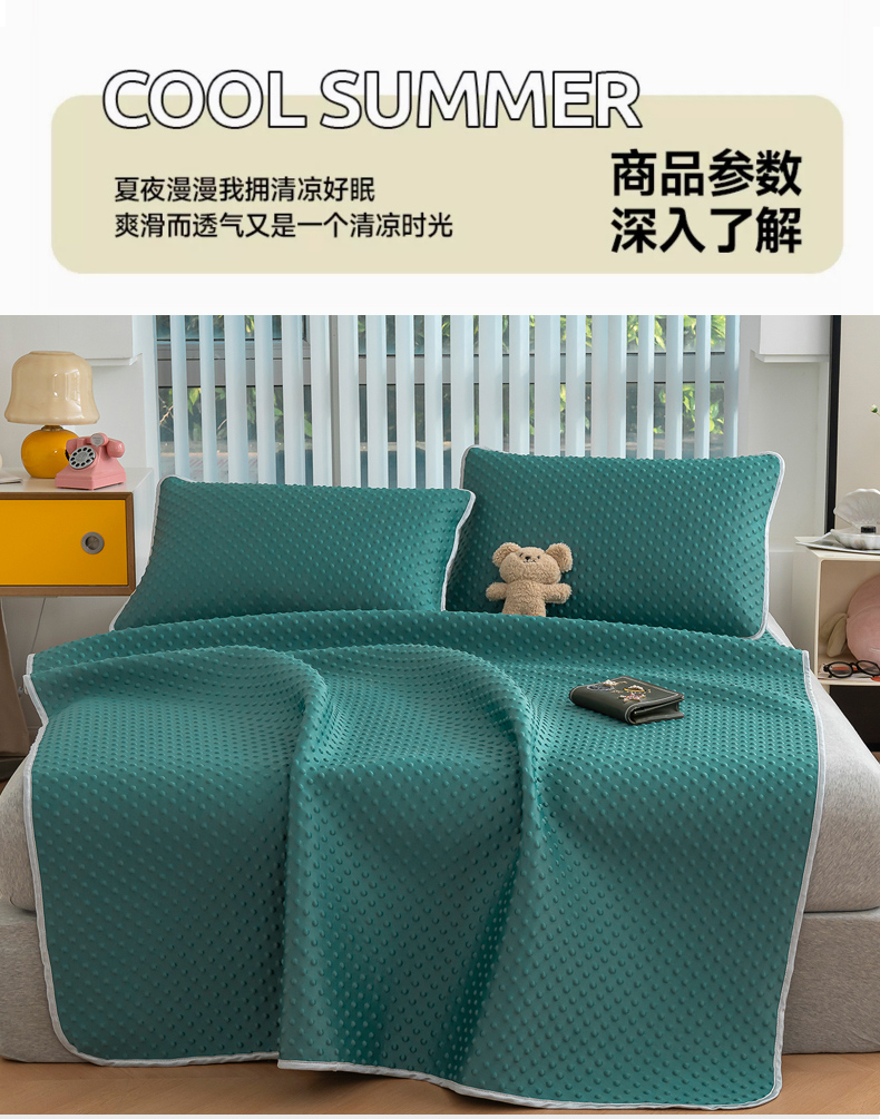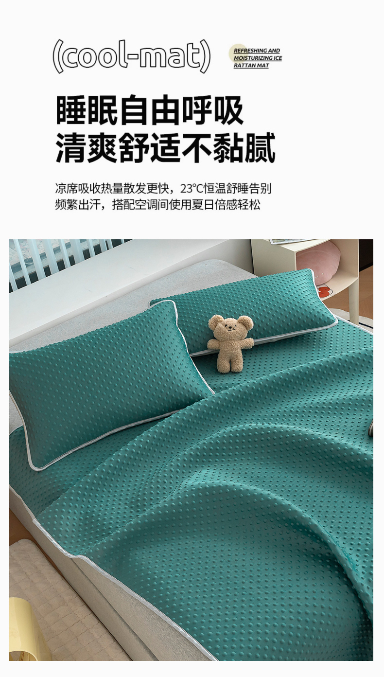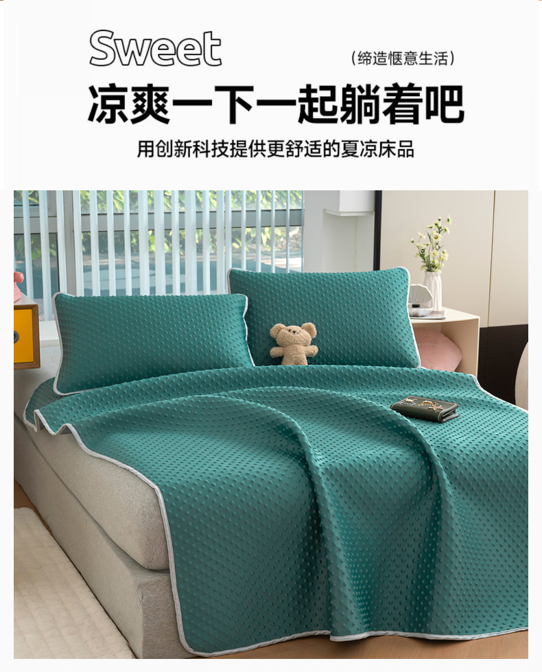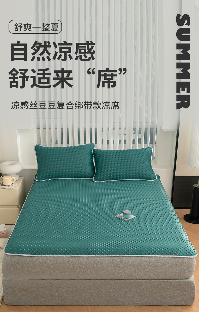 商品名称:默忆 2026新款3D轻奢风A类直播网红热款凉感丝冰豆豆三明治复合床单款凉席两件套三件套 墨绿