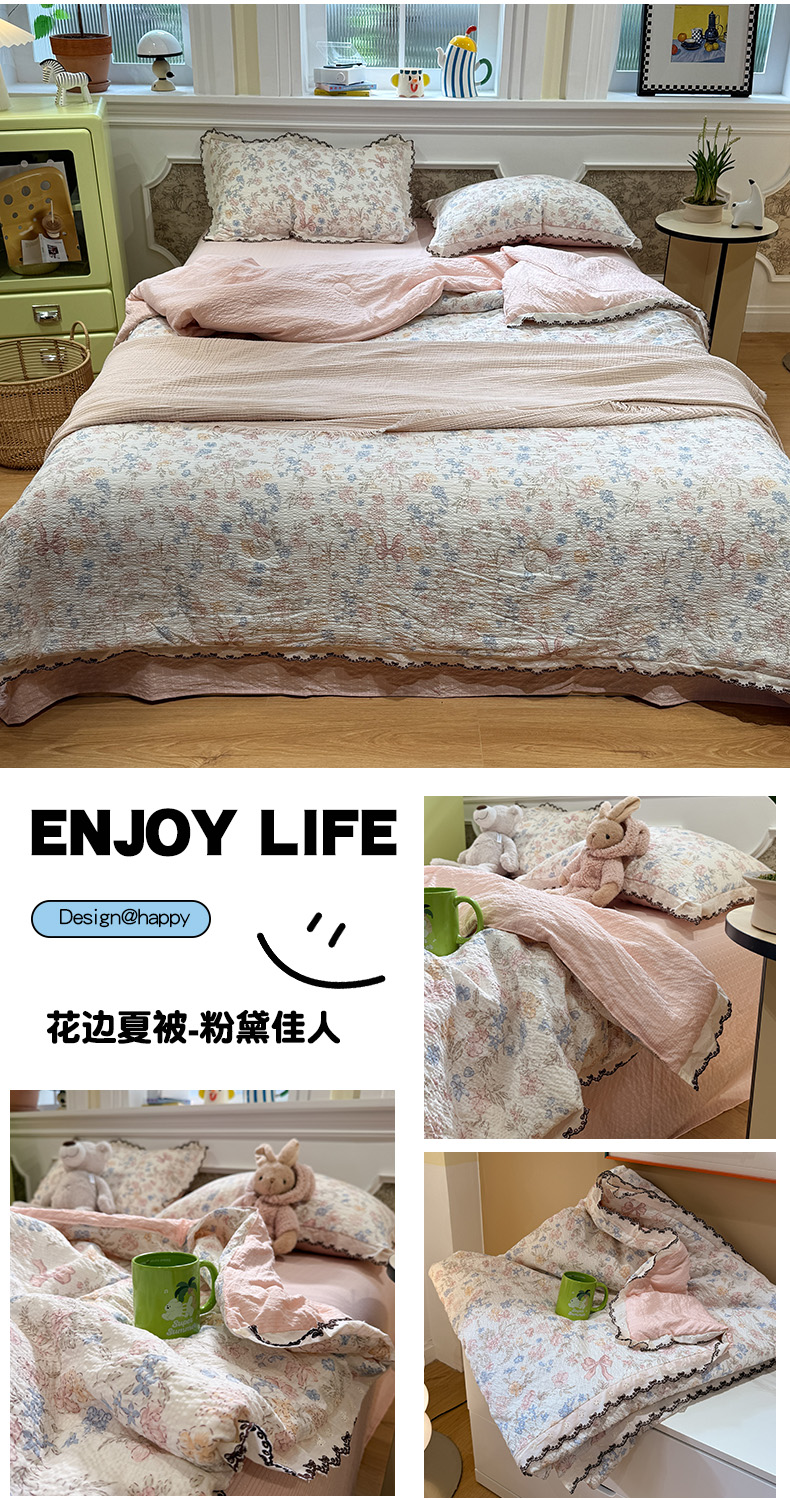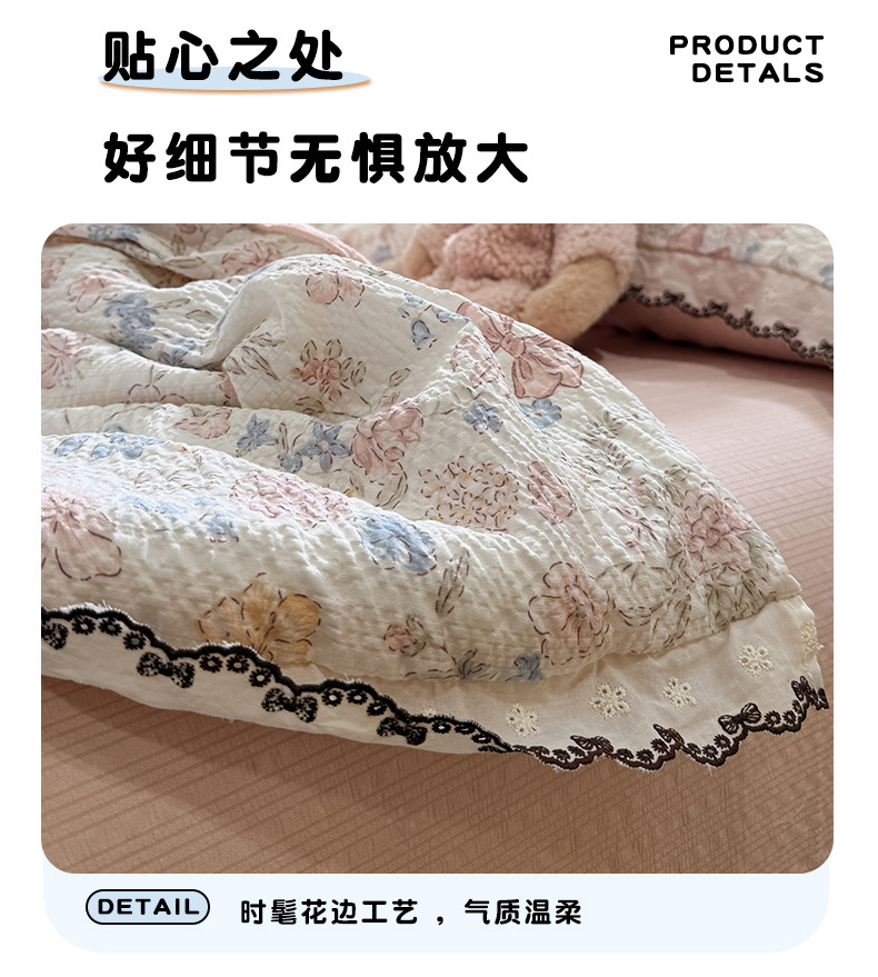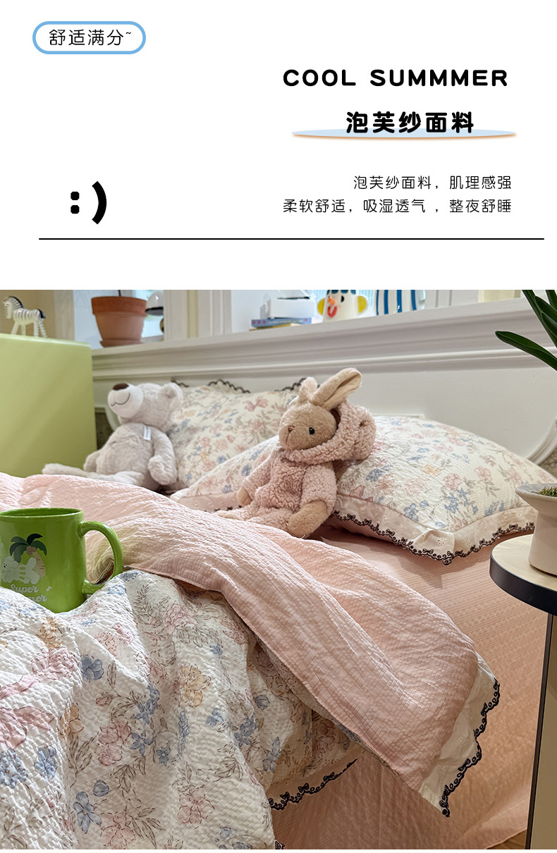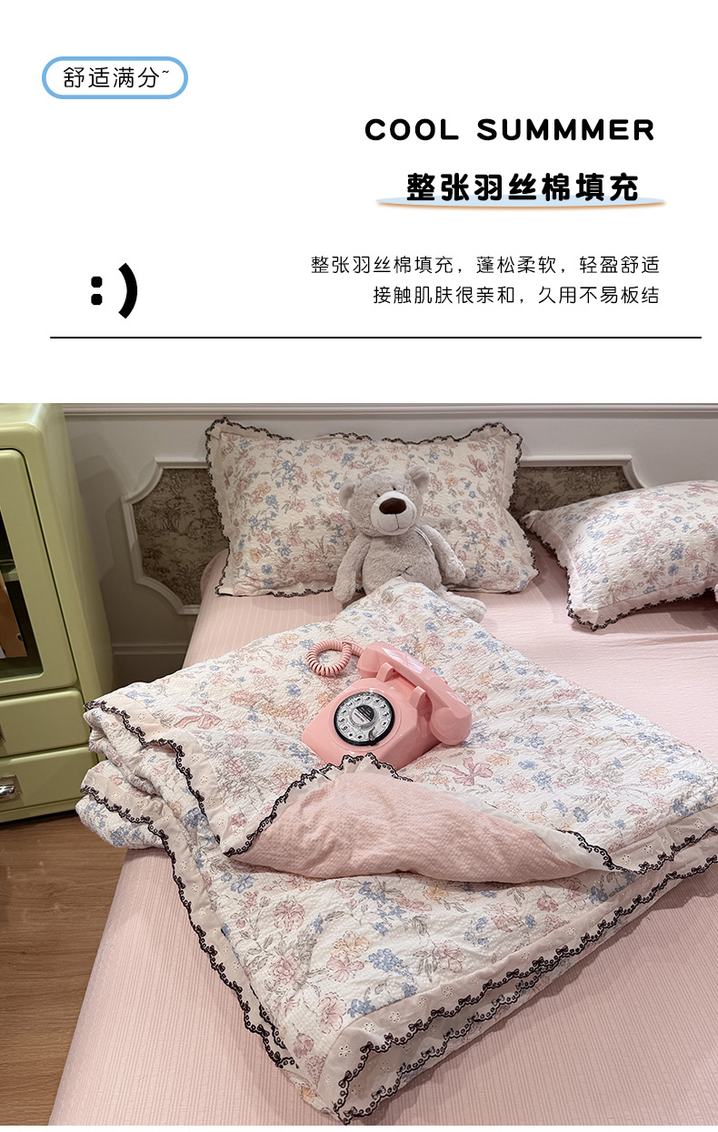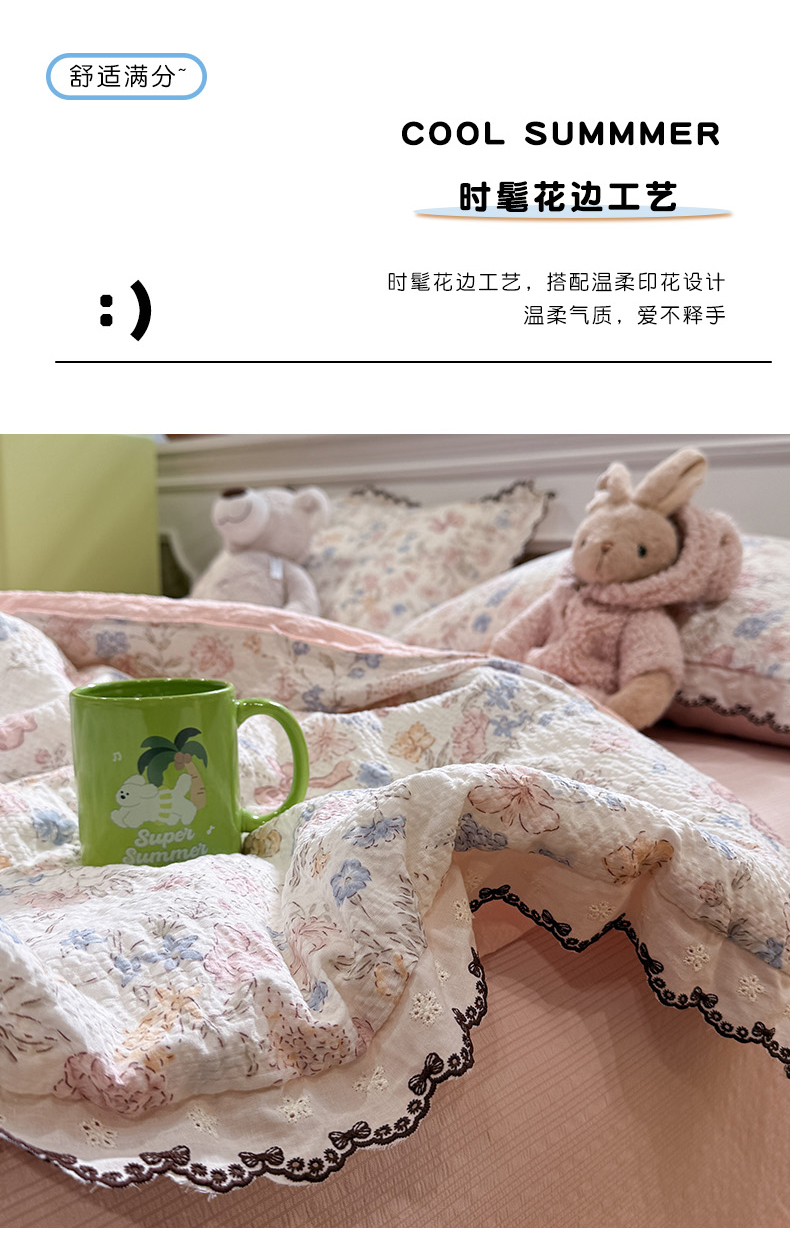 商品名称:水墨江南 2026新款泡芙纱全棉花边夏被四件套 花边夏被-粉黛佳人