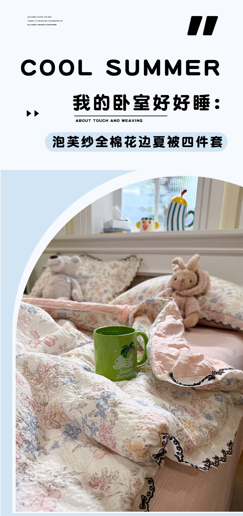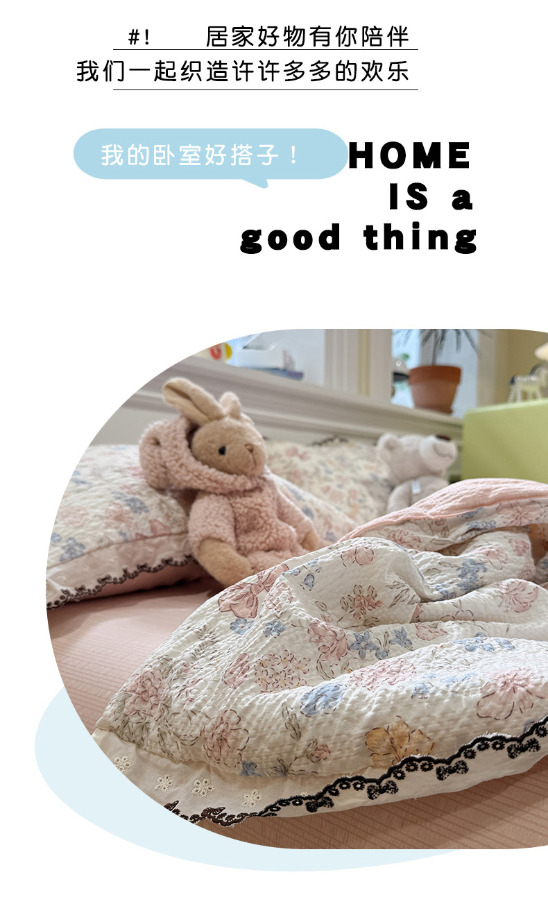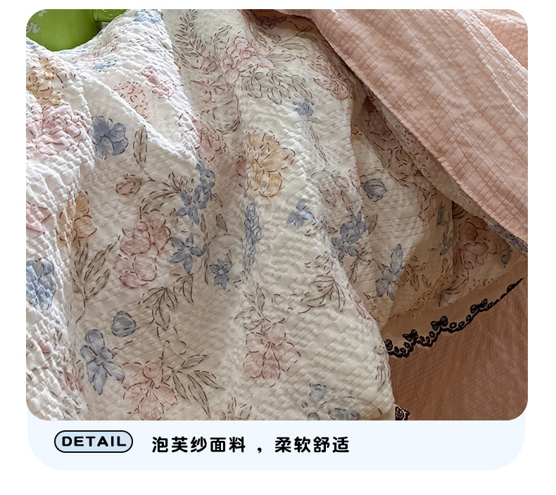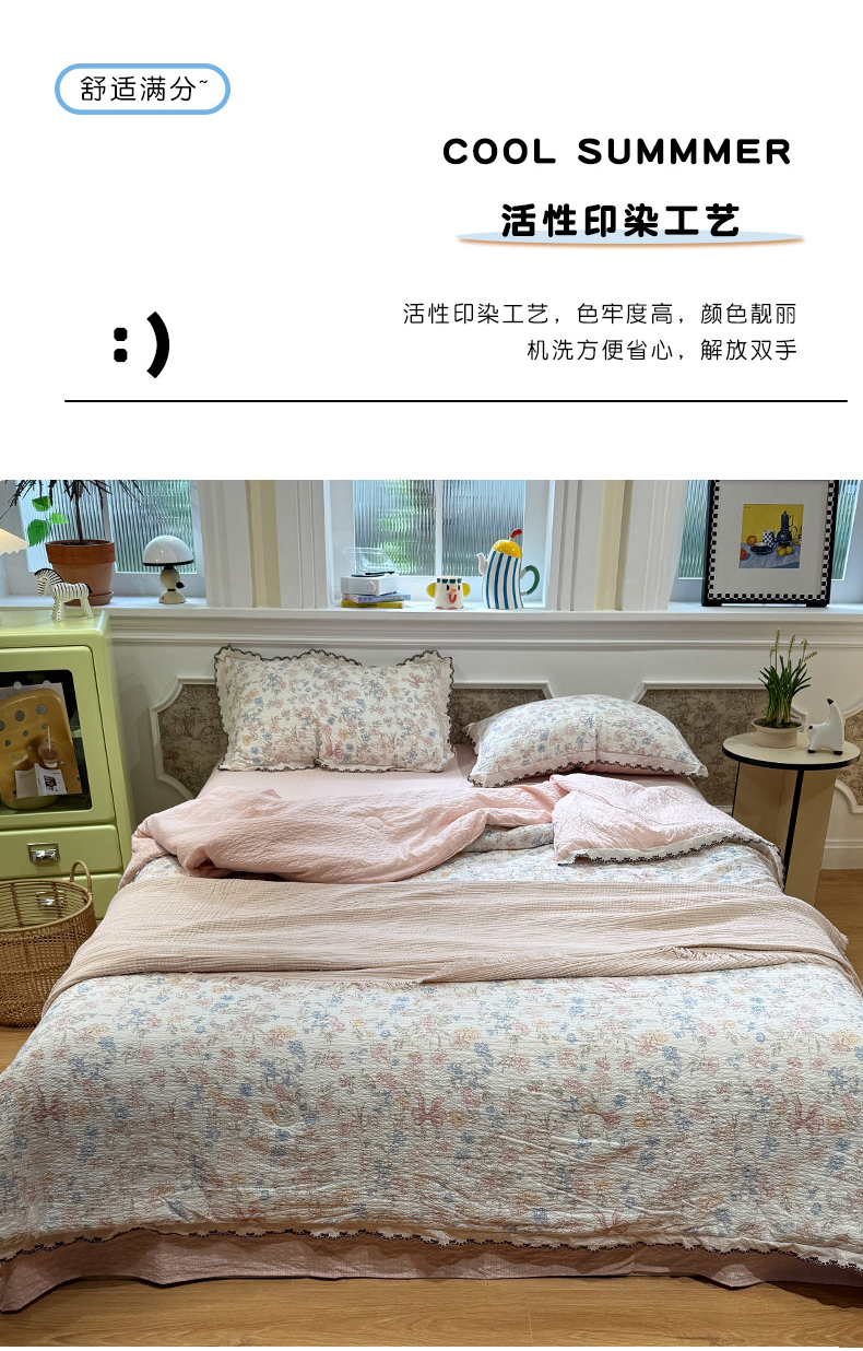 商品名称:水墨江南 2026新款泡芙纱全棉花边夏被四件套 花边夏被-粉黛佳人