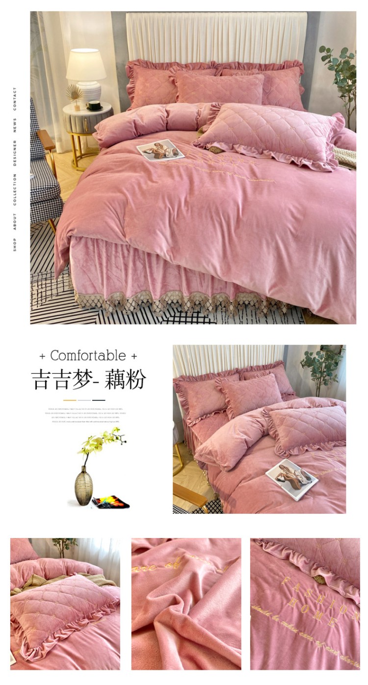 (总)星尚家纺 2024新款加厚保暖全消光牛奶绒夹棉床裙四件套-玫瑰之恋,粉玉,寐紫,浅蓝,水绿