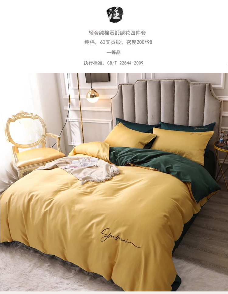 商品名称:2021新款纯色拼色纯棉全棉60S贡缎长绒棉绣花四件套 黄色