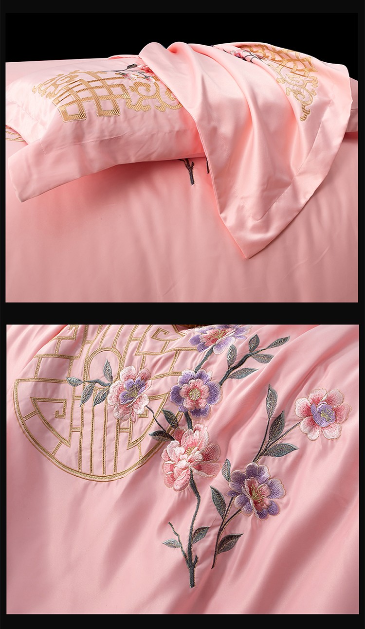 婚庆四件套大红色刺绣花全棉纯棉结婚八色床上用品 暗香粉玉