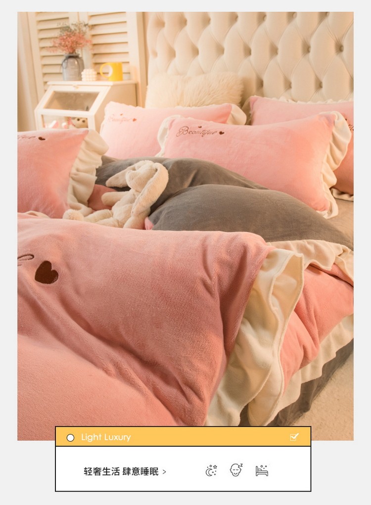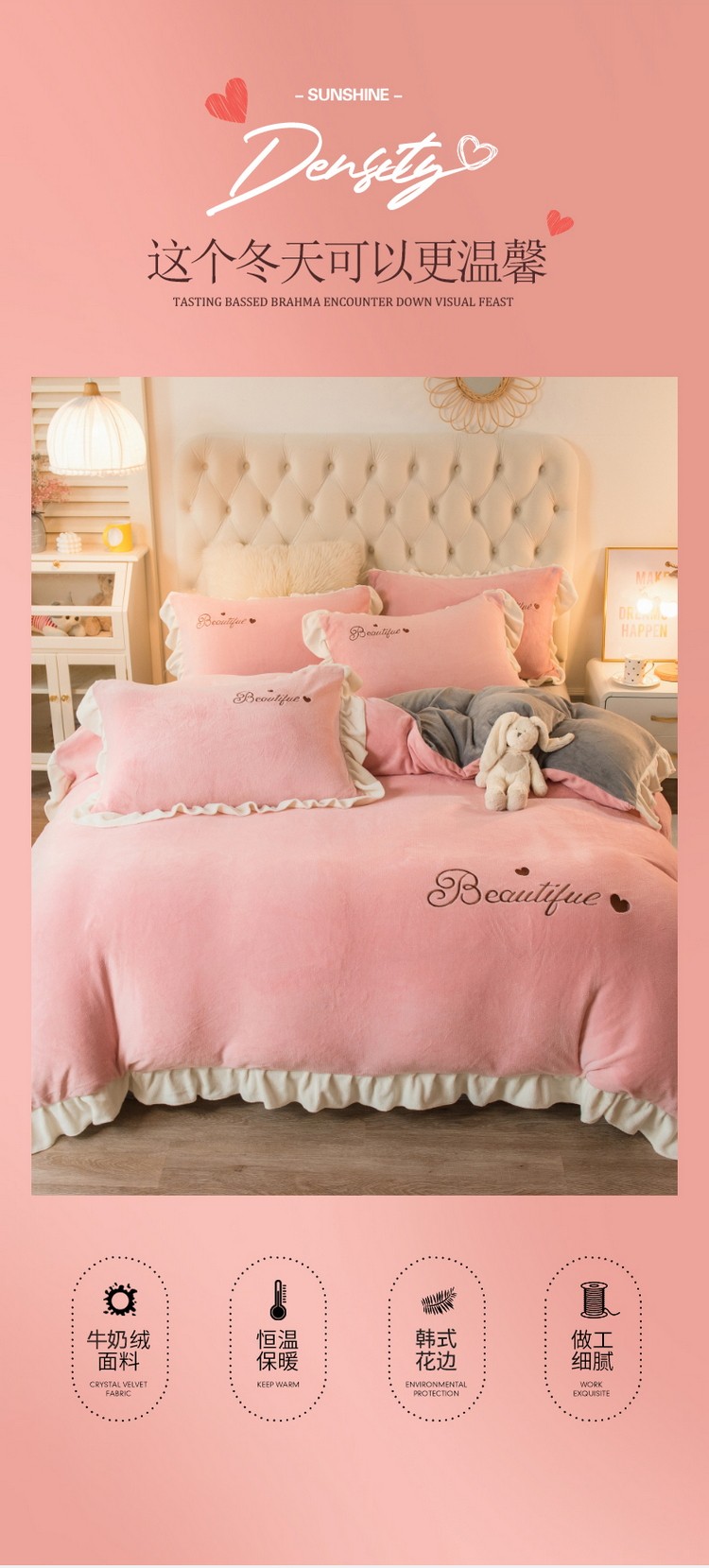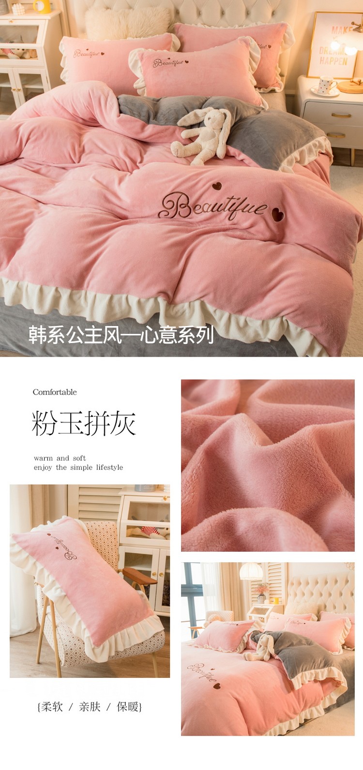 商品名称:丝羽坊 2021新款牛奶绒韩系心意系列四件套 粉玉拼灰