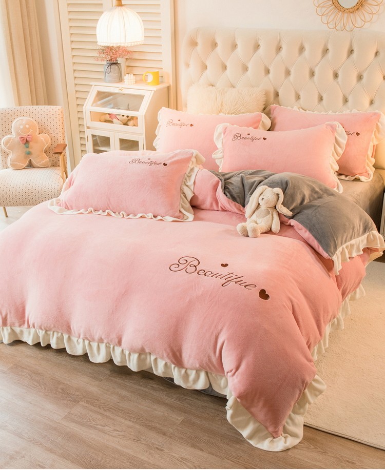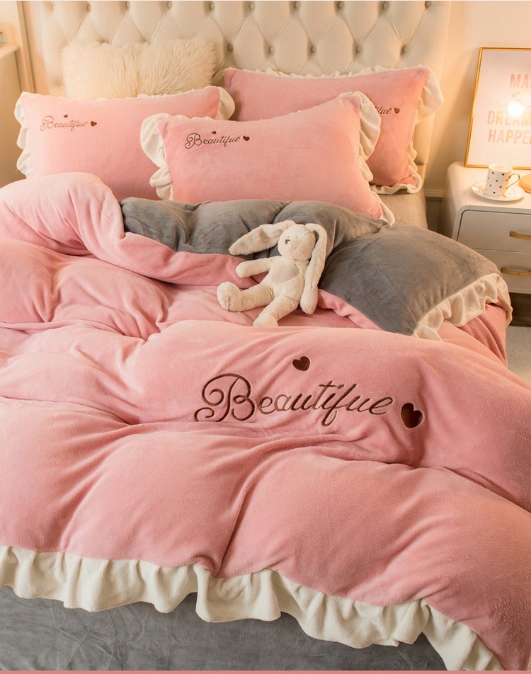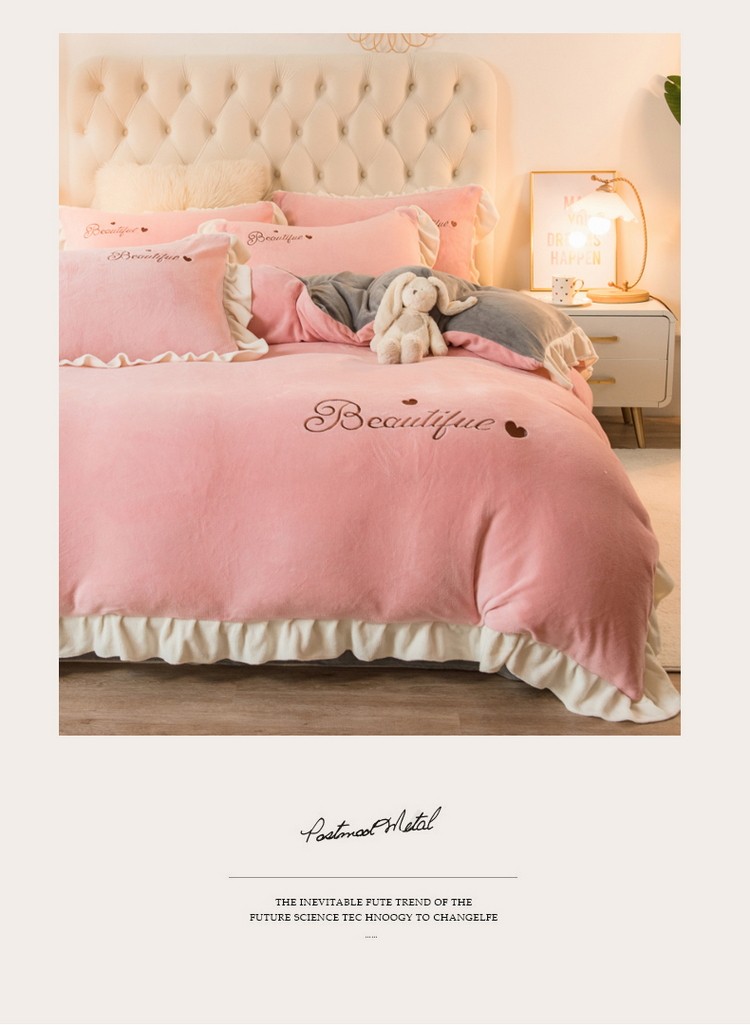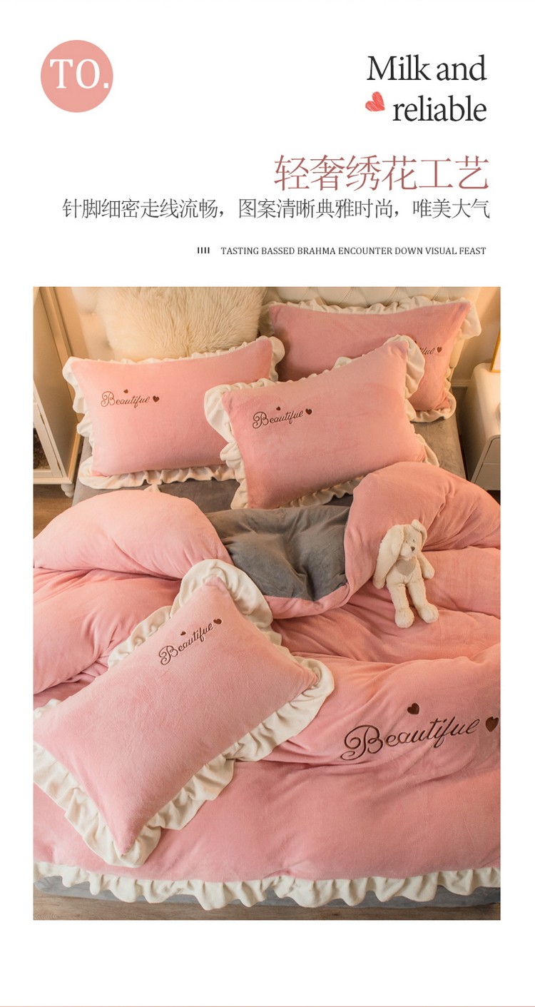 商品名称:丝羽坊 2021新款牛奶绒韩系心意系列四件套 粉玉拼灰