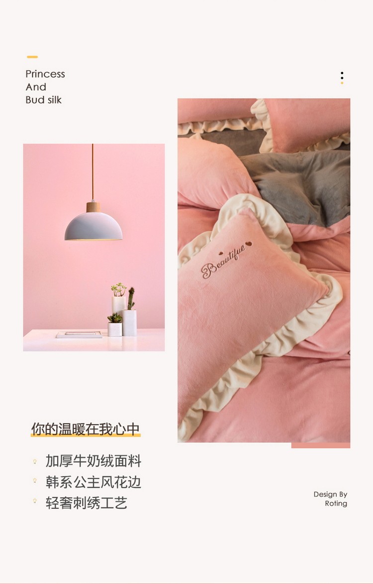 丝羽坊 2021新款牛奶绒韩系心意系列四件套 粉玉拼灰