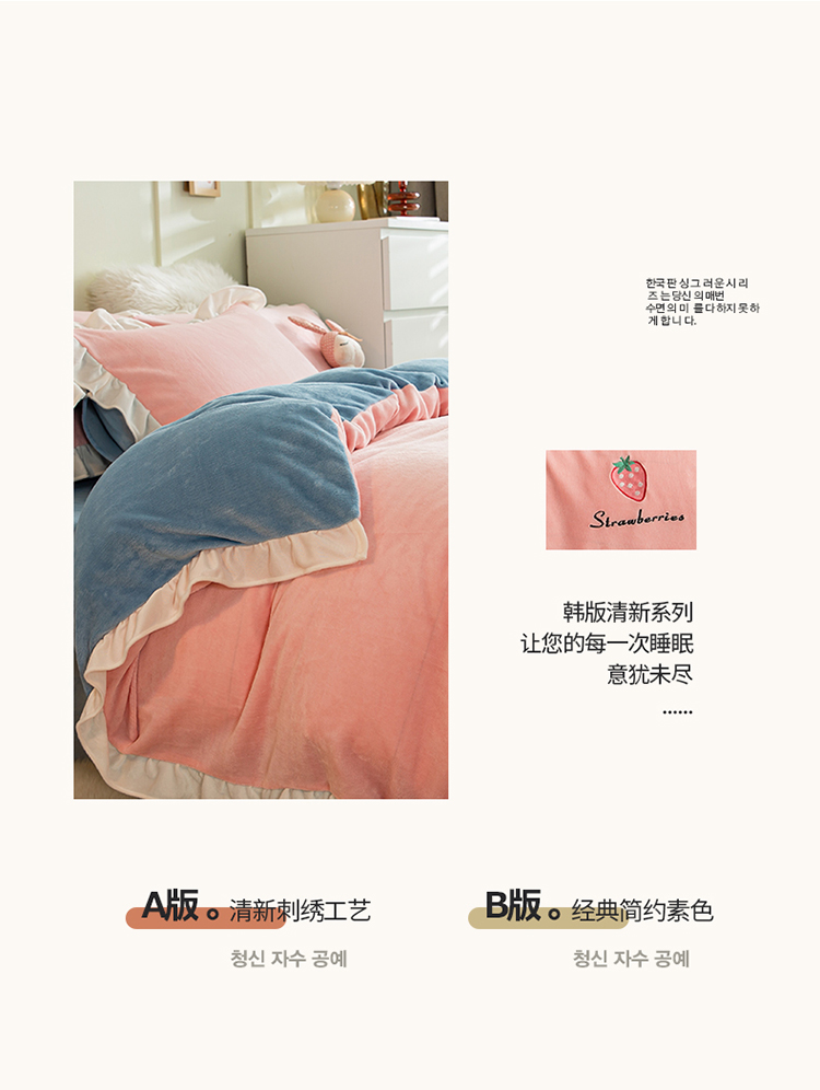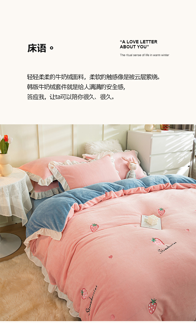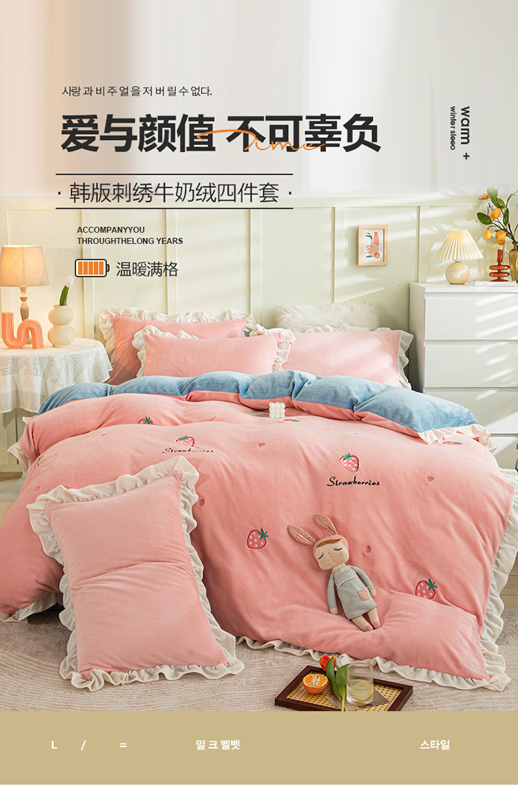沐辰 2021新款超厚韩版刺绣牛奶绒四件套 奶油草莓-粉