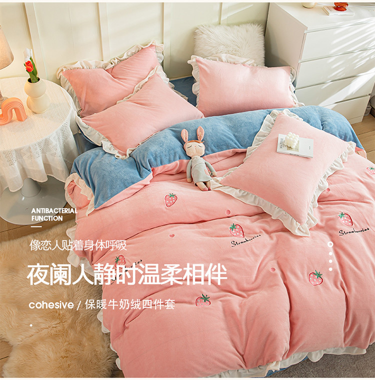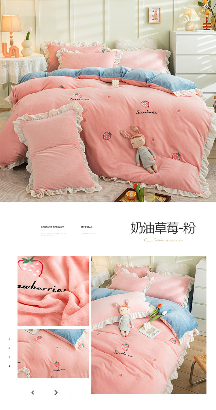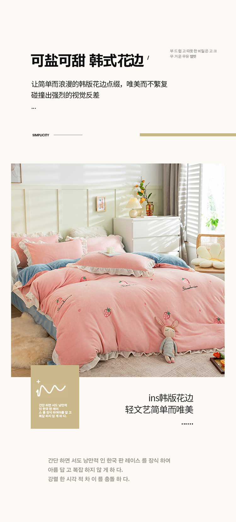 商品名称:沐辰 2021新款超厚韩版刺绣牛奶绒四件套 奶油草莓-粉