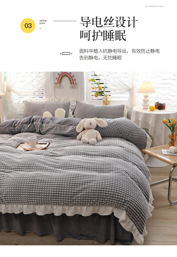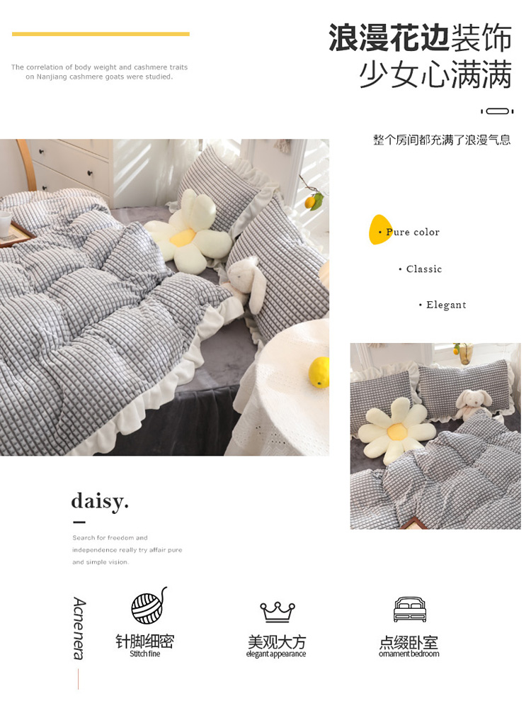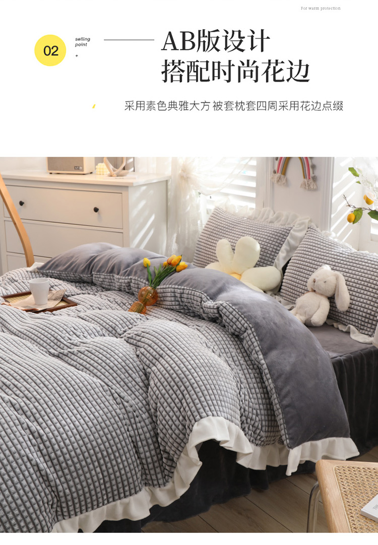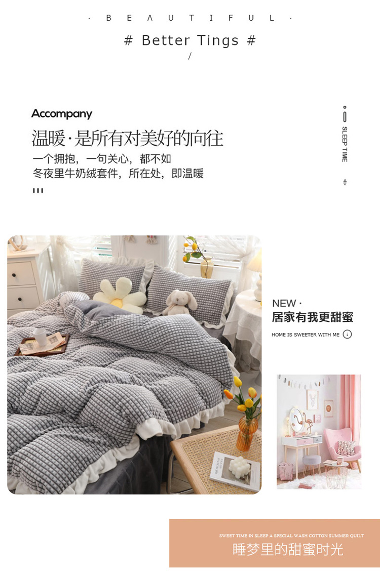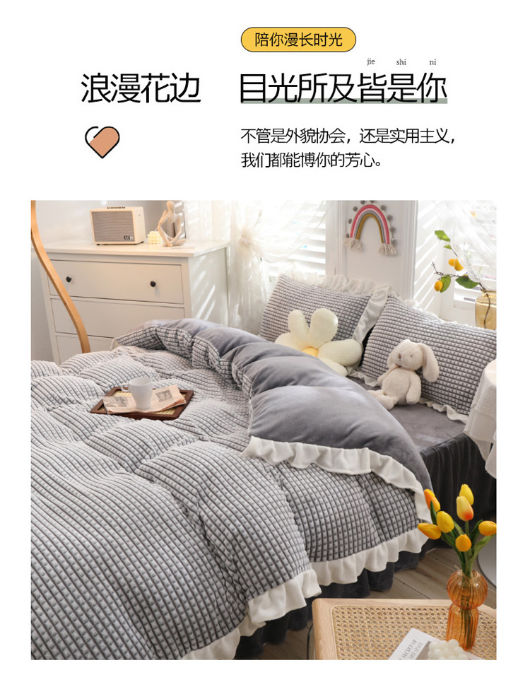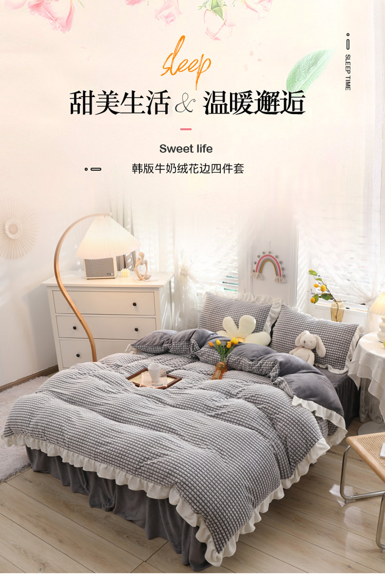当前位置: 91家纺网 > 商品网购 > 床品套件 > 四件套 > 牛奶绒四件套 > 慕澄 2022新款牛奶绒剪花荷叶边四件套实拍图 浪漫灰