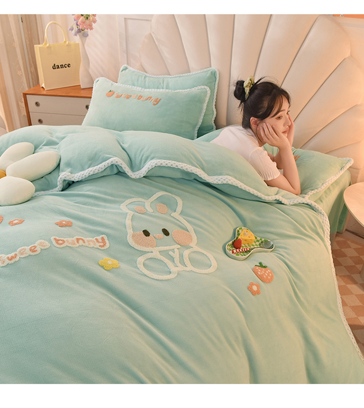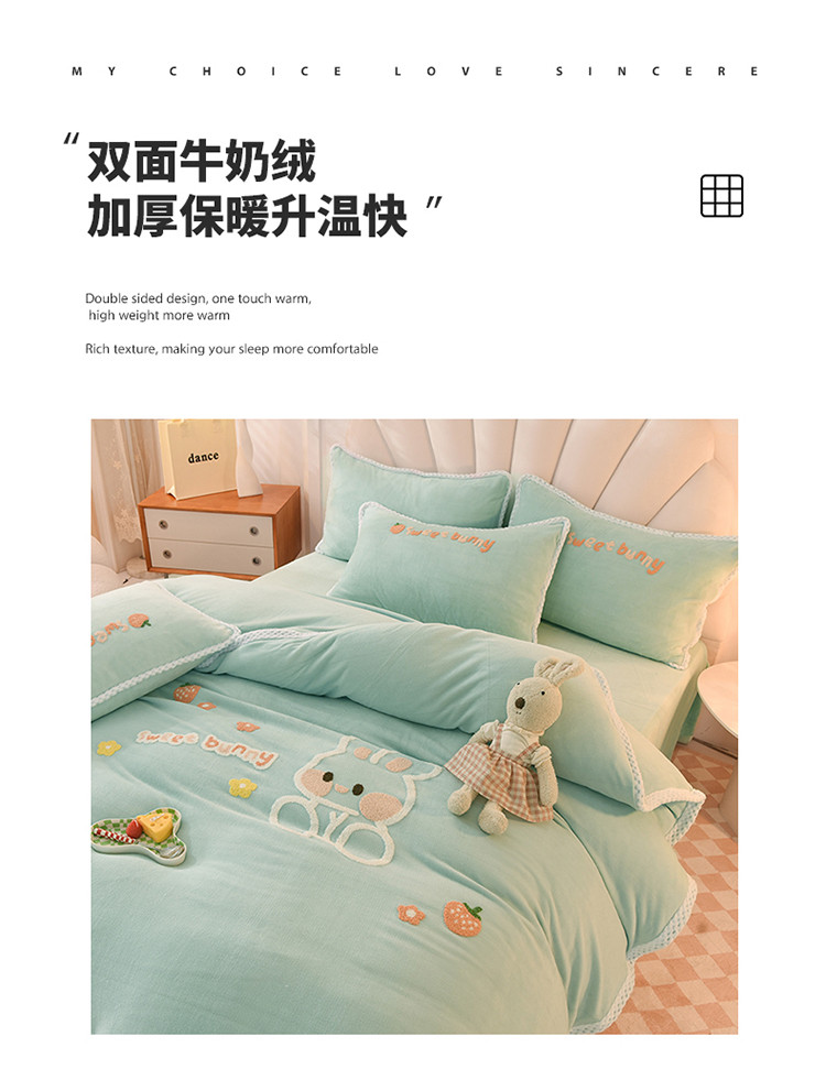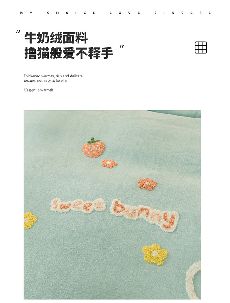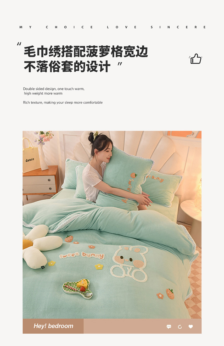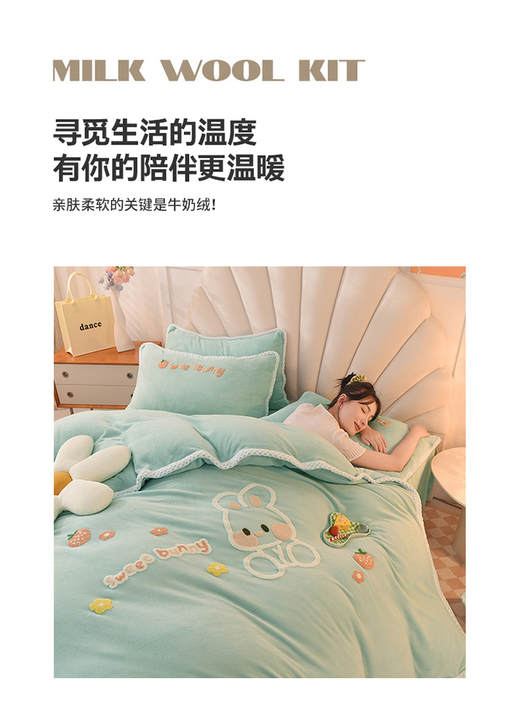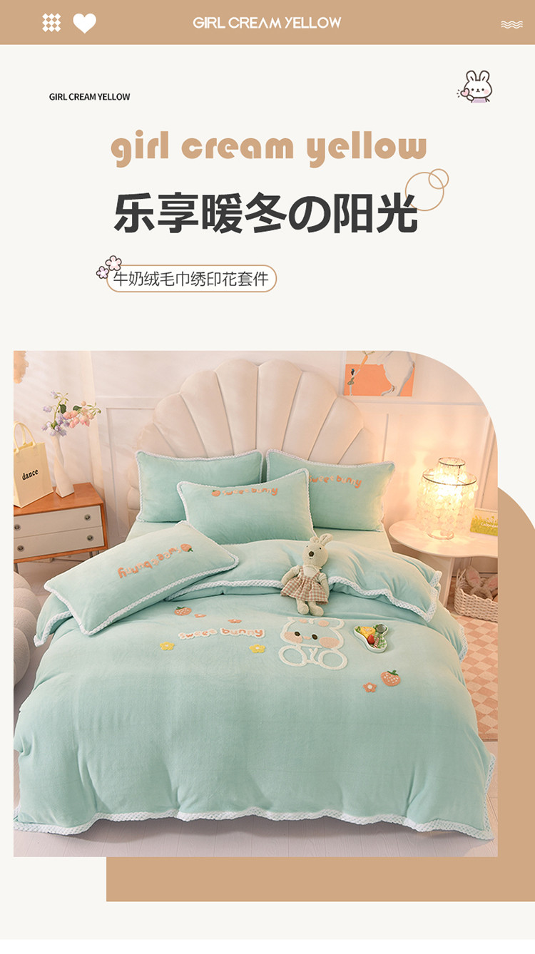 当前位置: 91家纺网 > 商品网购 > 床品套件 > 四件套 > 牛奶绒四件套 > 菲儿 2022新款毛巾绣牛奶绒四件套 甜蜜小兔-星冰绿