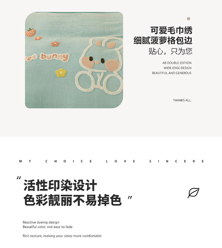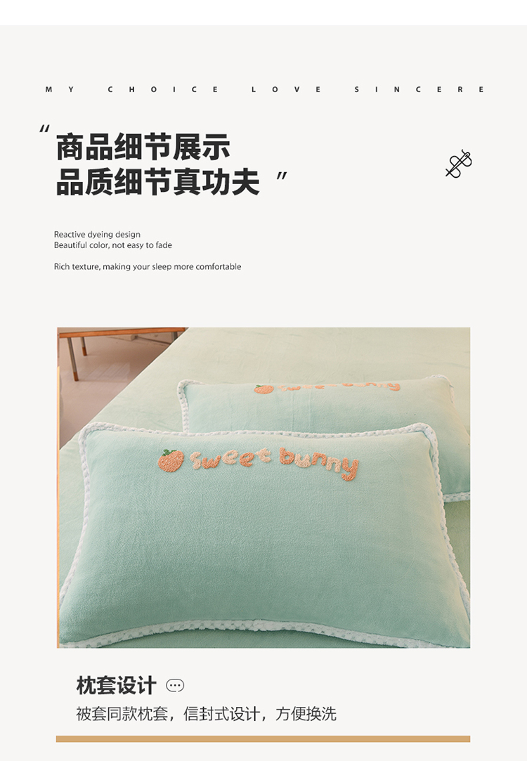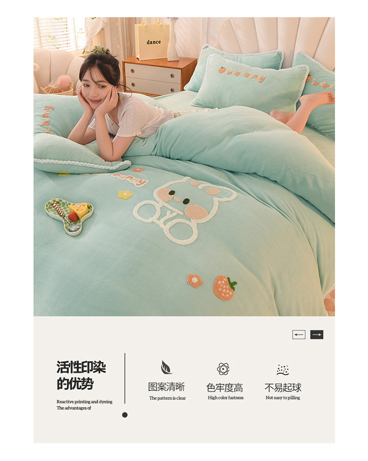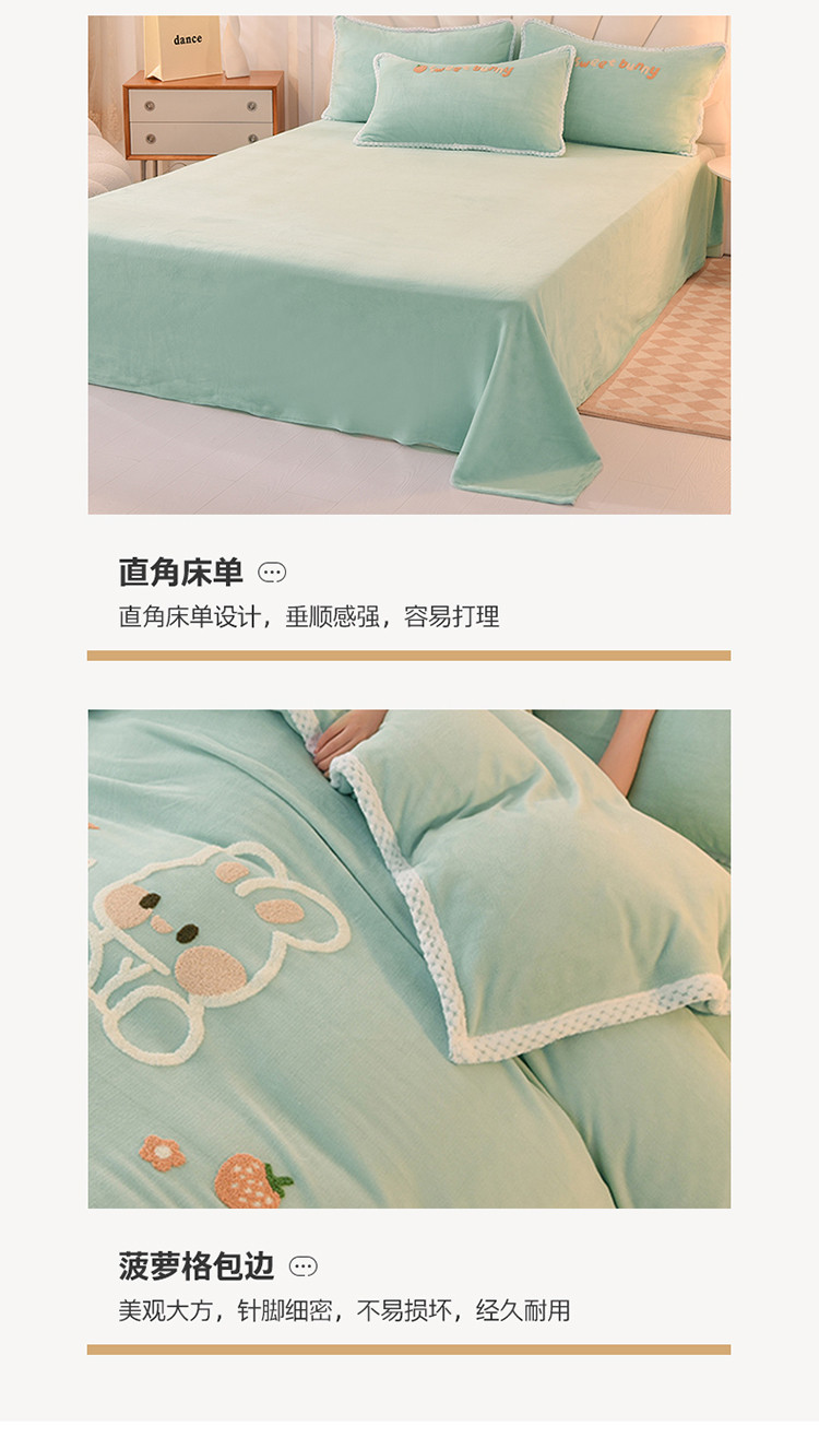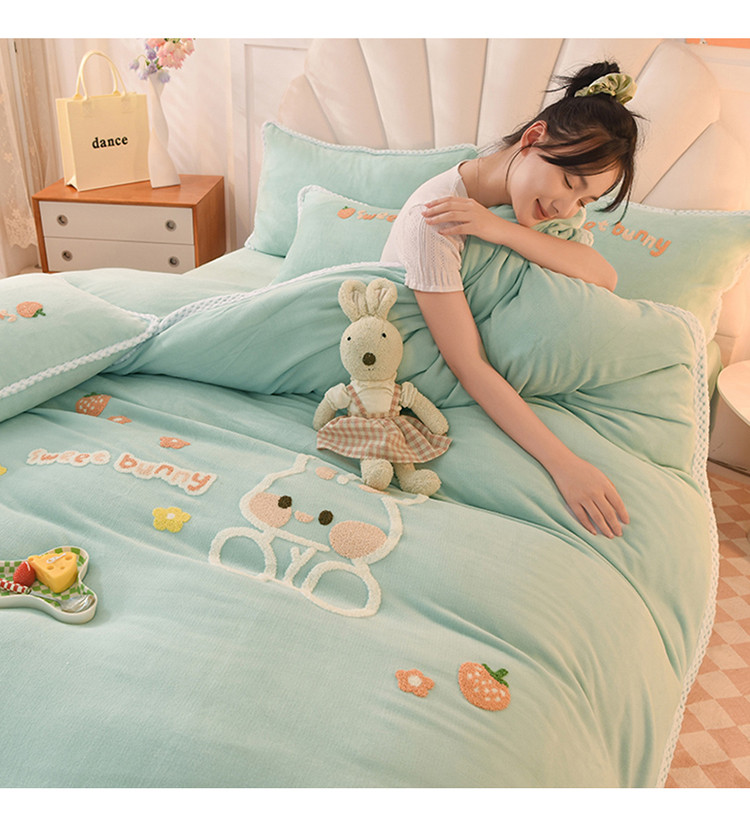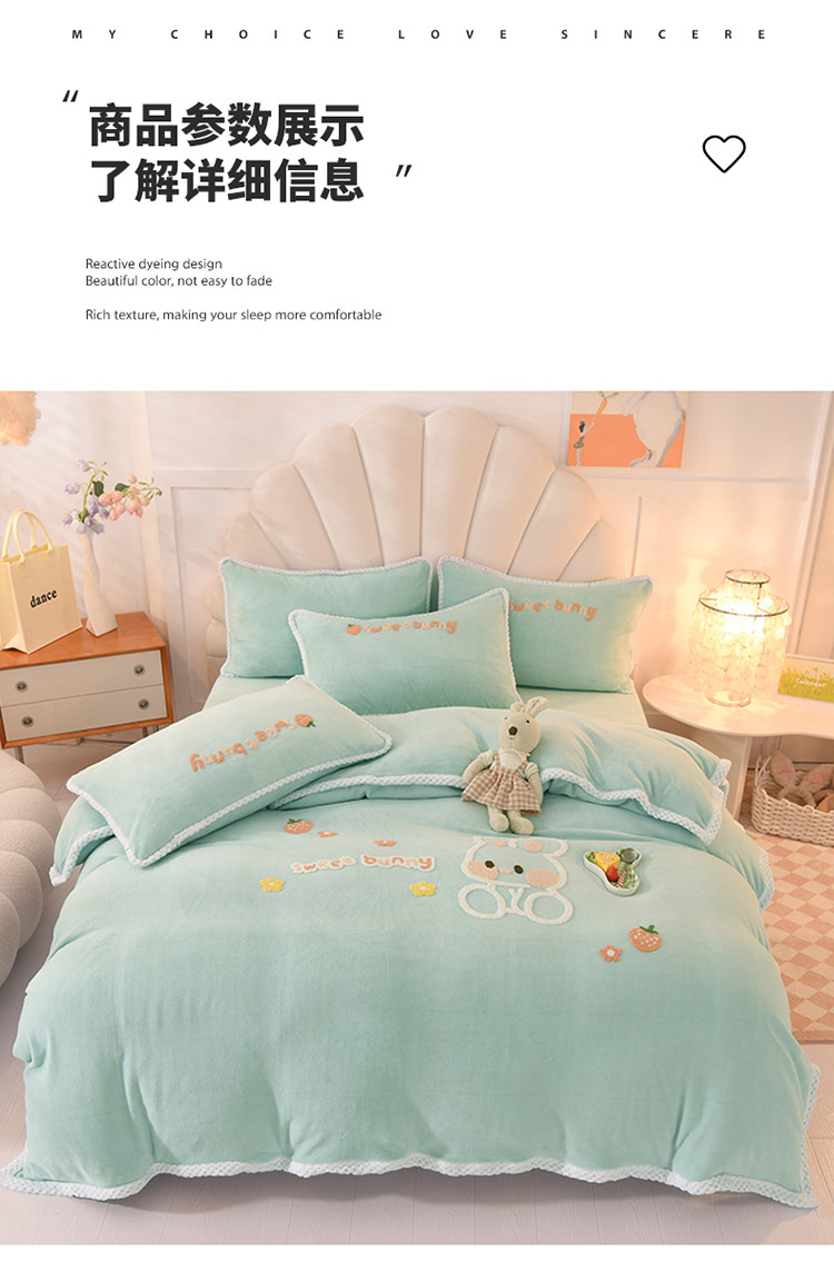 当前位置: 91家纺网 > 商品网购 > 床品套件 > 四件套 > 牛奶绒四件套 > 菲儿 2022新款毛巾绣牛奶绒四件套 甜蜜小兔-星冰绿