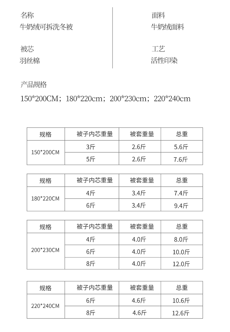 200*230cm12.2斤(被套4.2斤+内芯8斤)