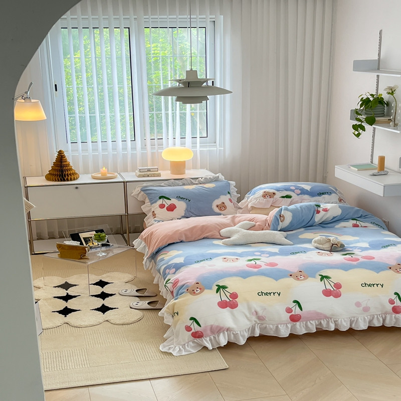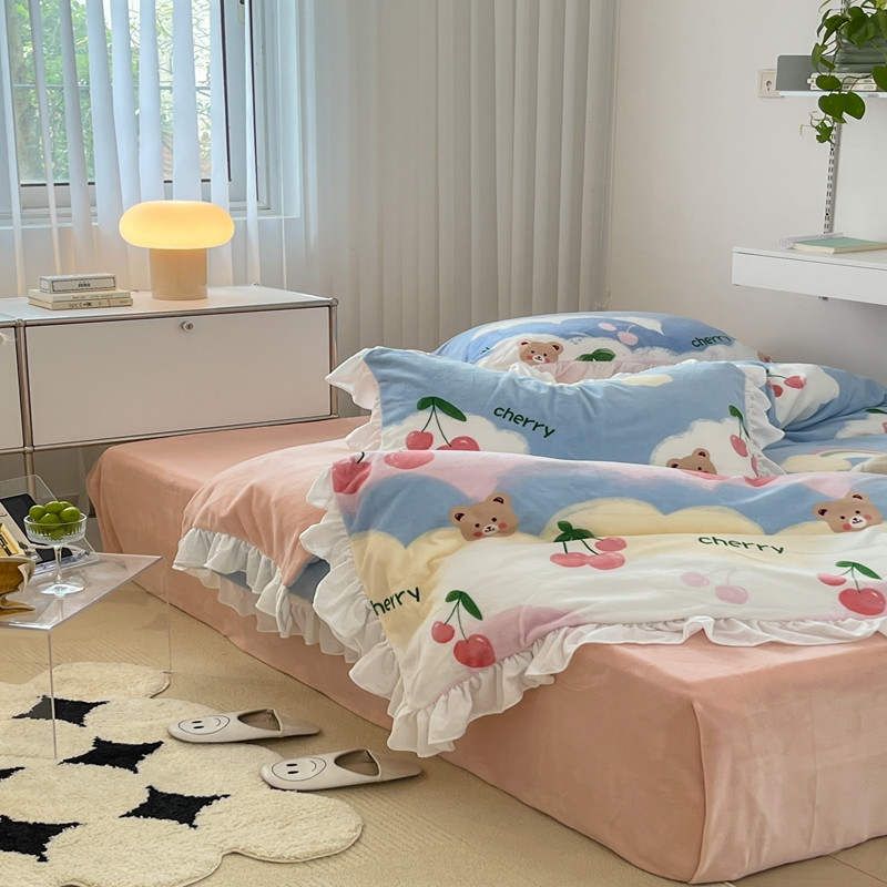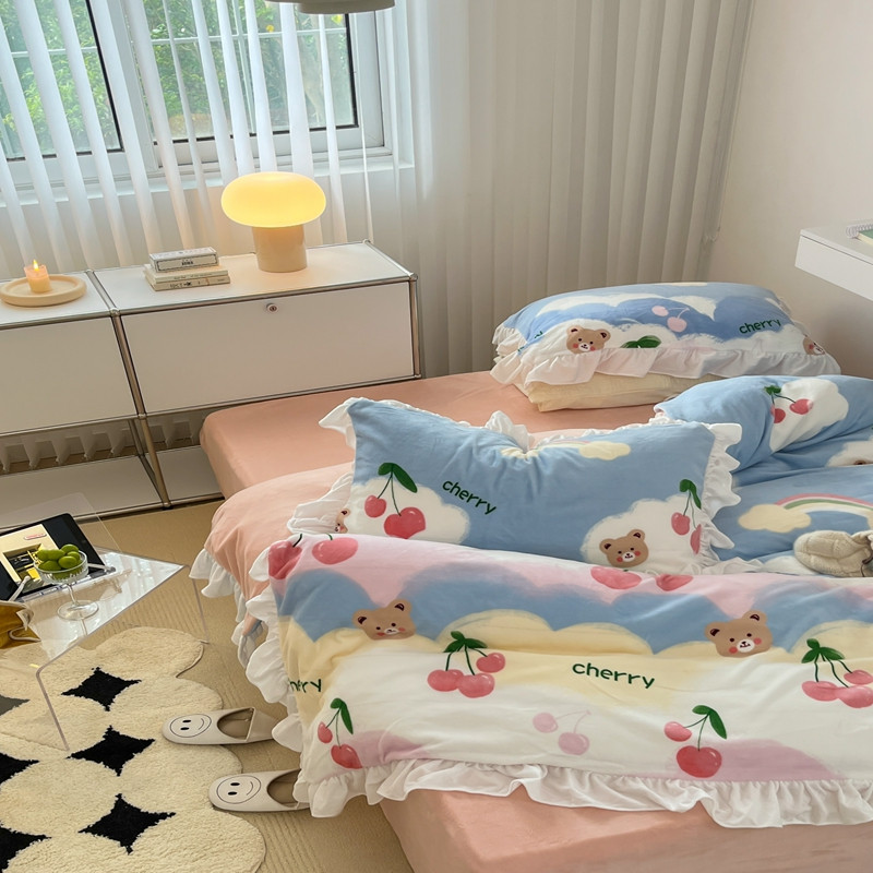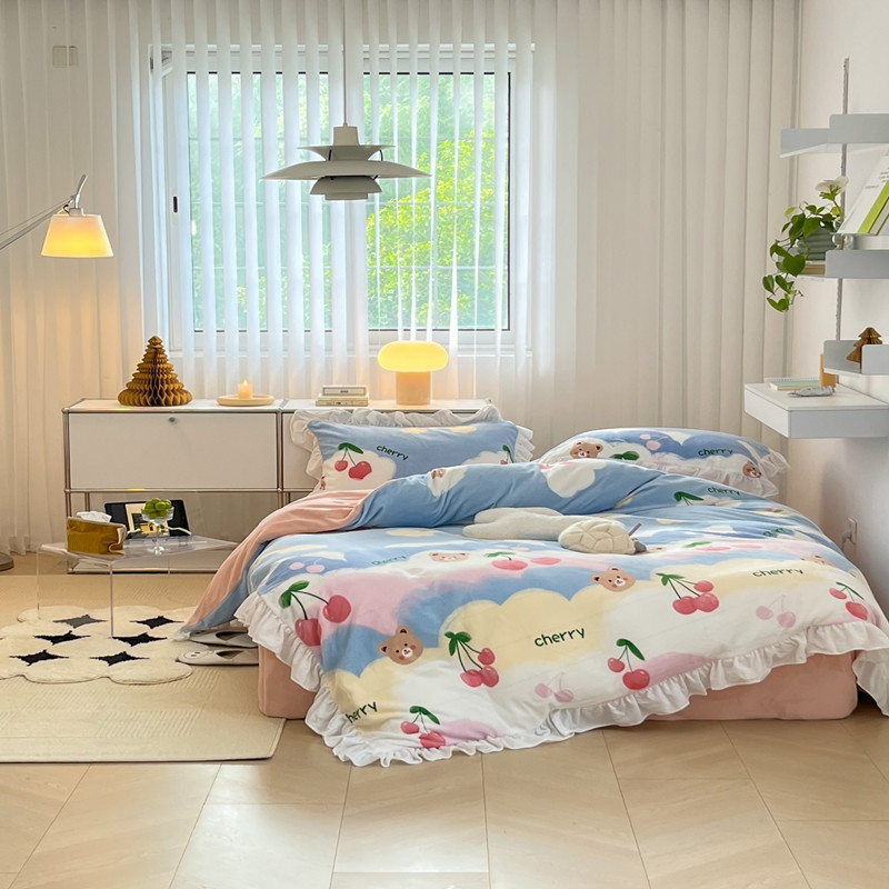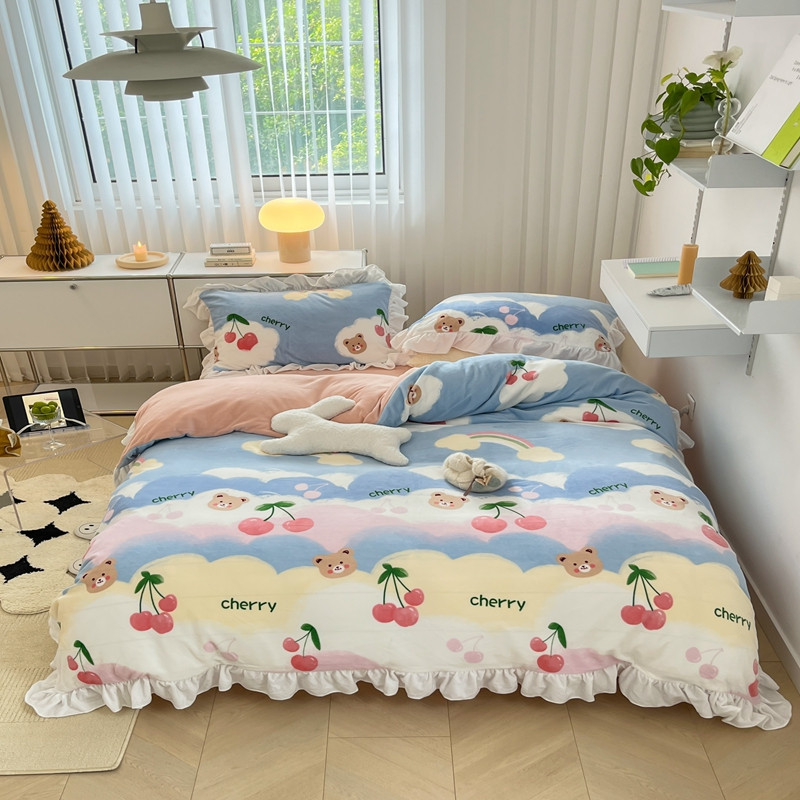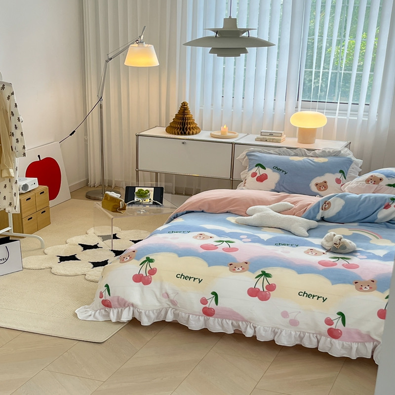 昔可 2022新款花边牛奶绒四件套 彩虹樱桃熊