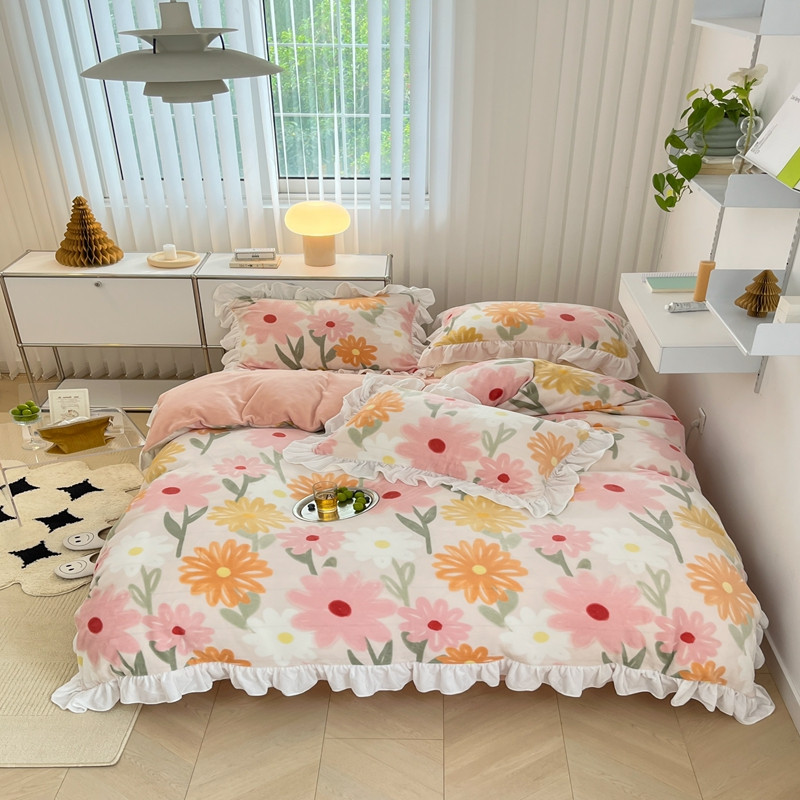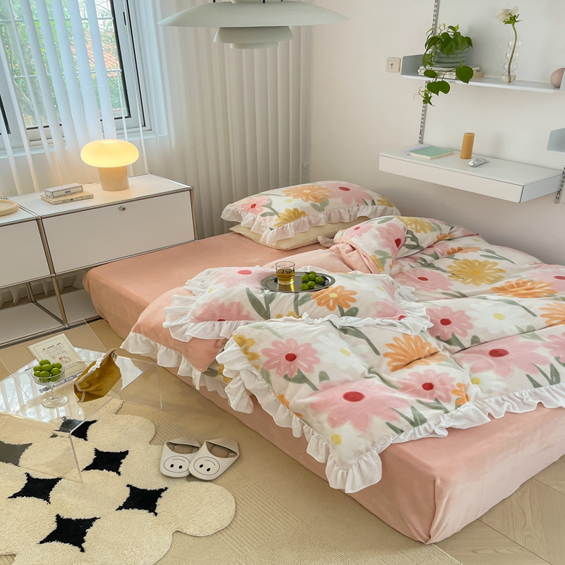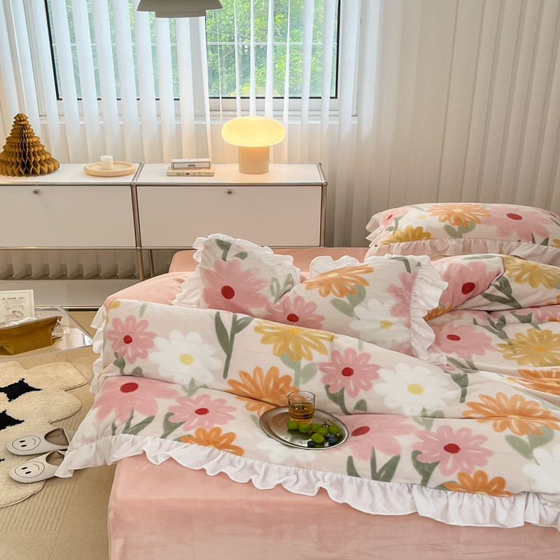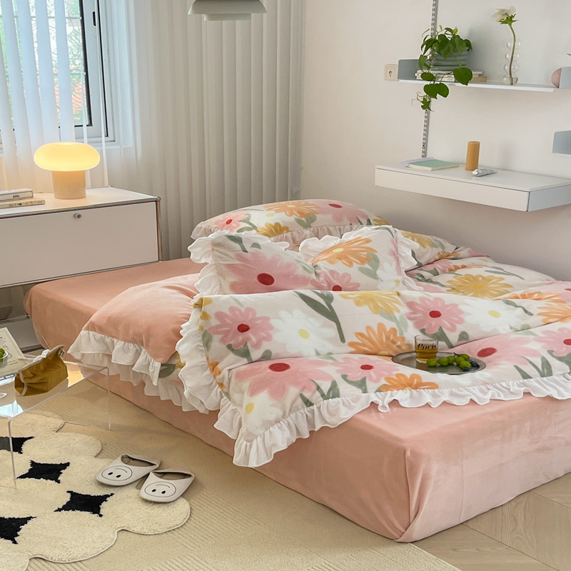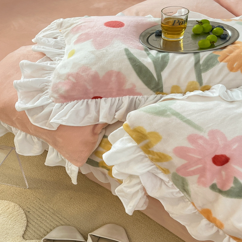 商品名称:昔可 2022新款花边牛奶绒四件套 油画粉花