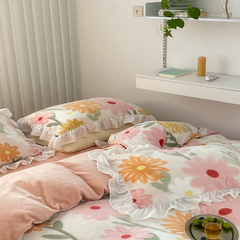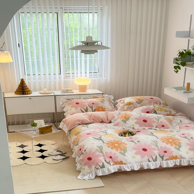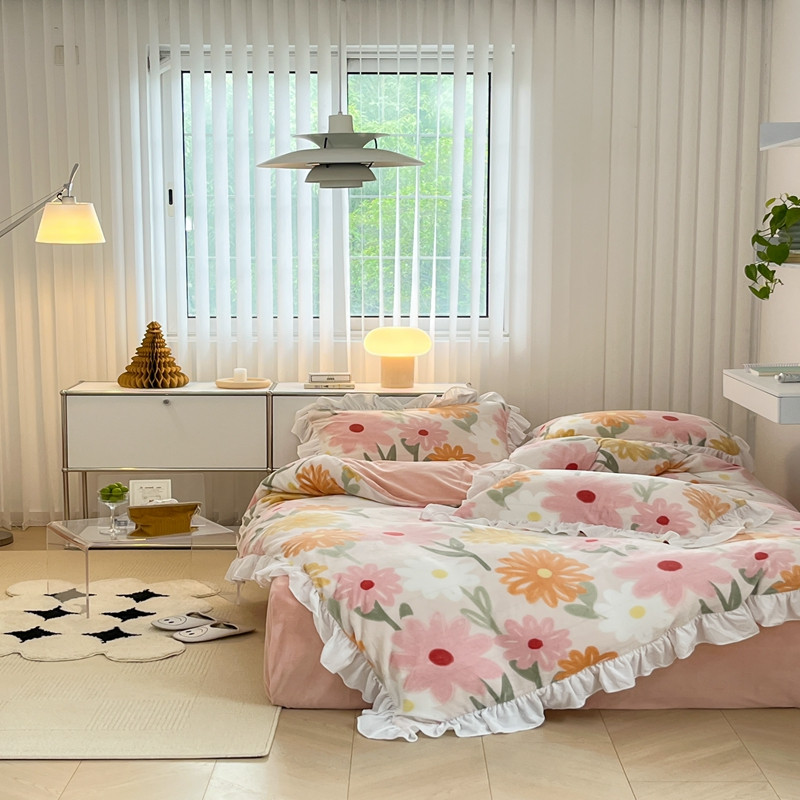 昔可 2022新款花边牛奶绒四件套 油画粉花