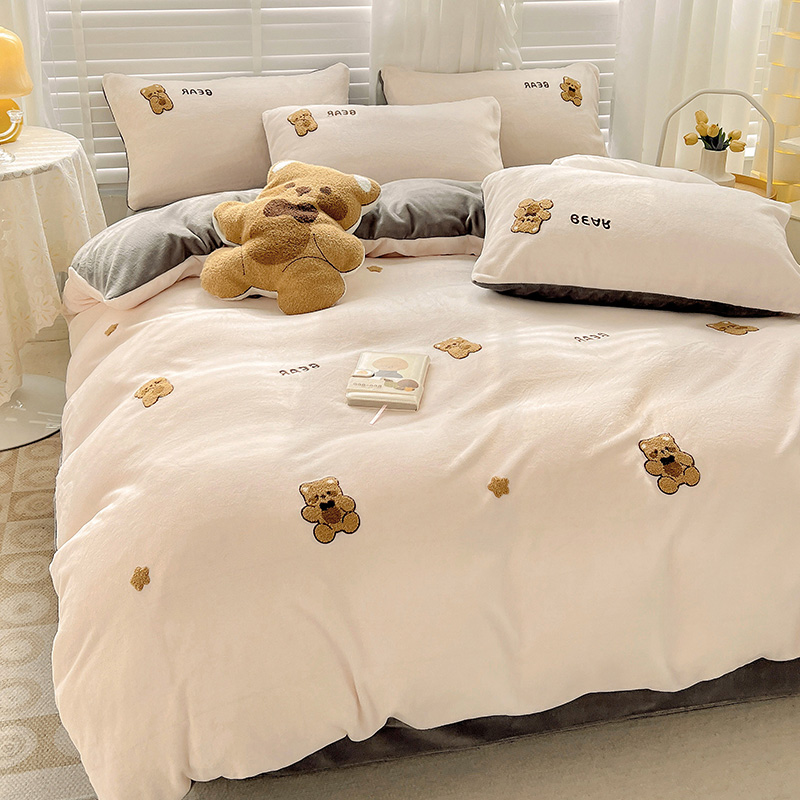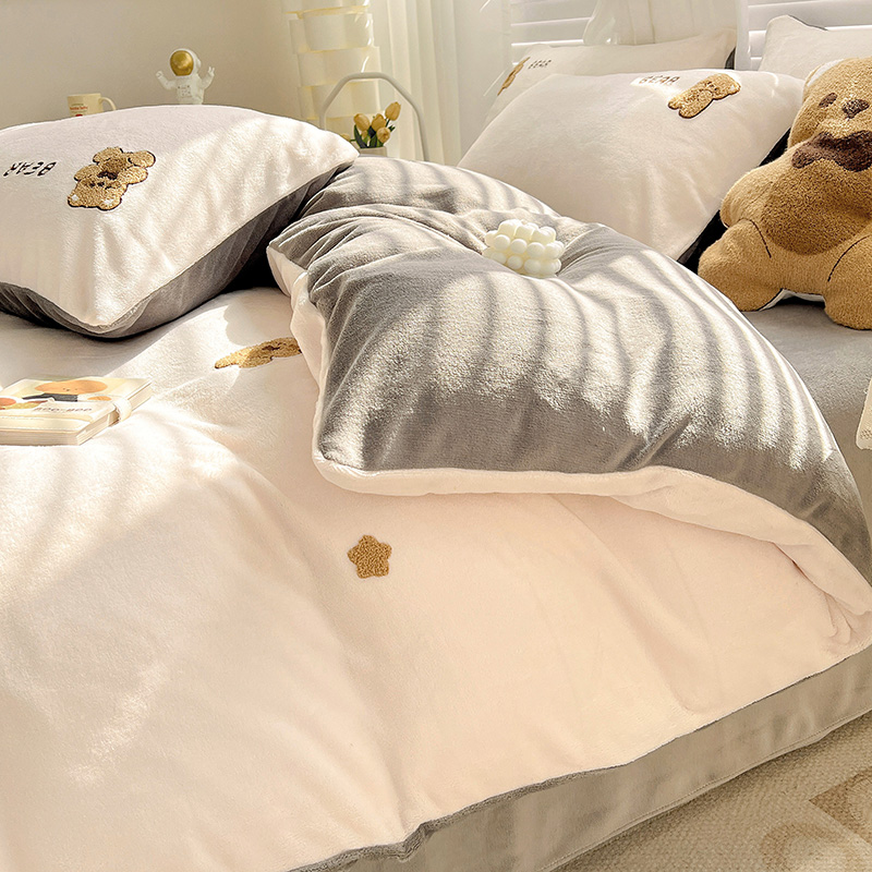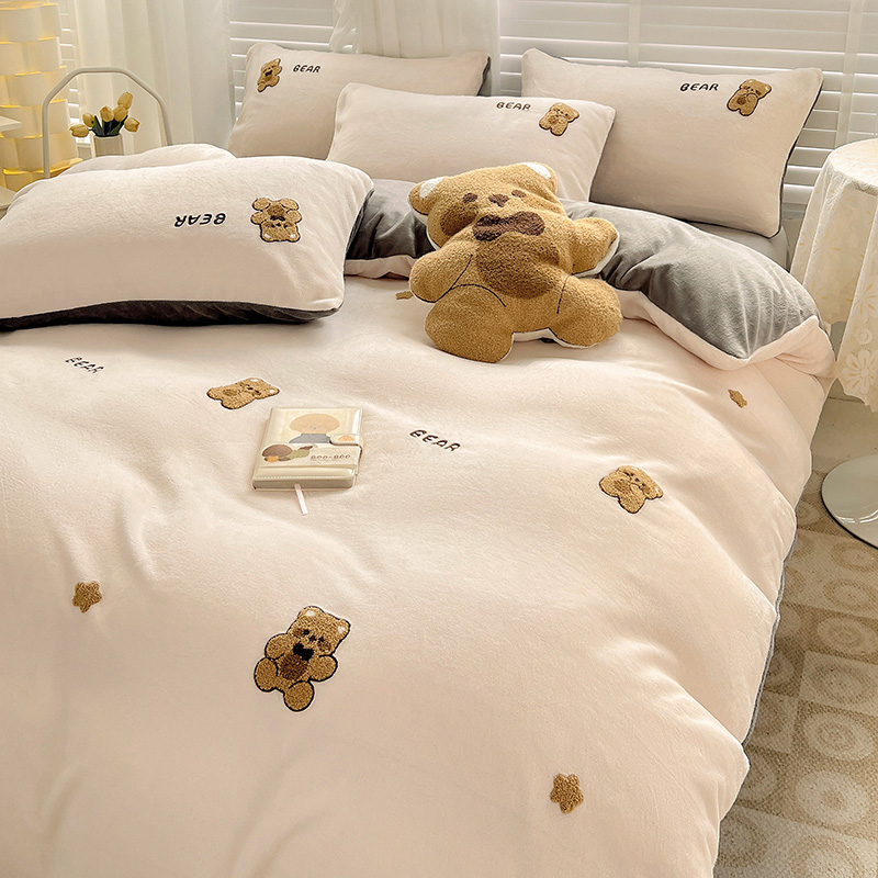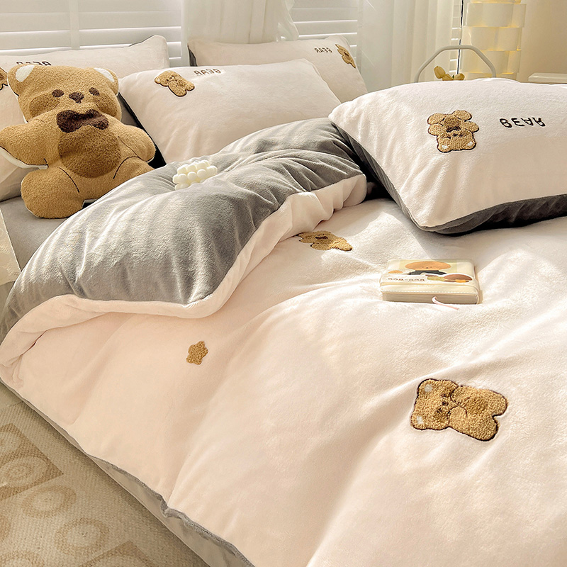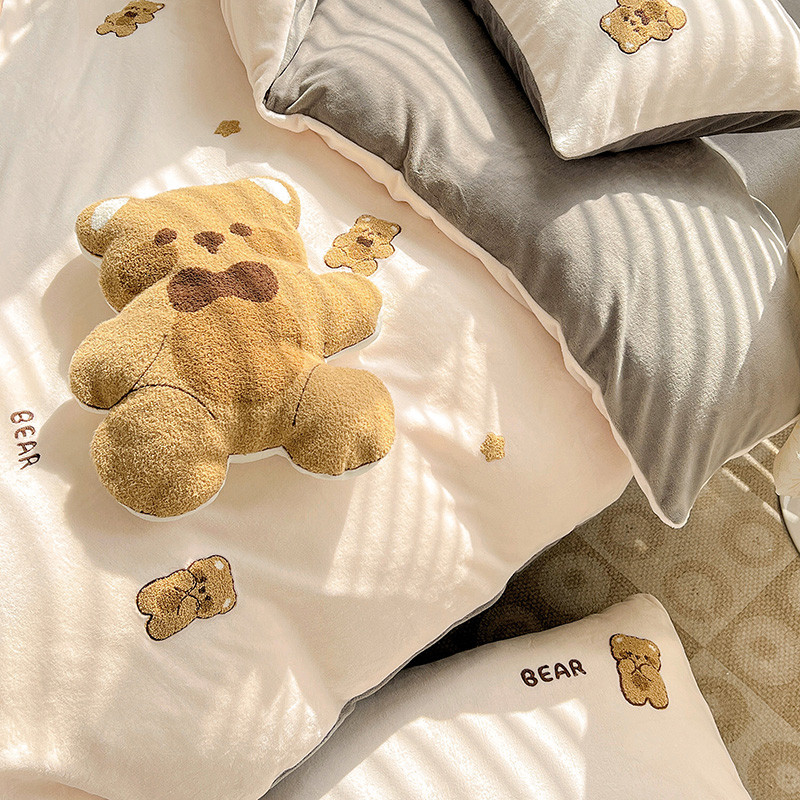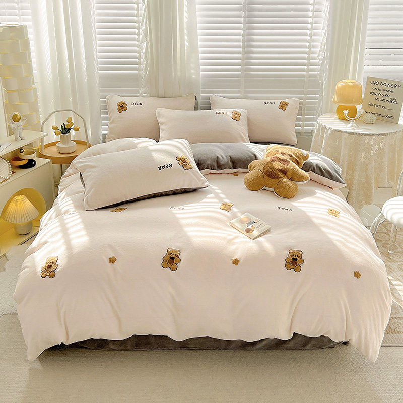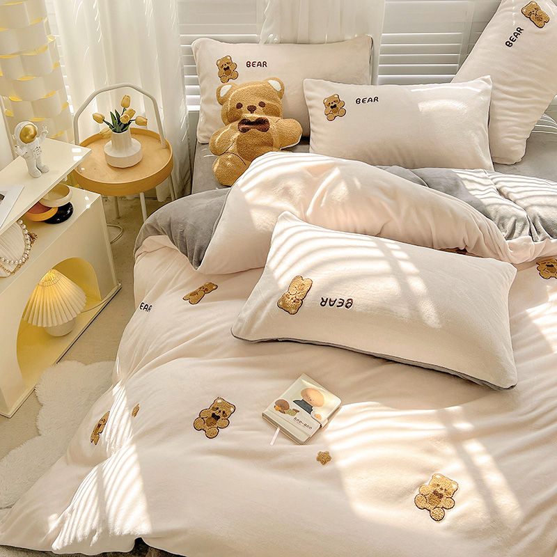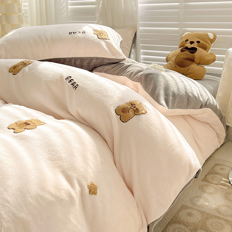 寐居2022新款毛巾绣牛奶绒单被套 萌萌熊-米白