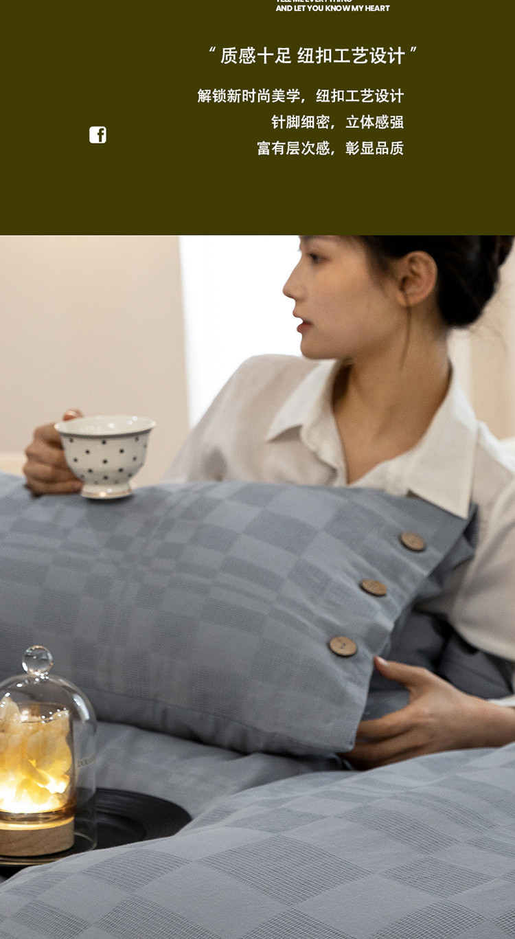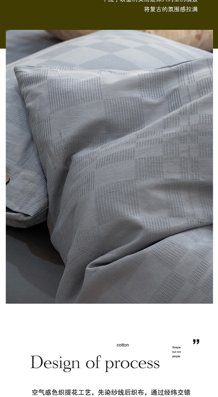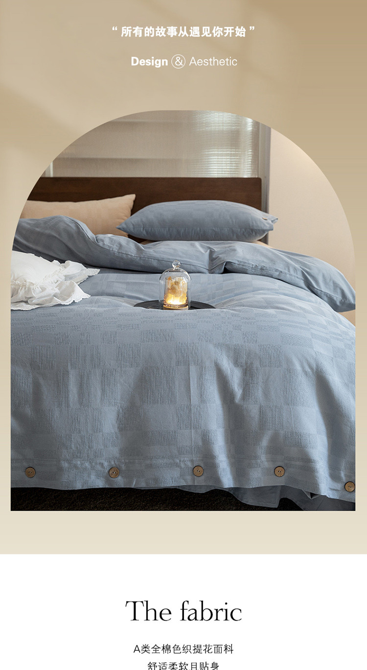 商品名称:棉邦 2023新款40支华夫格大提花纽扣款四件套 蓝灰