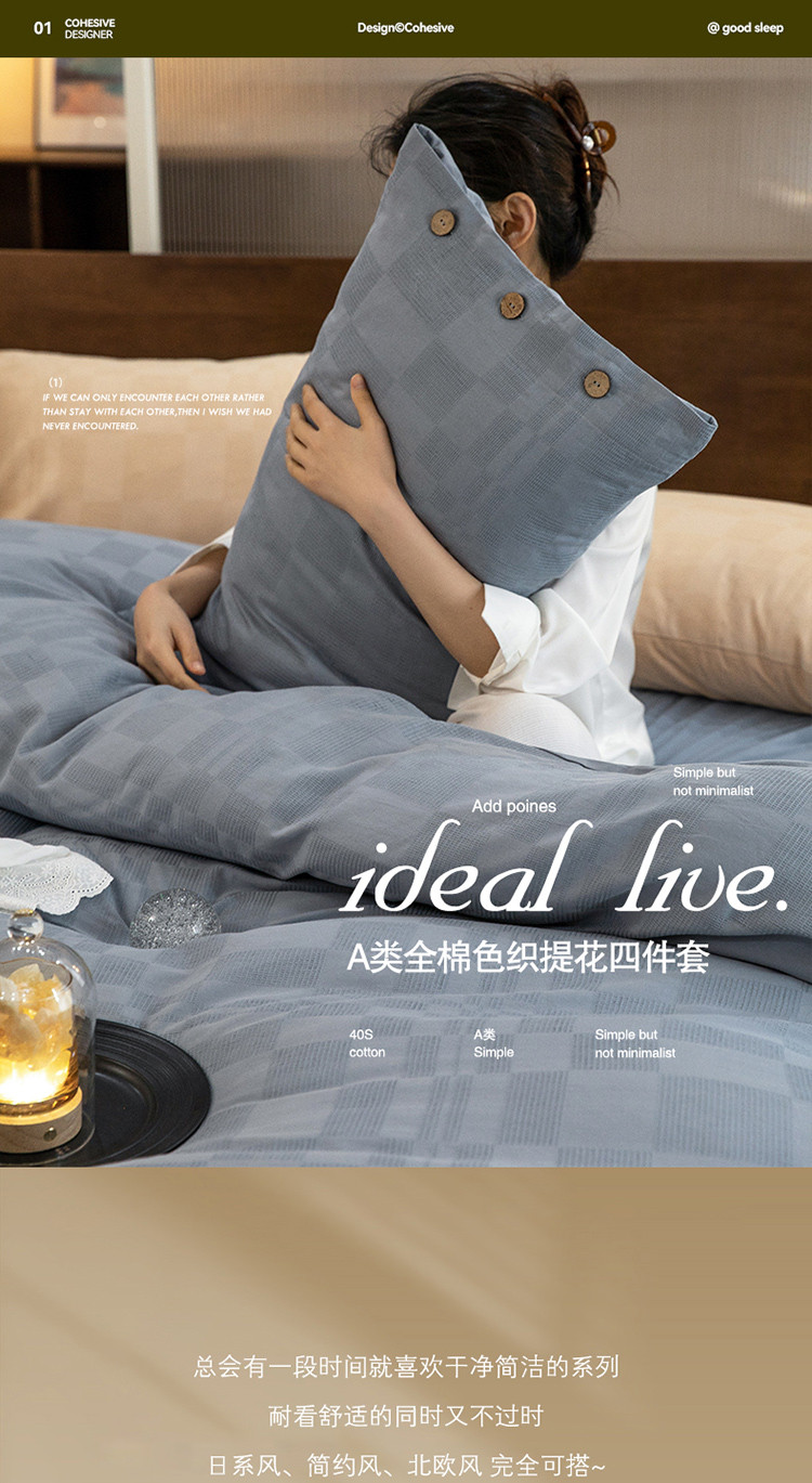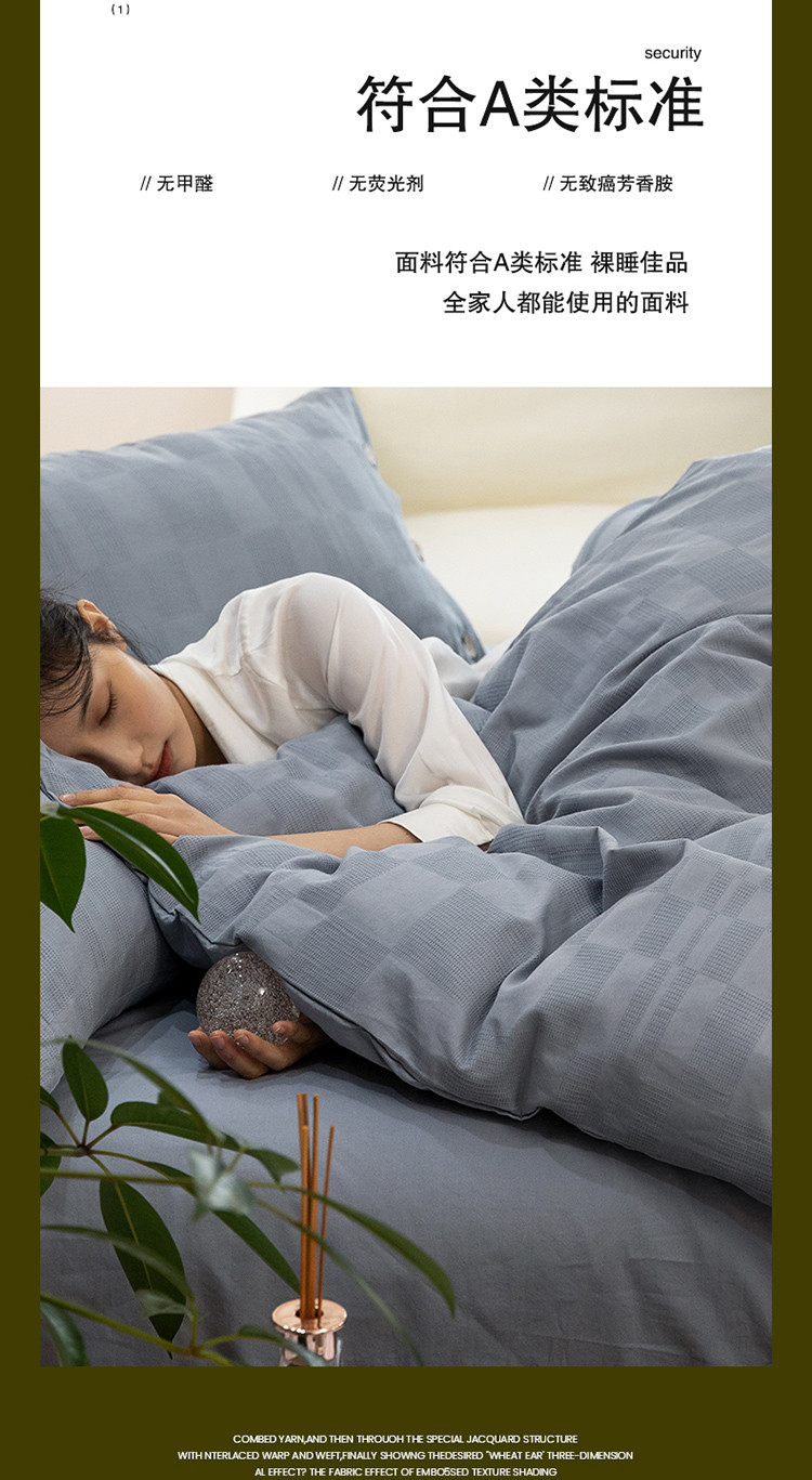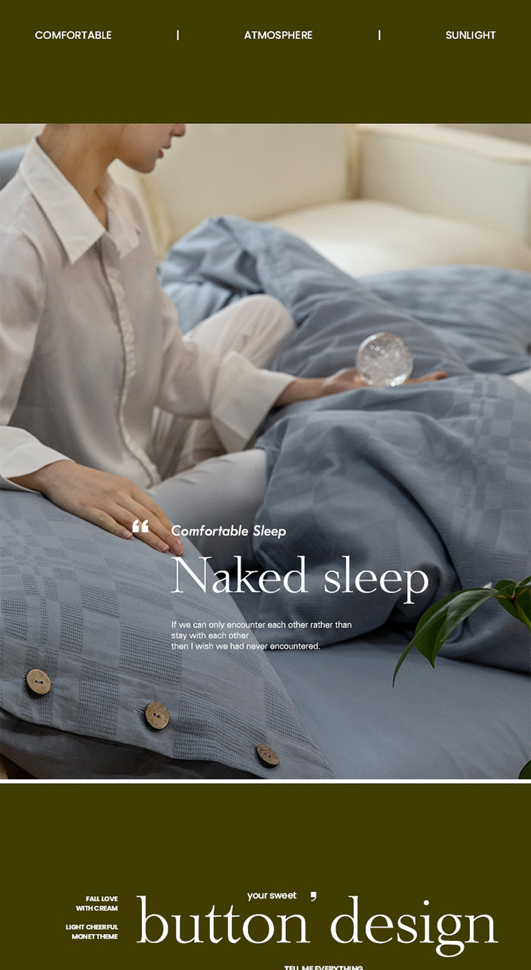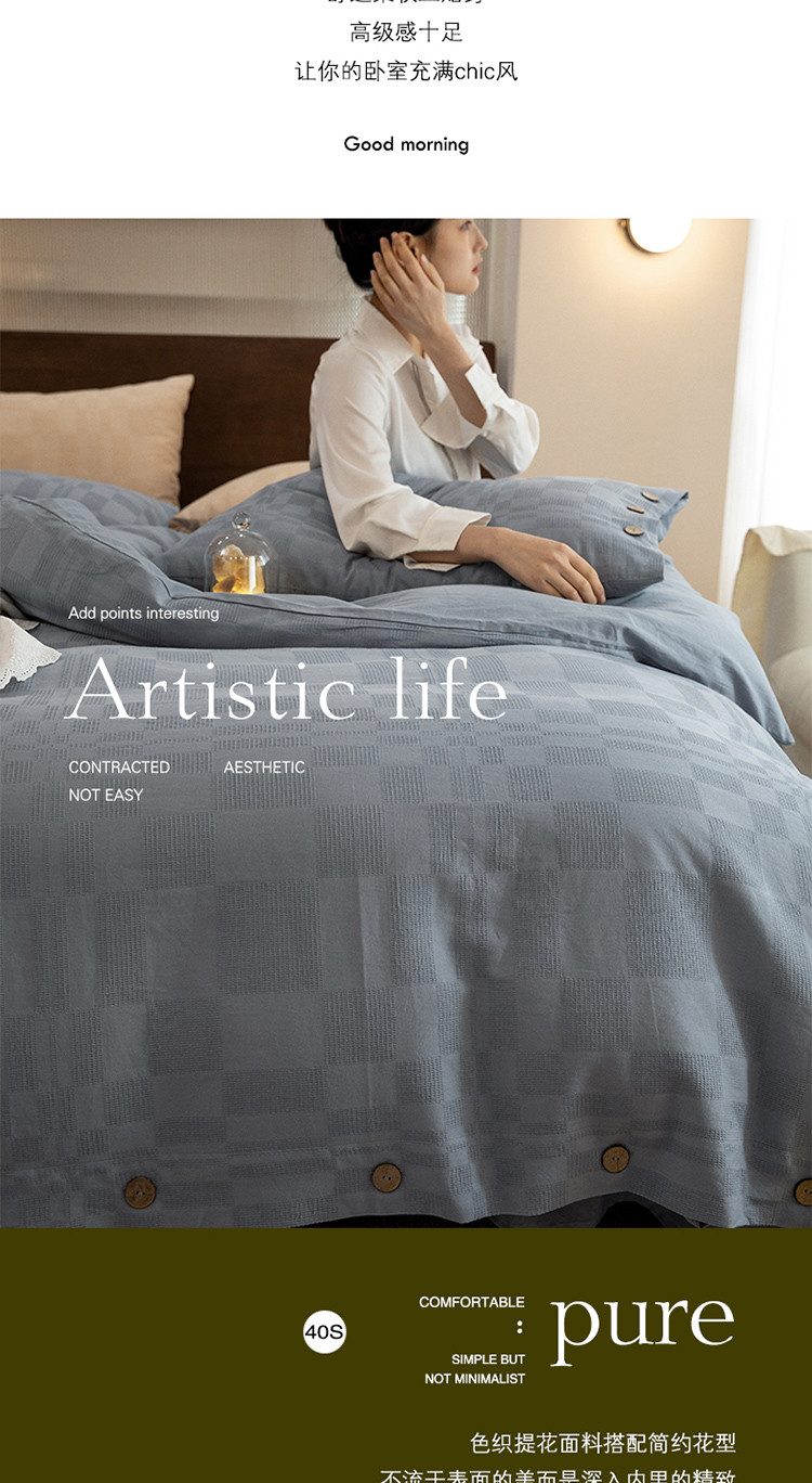 商品名称:棉邦 2023新款40支华夫格大提花纽扣款四件套 蓝灰