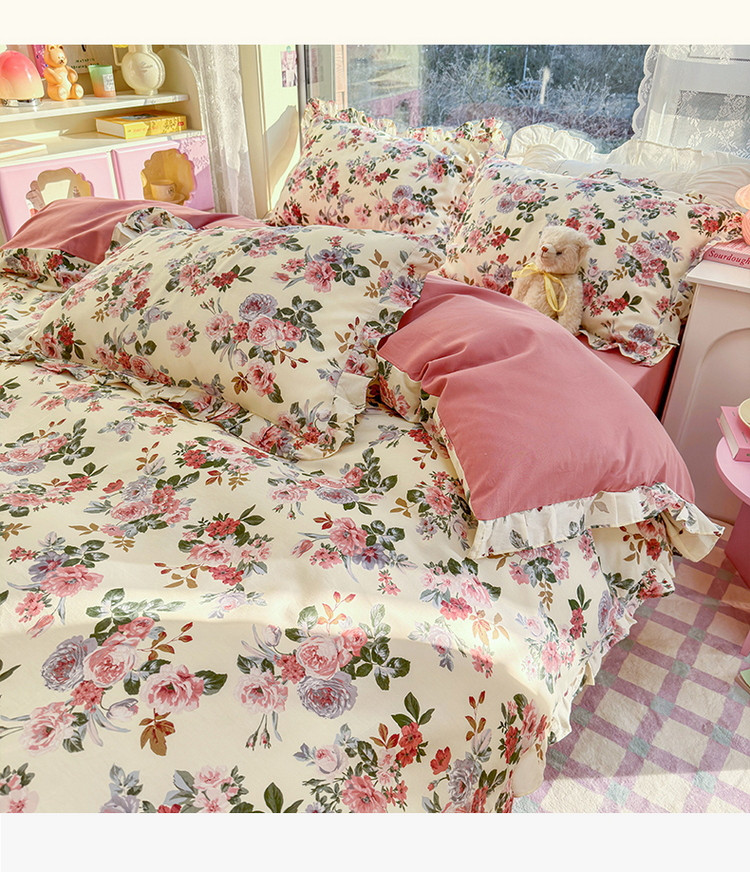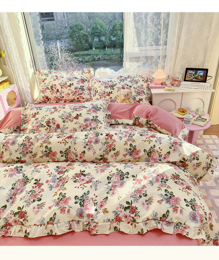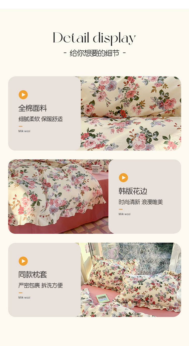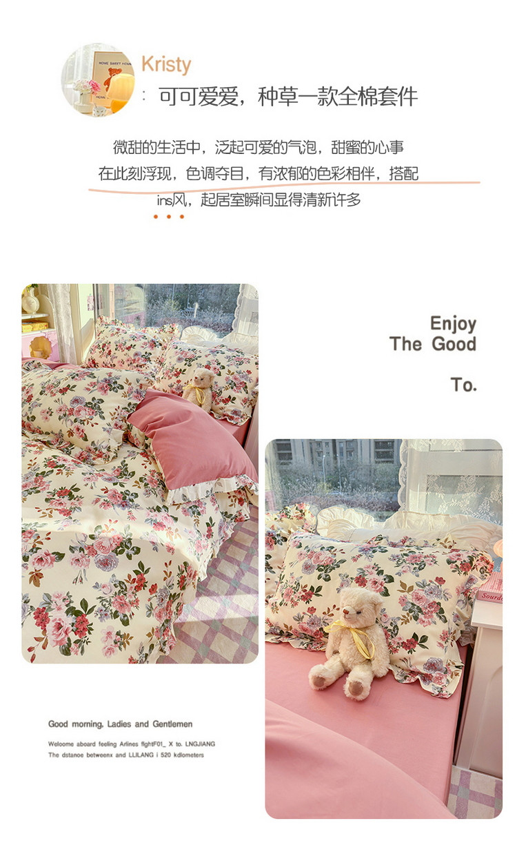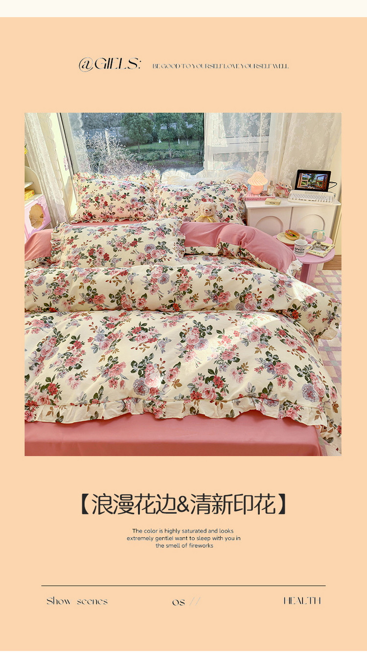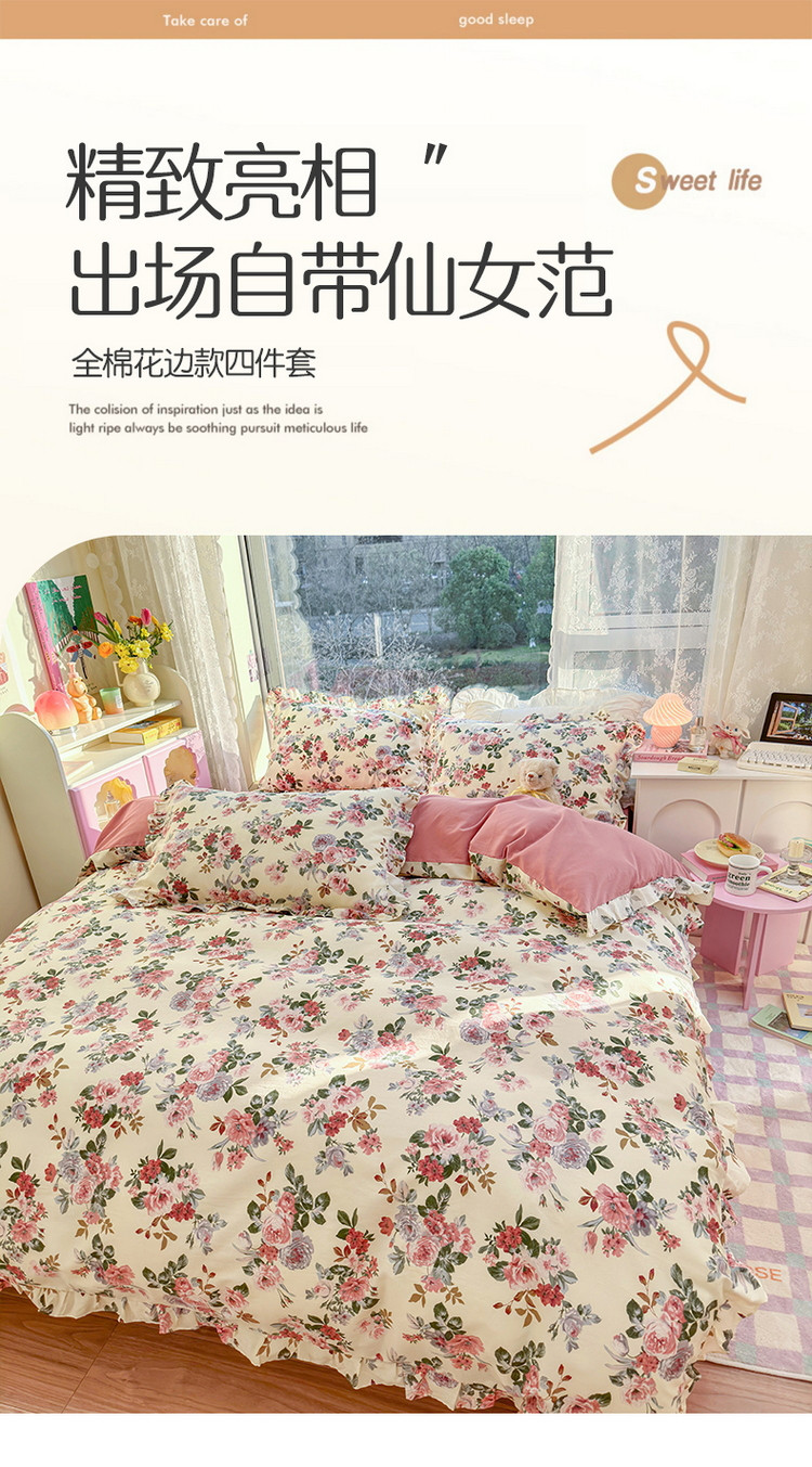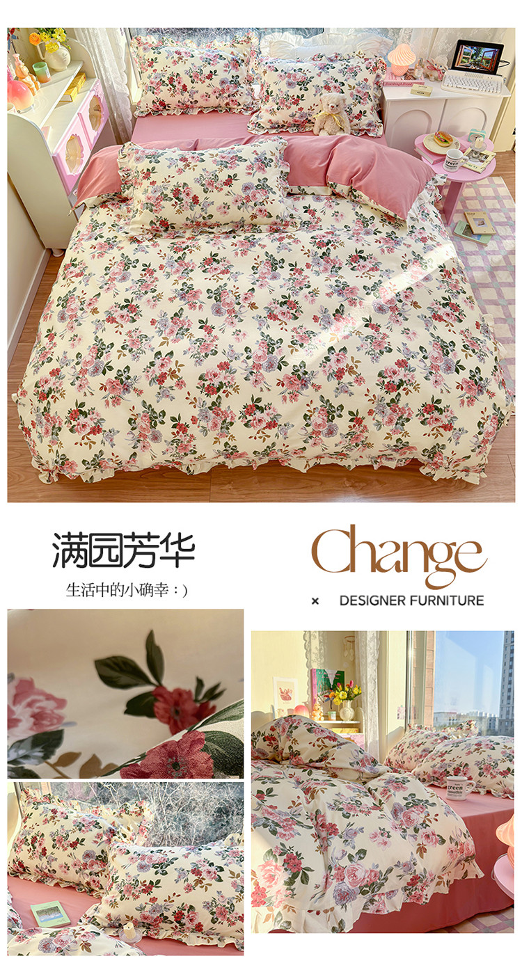 商品名称:蓝邻 2023新款全棉印花韩版花边款四件套 满园芳华