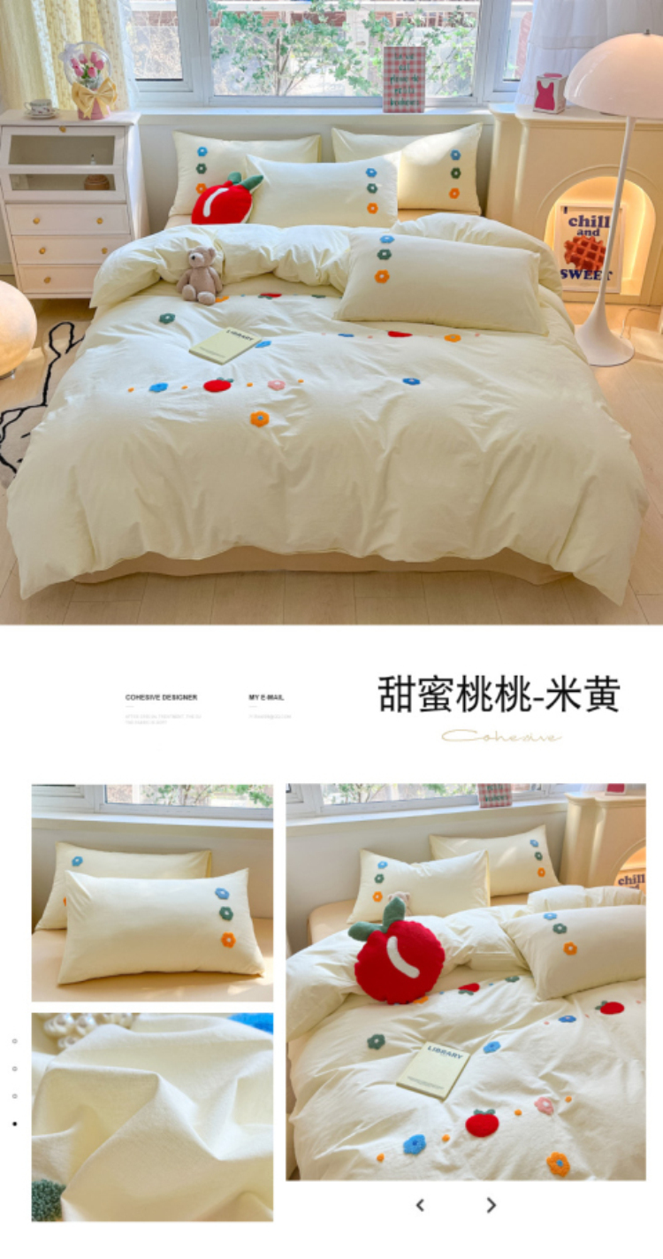 商品名称:寐居2023新款绣花款水洗棉四件套 甜蜜桃桃-米黄