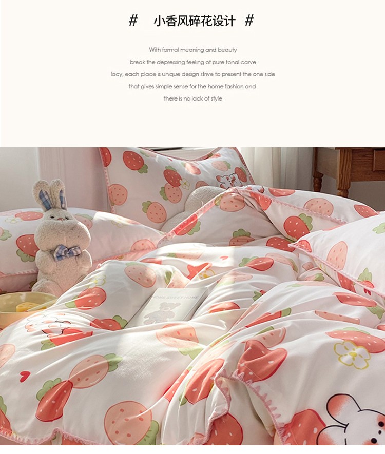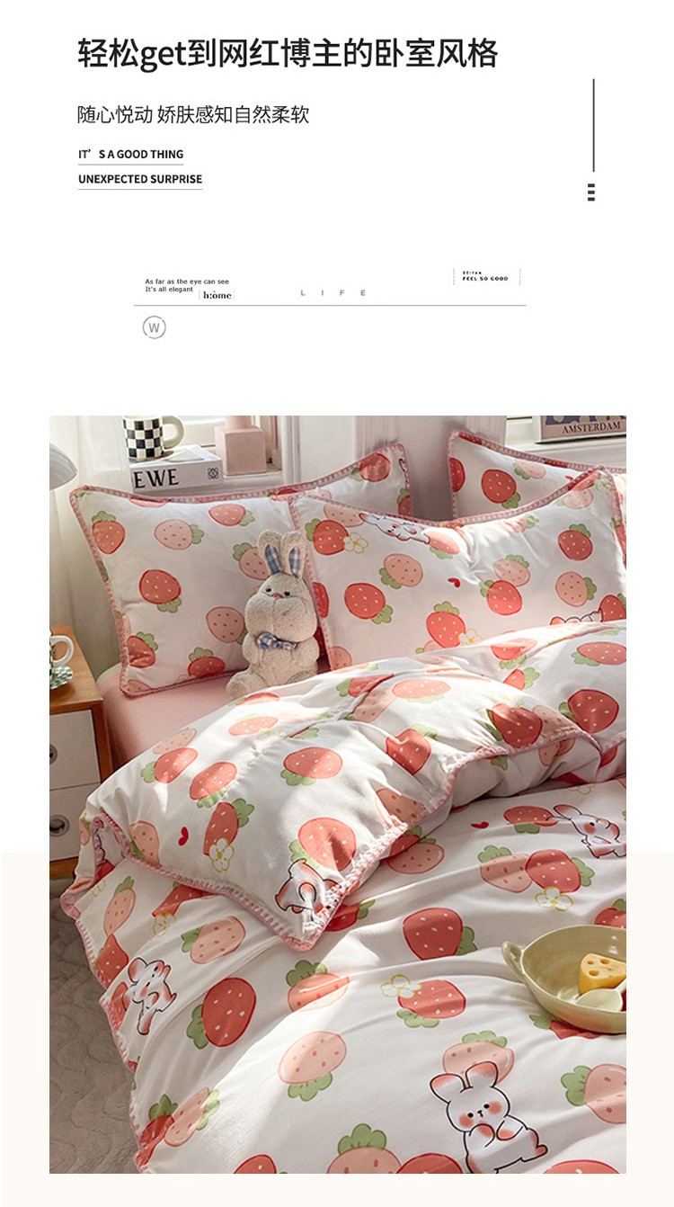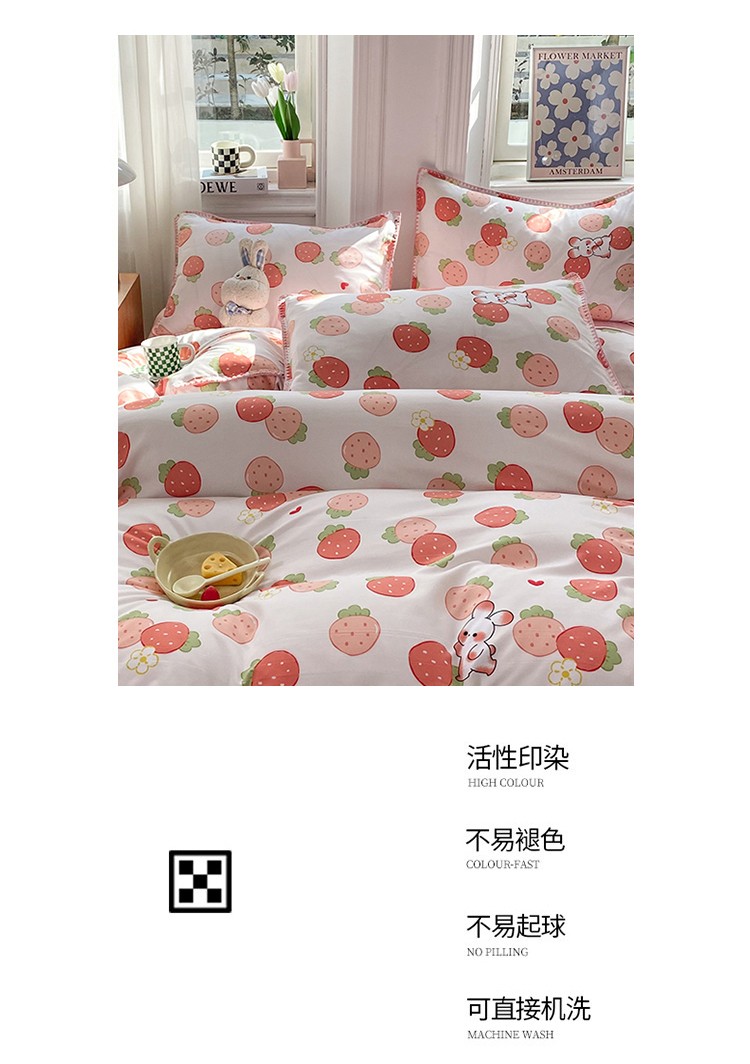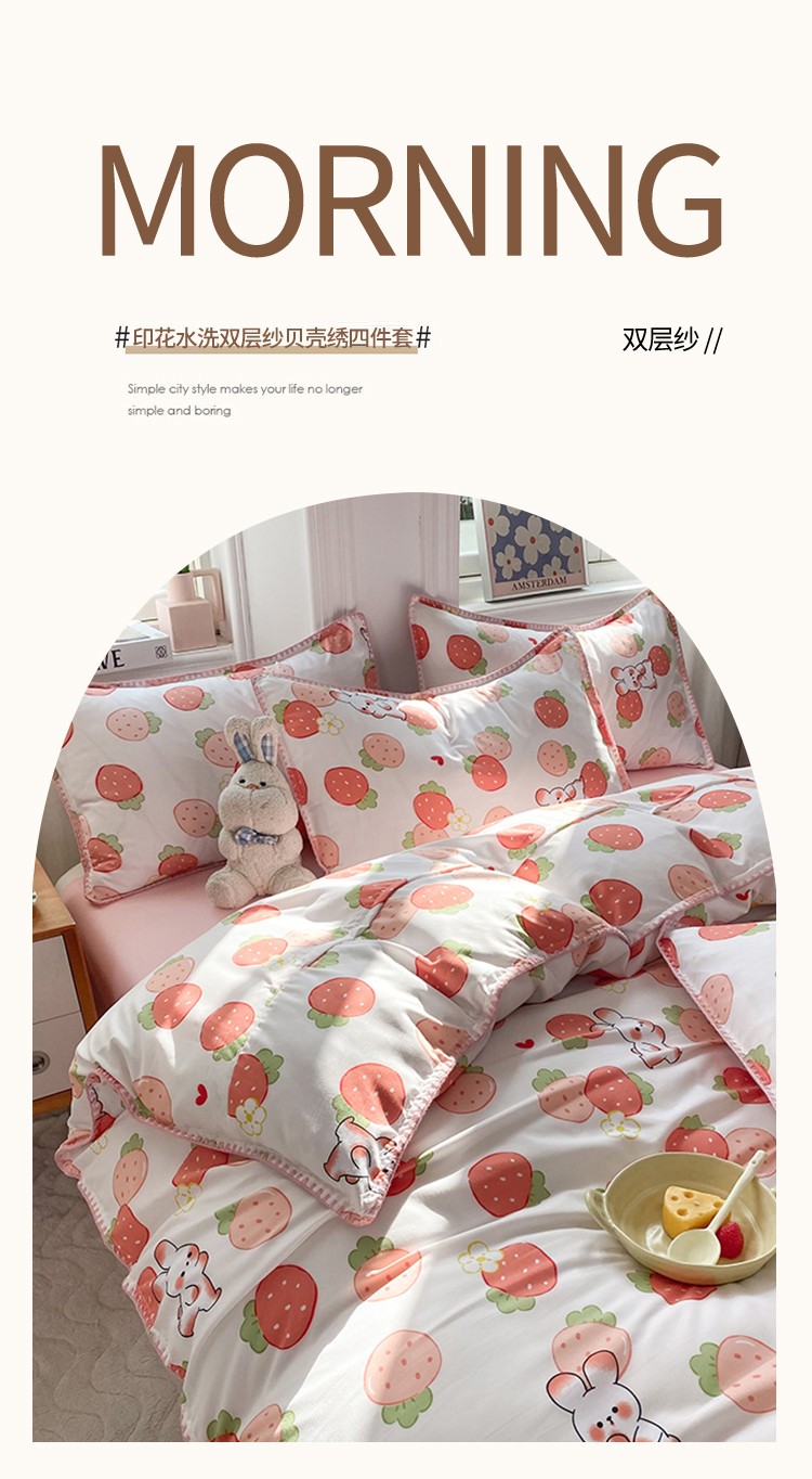 商品名称:妖妖家纺 2023印花水洗双层纱贝克绣四件套 草莓兔
