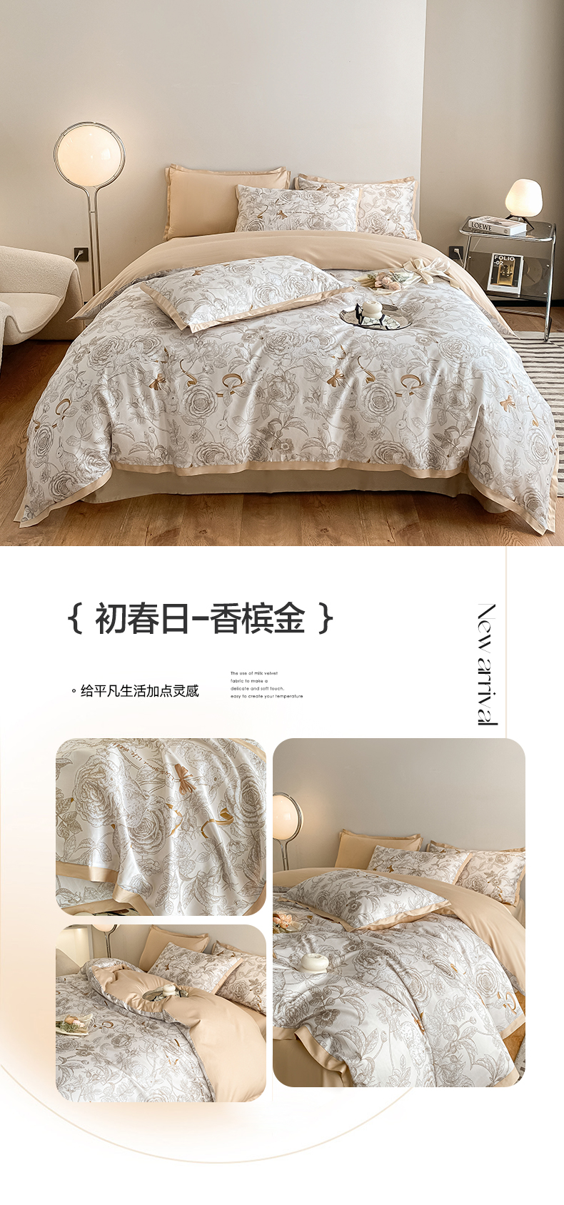 商品名称:(总)秀色 2025新款50支贡缎长绒棉床上四件套数码印花被套轻奢高级感床品 初春日-香槟金