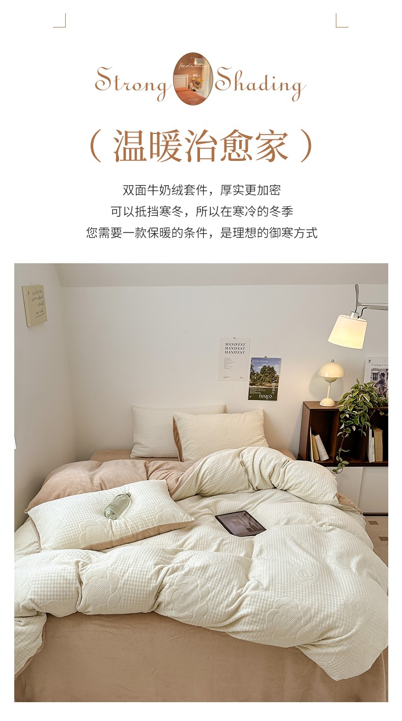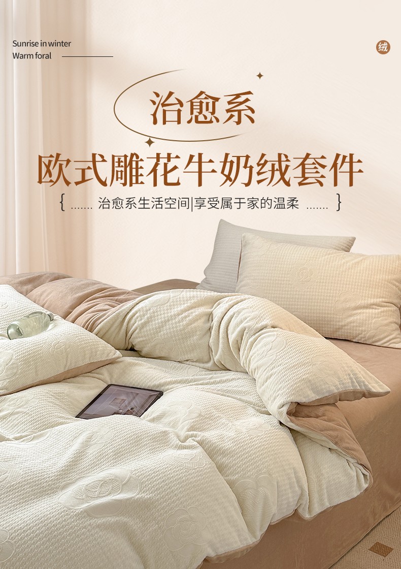 优彩 2023新款高克重烂花牛奶绒剪花立体雕花牛奶绒四件套 嘉伯丽-奶咖