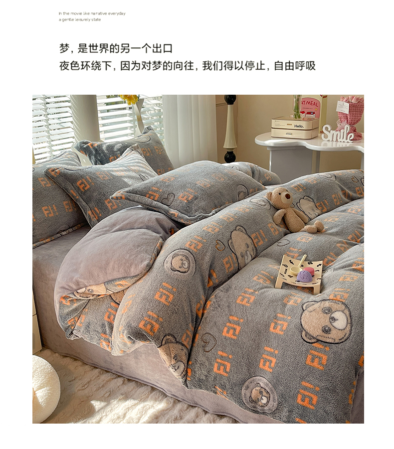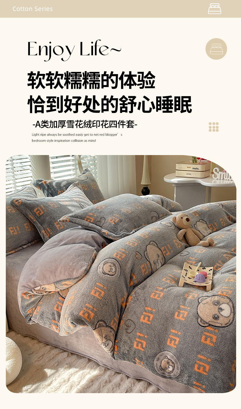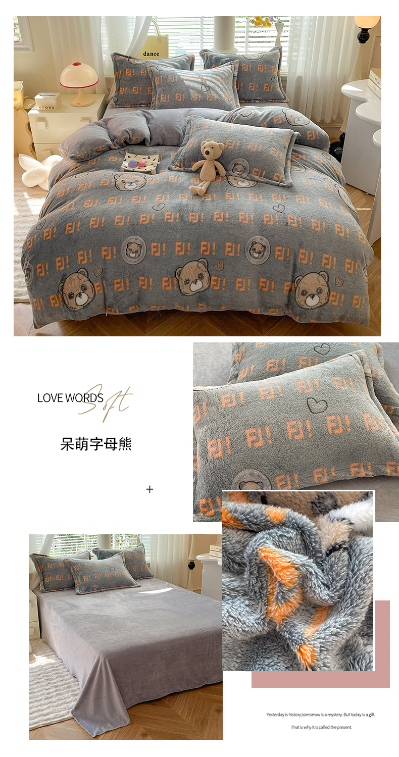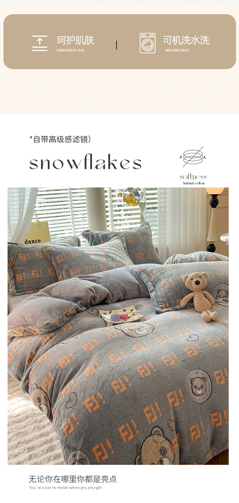 当前位置: 91家纺网 > 商品网购 > 床品套件 > 四件套 > 全棉普通四件套 > 妖妖家纺 2023新款妖妖雪花绒单品三四件套 呆萌字母熊