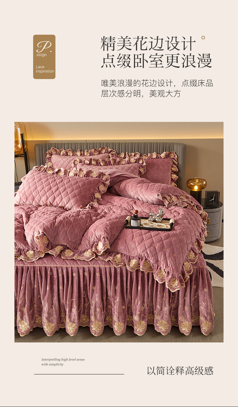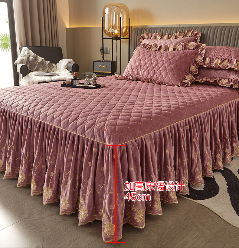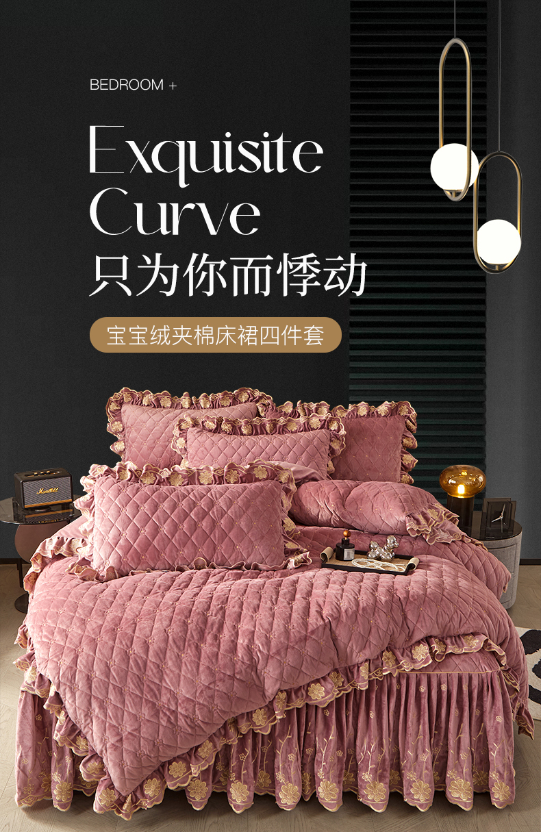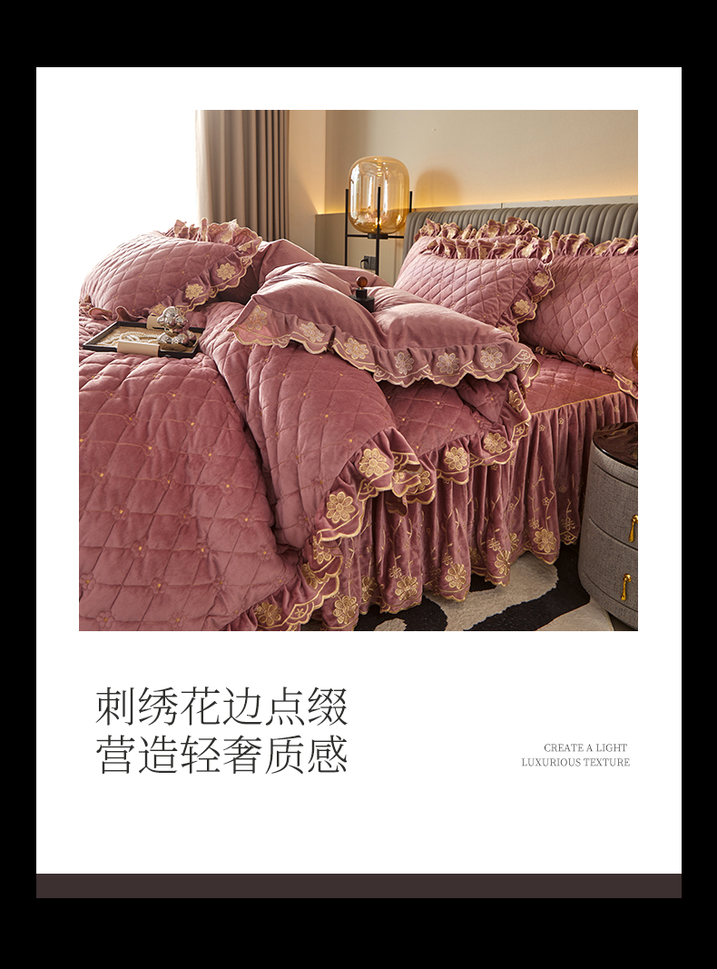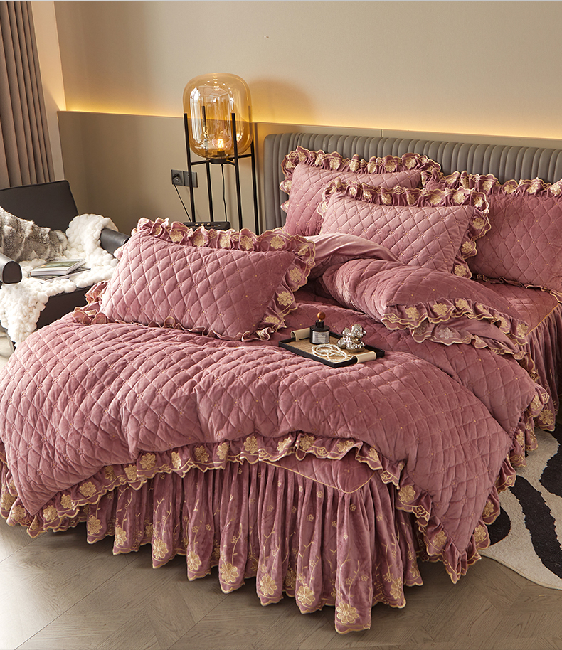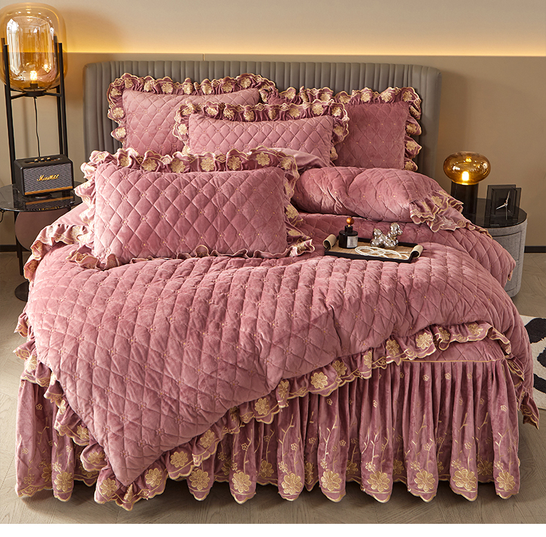 当前位置: 91家纺网 > 商品网购 > 床品套件 > 四件套 > 宝宝绒四件套 > 罗艺轩 2024新款花季宝宝绒全套夹棉絎缝加厚系列床裙套件 豆沙粉