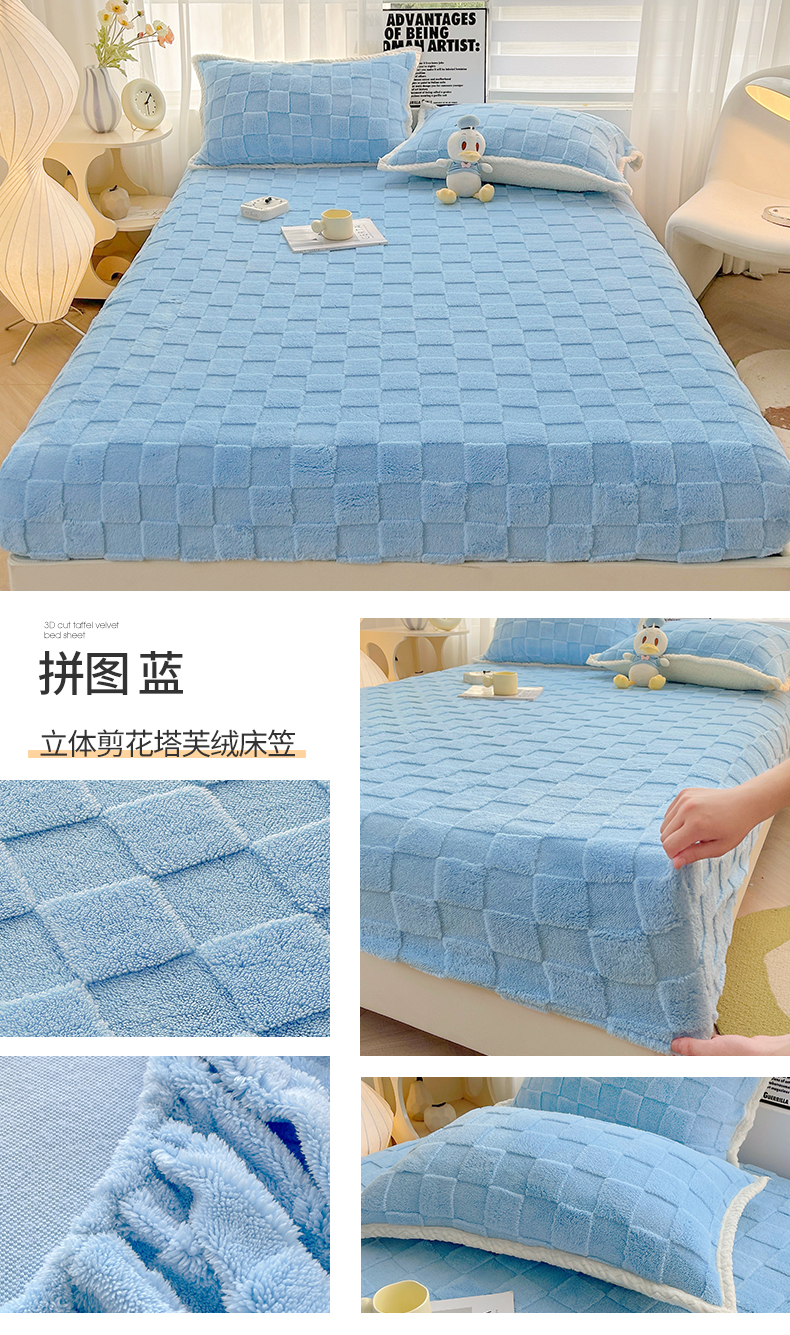 商品名称:梦舒羽 2025直播爆款牛奶绒塔芙绒纯色雕花床笠三件套 拼图 蓝