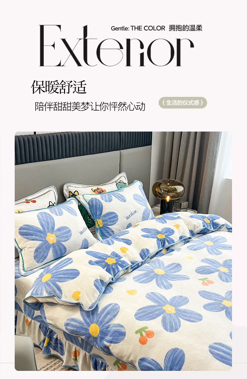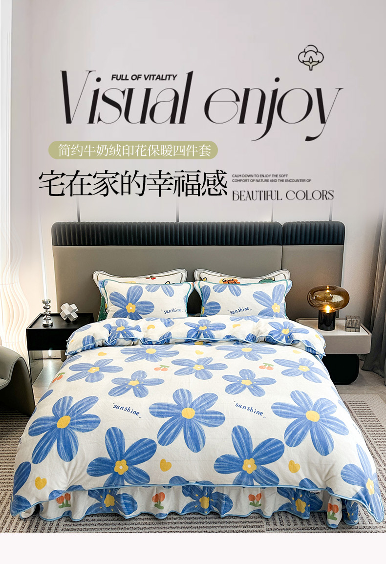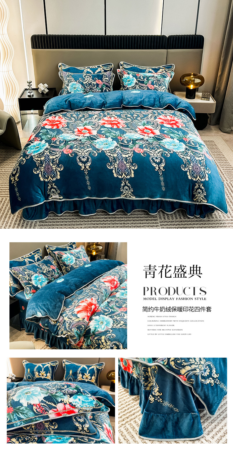 商品名称:欧喜璐 2023新款高克重牛奶绒四件套法莱绒金貂绒8.5斤加厚保暖-印花款 青花盛典