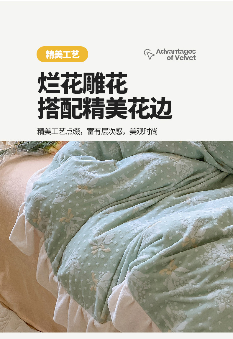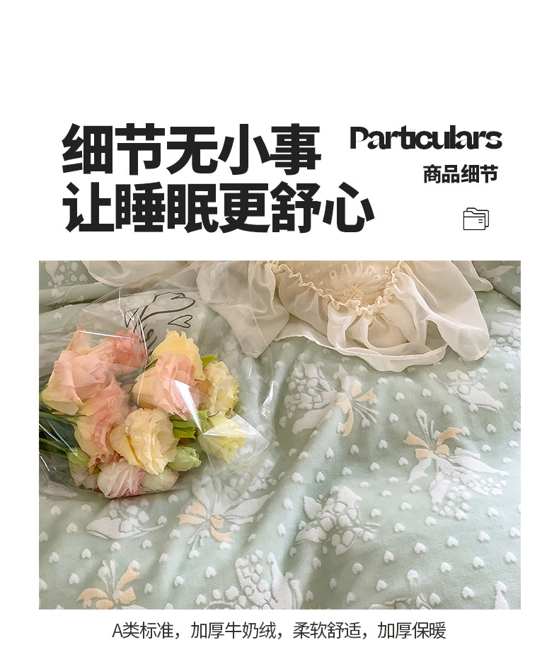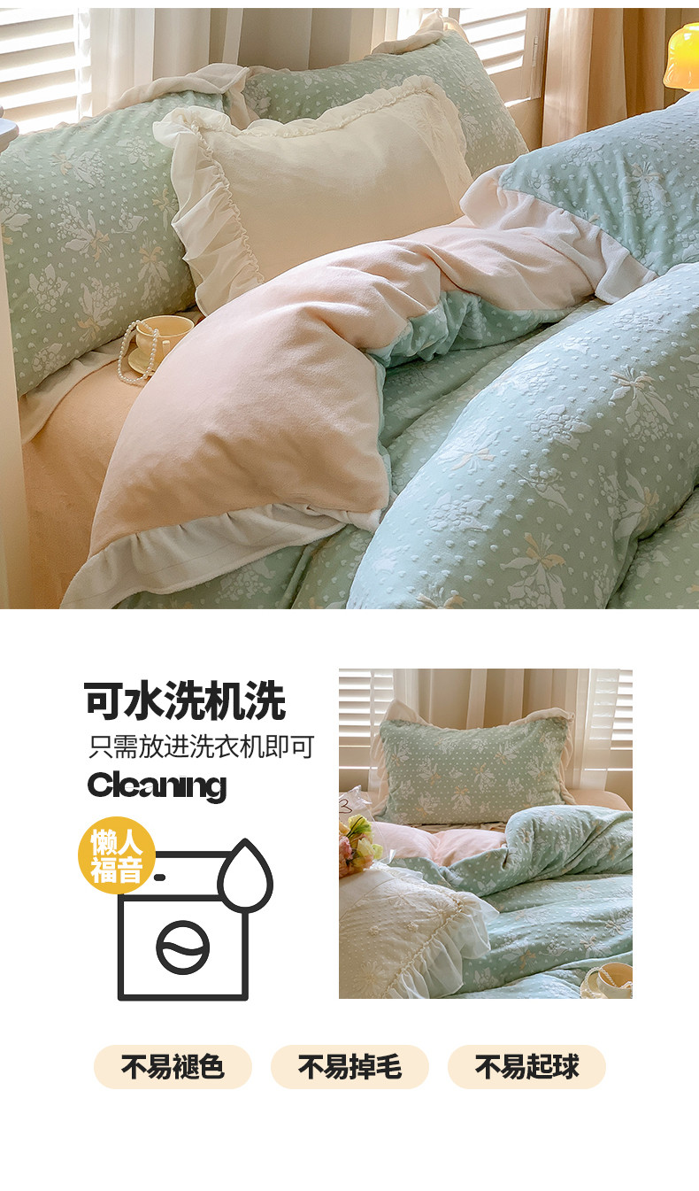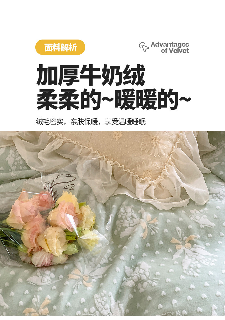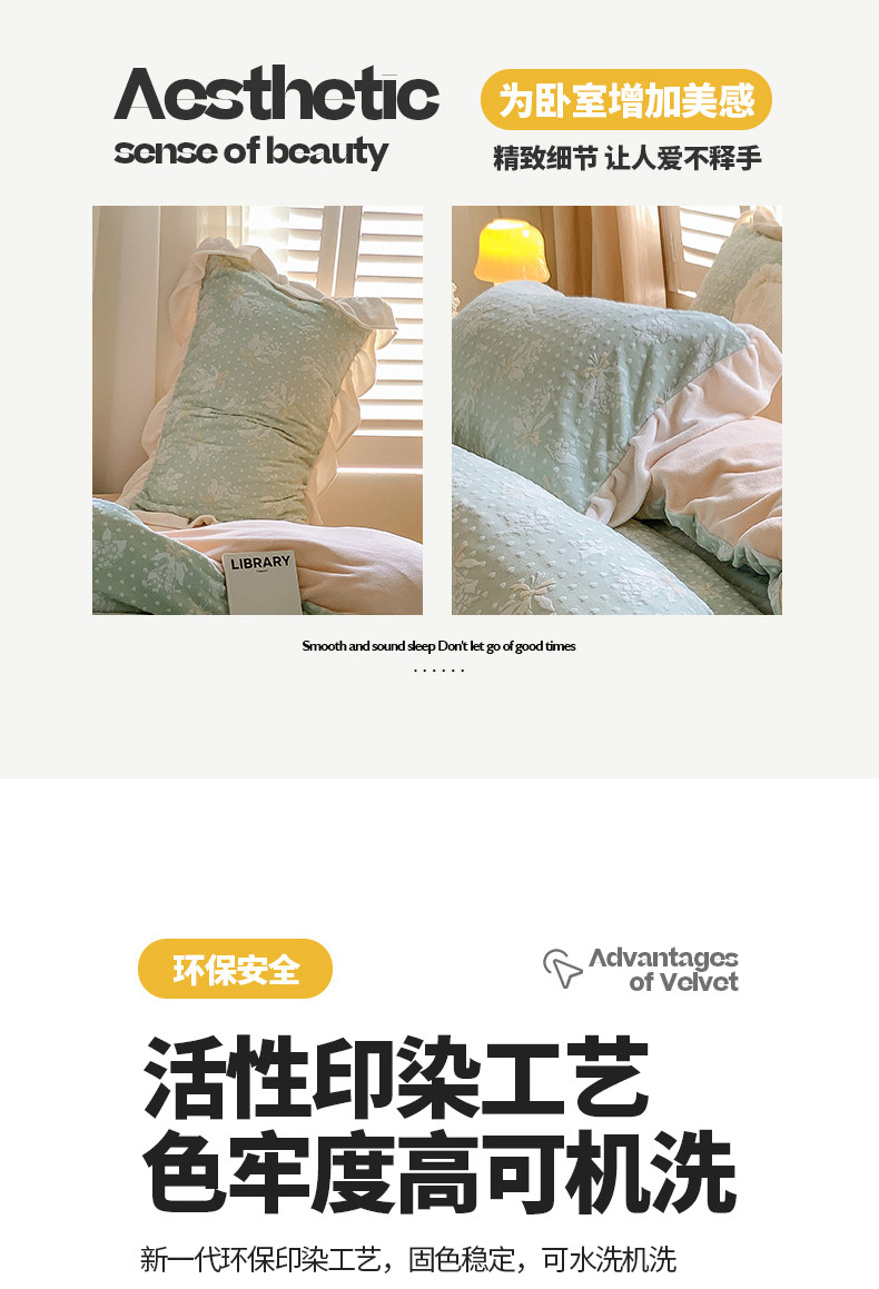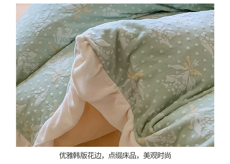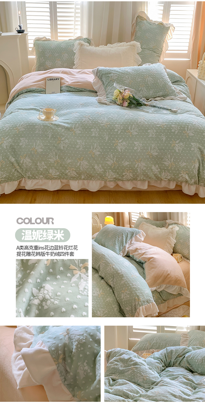 商品名称:桃子家居 2023新款A类高克重ins花边3D立体韩版牛奶绒四件套 绒烂花-温妮绿米