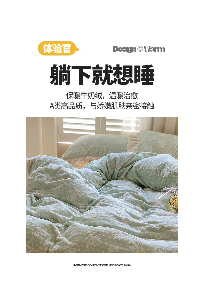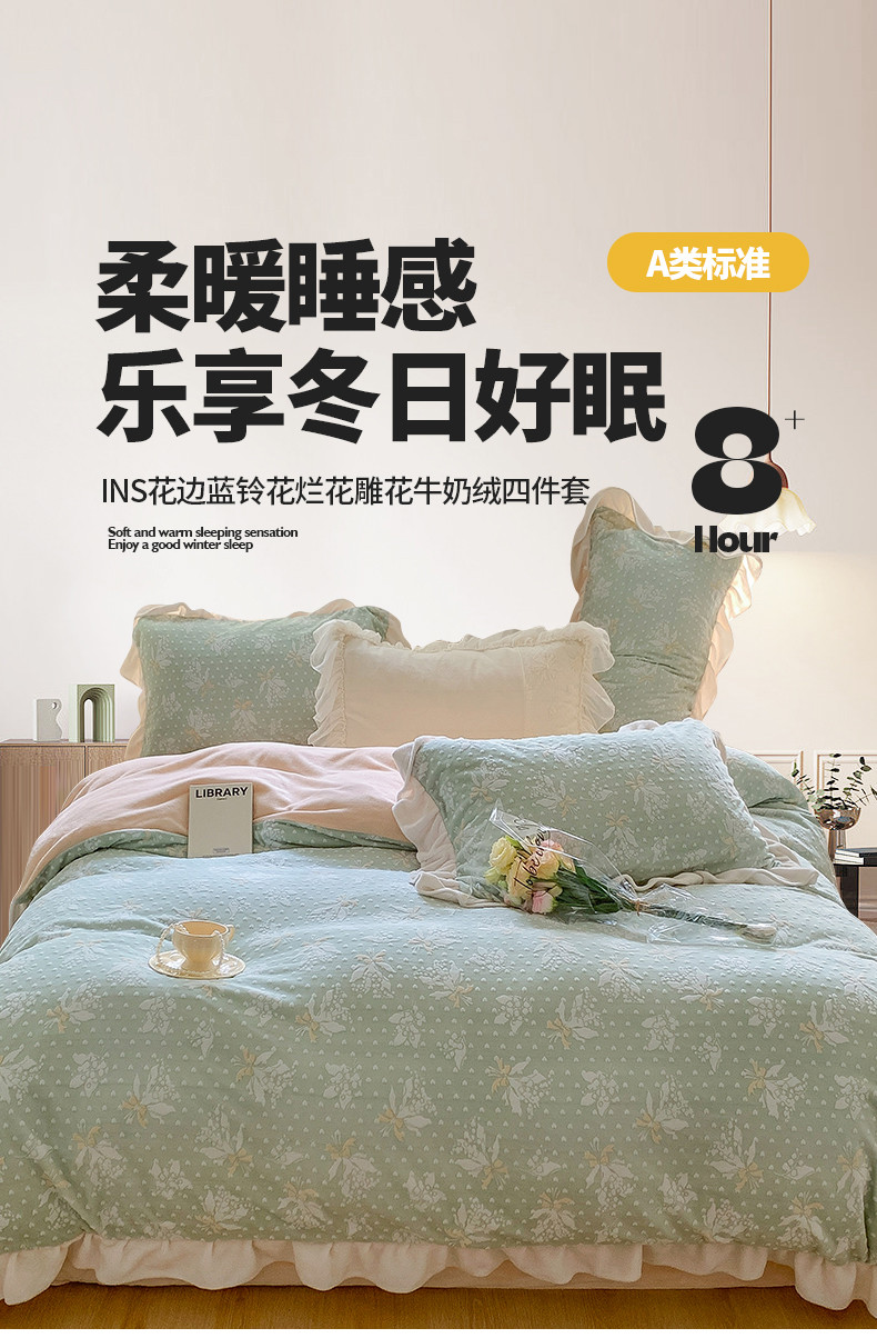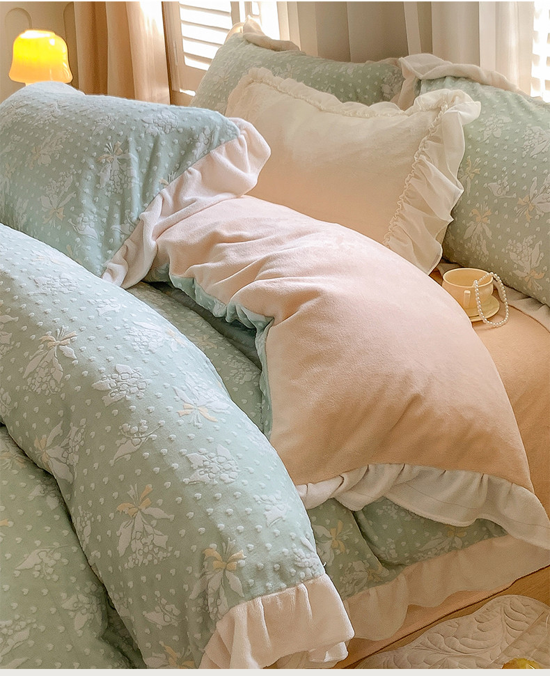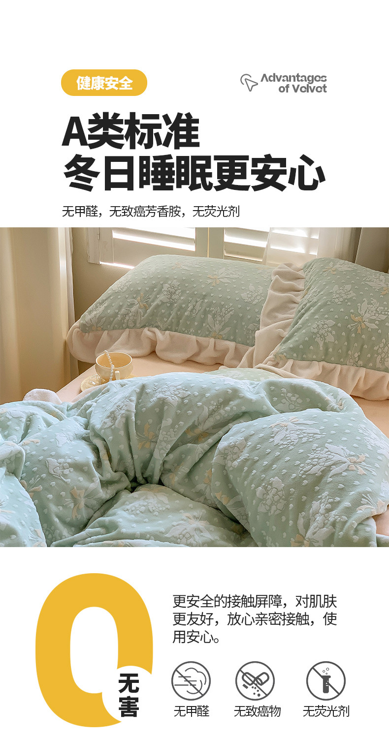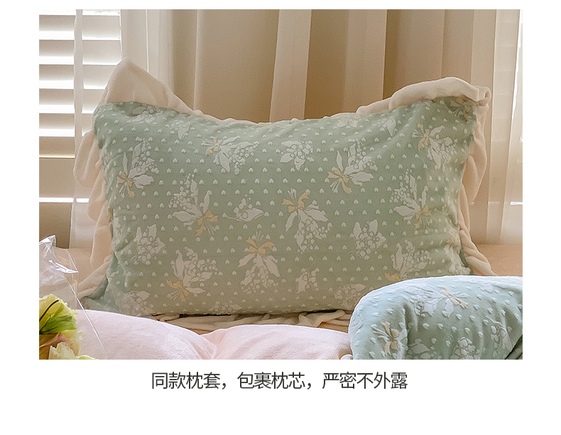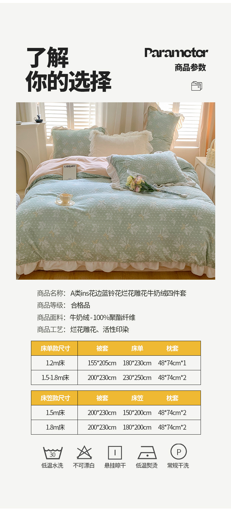 商品名称:桃子家居 2023新款A类高克重ins花边3D立体韩版牛奶绒四件套 绒烂花-温妮绿米