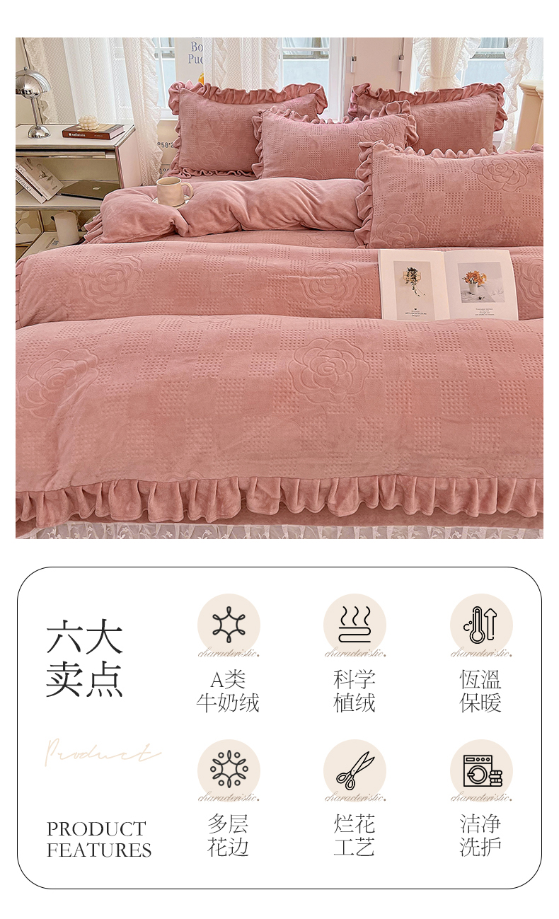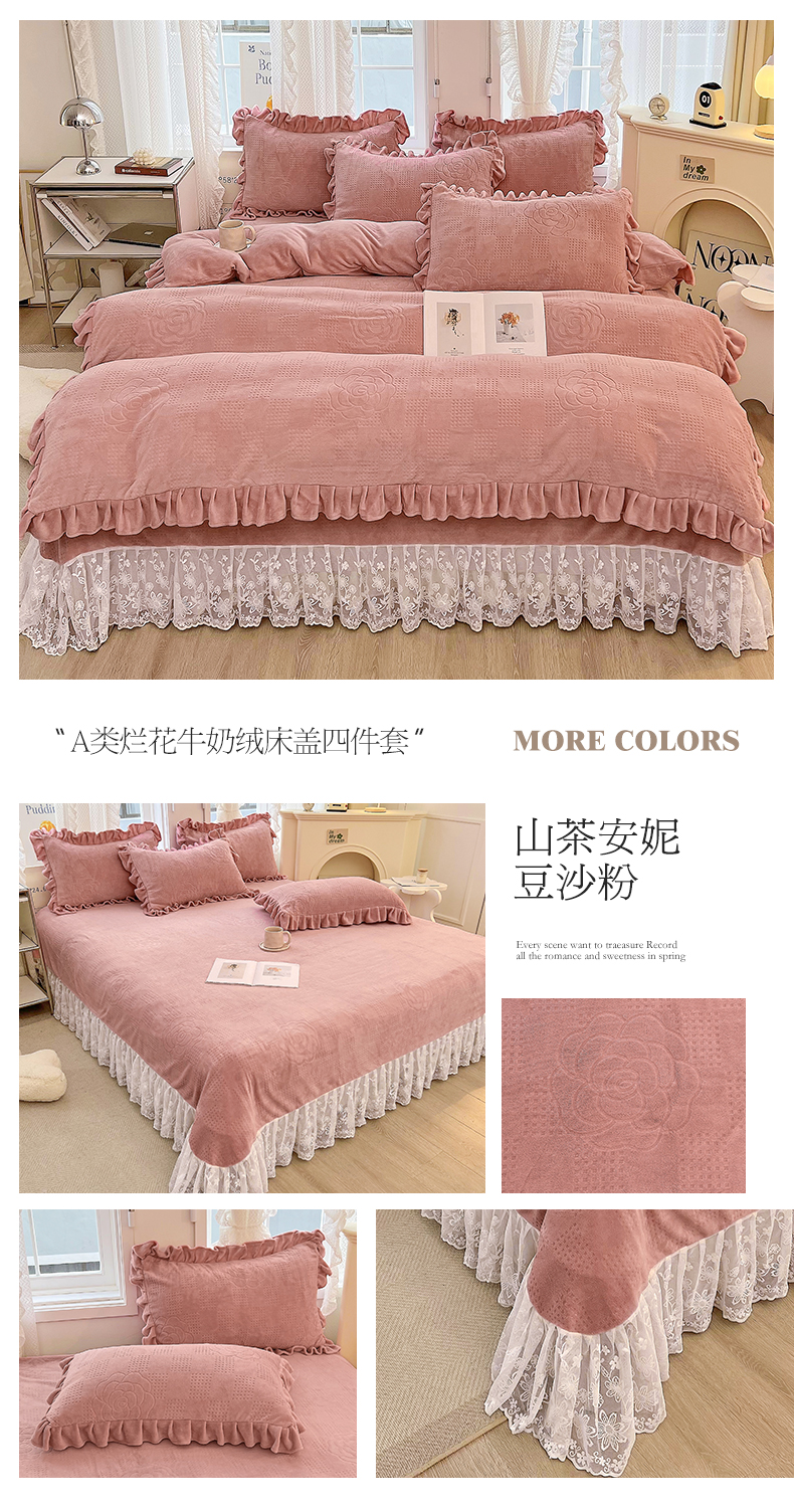 商品名称:宜凡 2023新款烂花牛奶绒床盖四件套 山茶安妮-豆沙粉