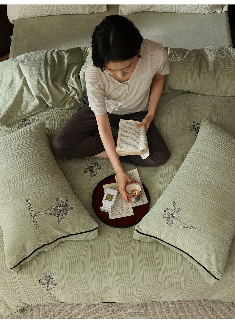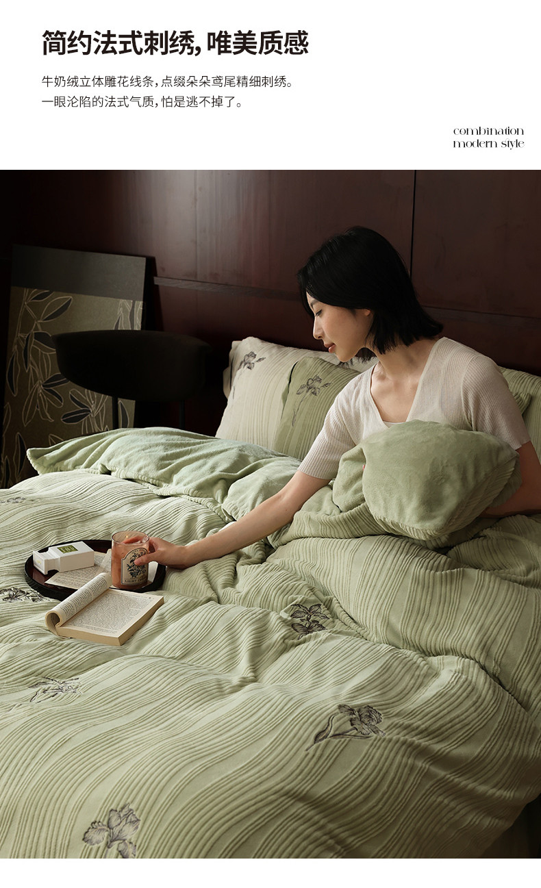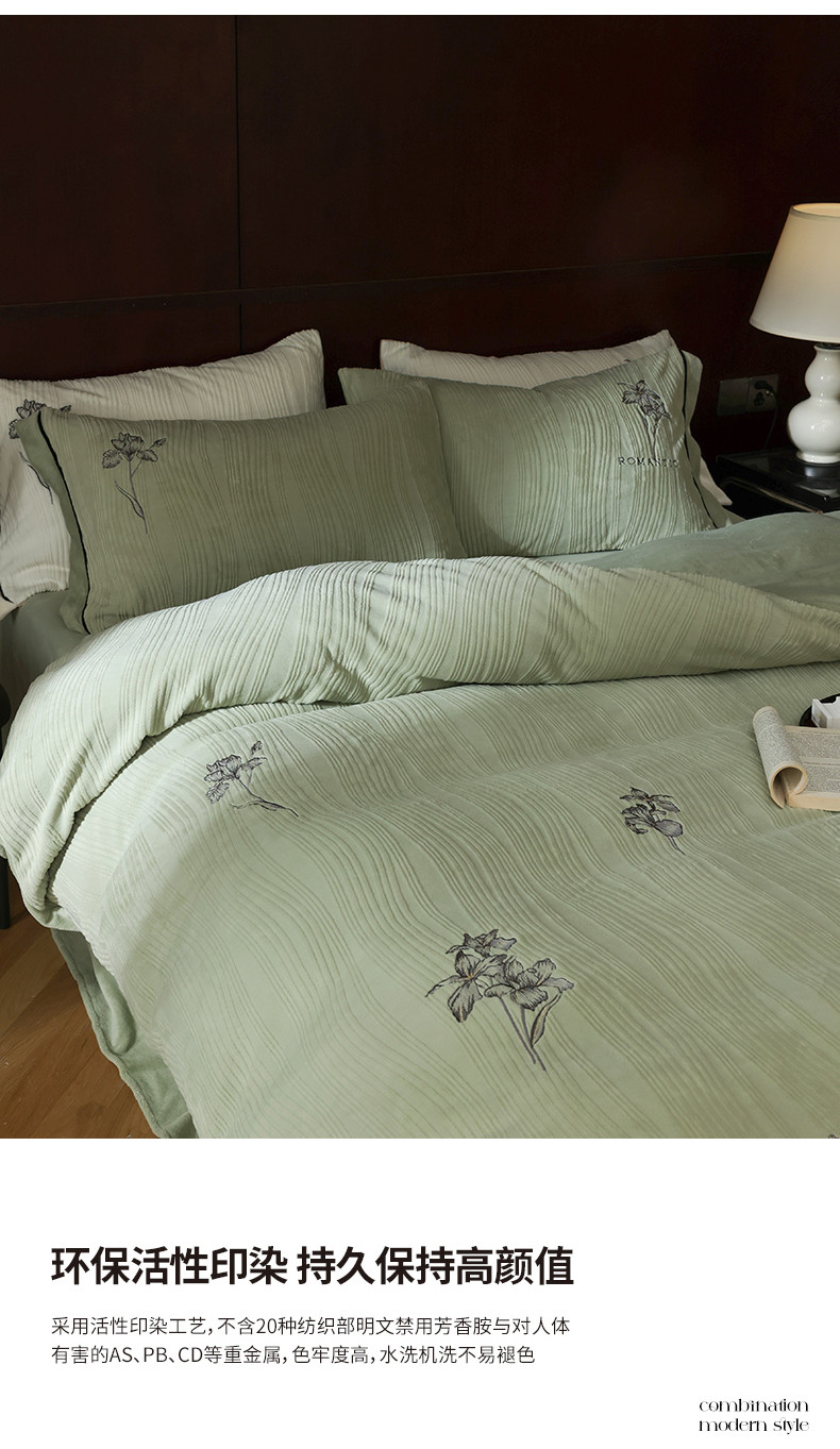 2022锦芙牛奶绒250克全消光绣花四件套,情绪熊猫-绿竹