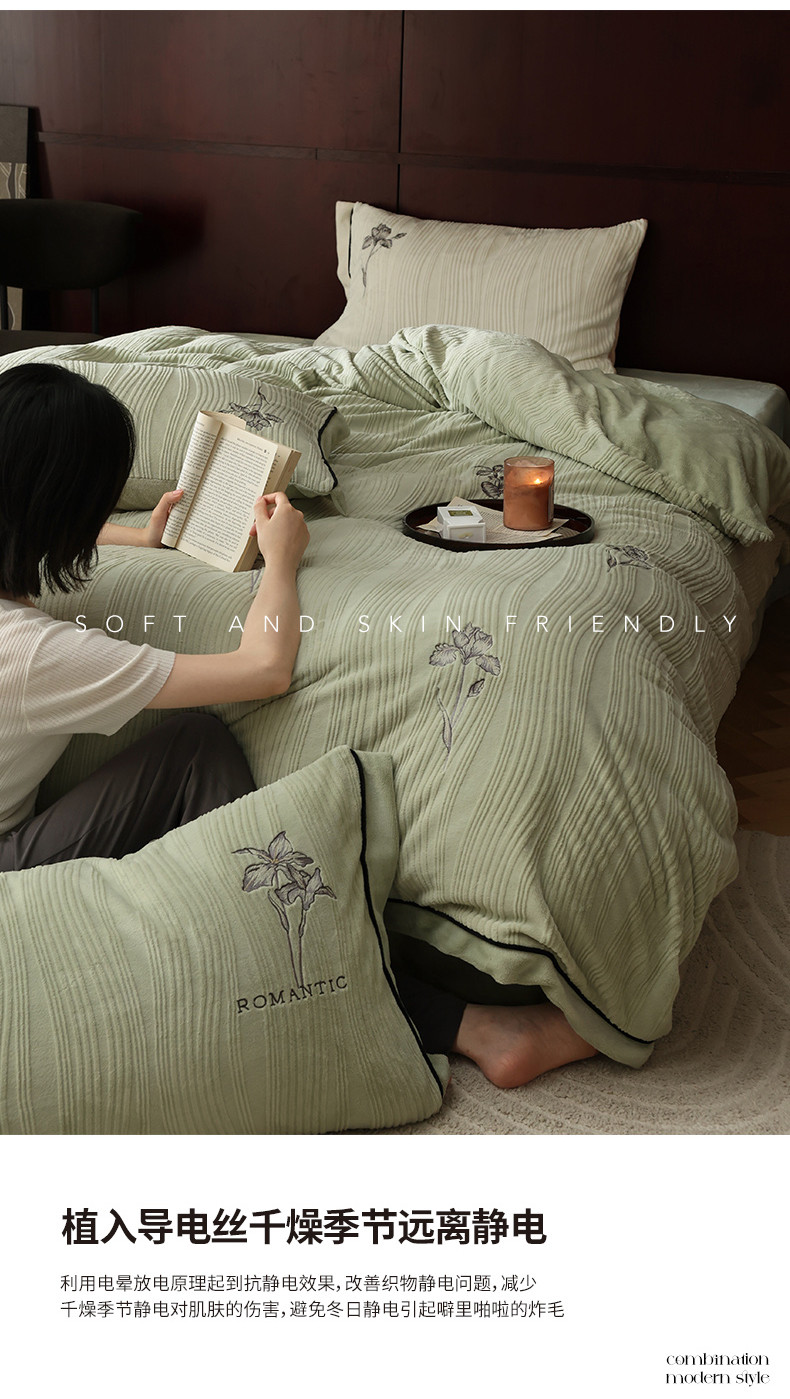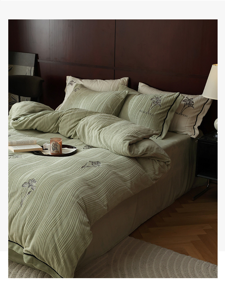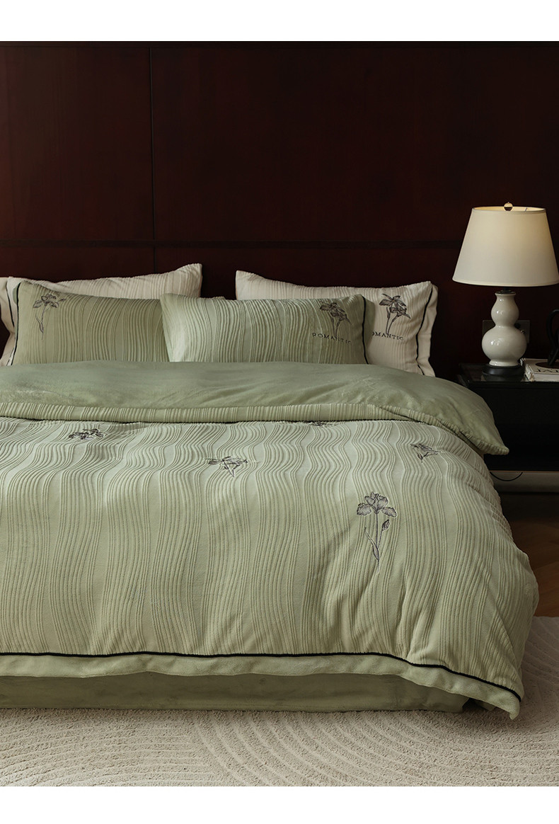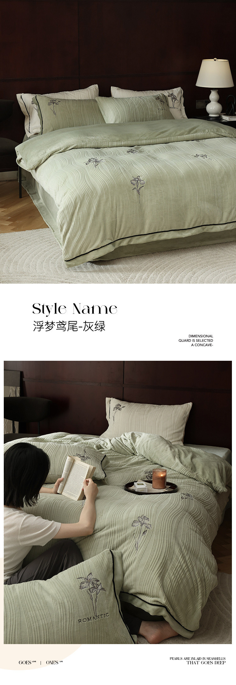 商品名称:风向标 新款A类高克重立体牛奶绒四件套-浮梦鸢尾法式实拍 浮梦鸢尾-灰绿