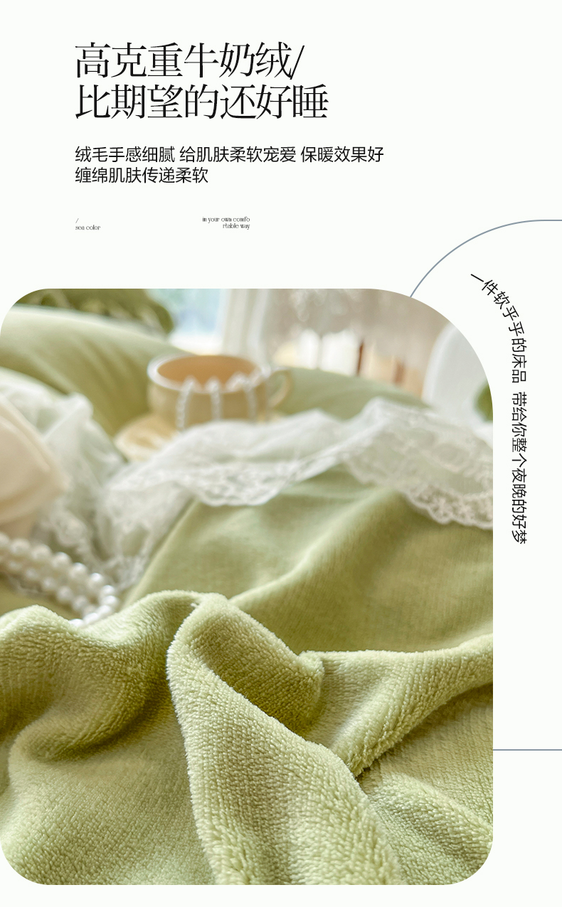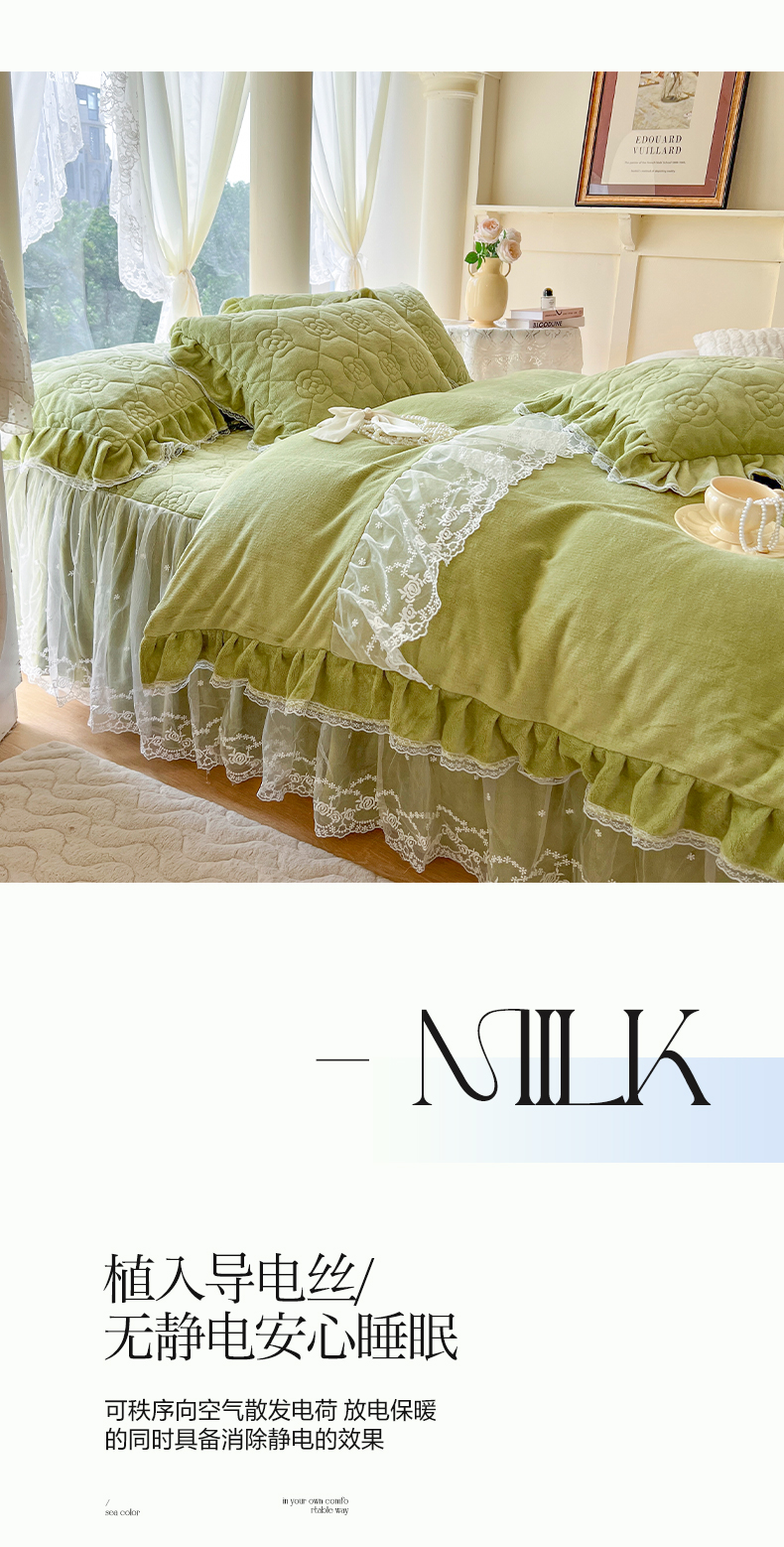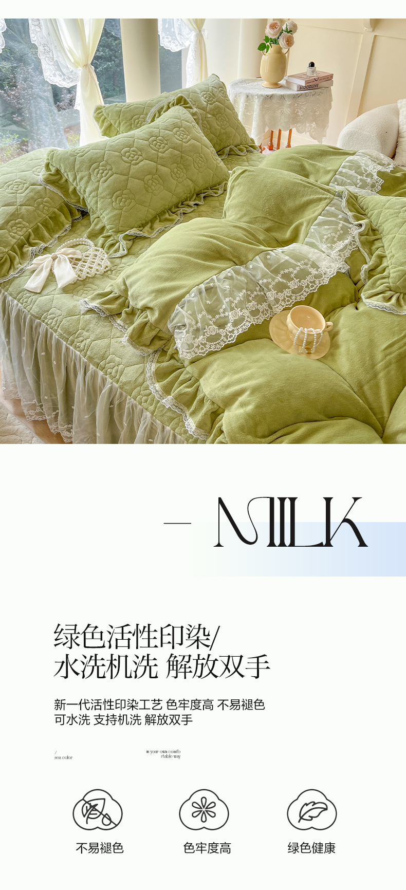 当前位置: 91家纺网 > 商品网购 > 床品套件 > 四件套 > 牛奶绒四件套 > 网红馆 2025新款高克重牛奶绒花边床裙四件套-山茶系列 山茶-果绿
