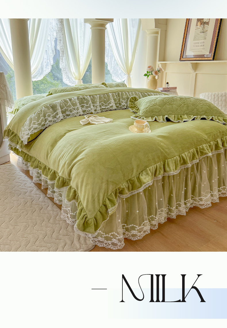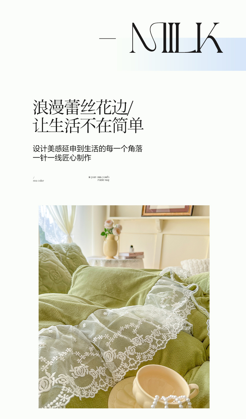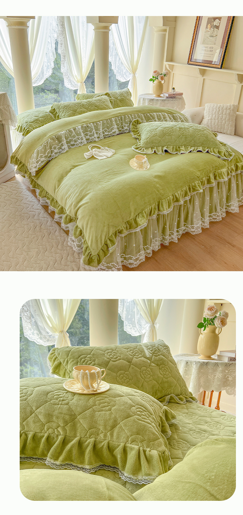 当前位置: 91家纺网 > 商品网购 > 床品套件 > 四件套 > 牛奶绒四件套 > 网红馆 2025新款高克重牛奶绒花边床裙四件套-山茶系列 山茶-果绿