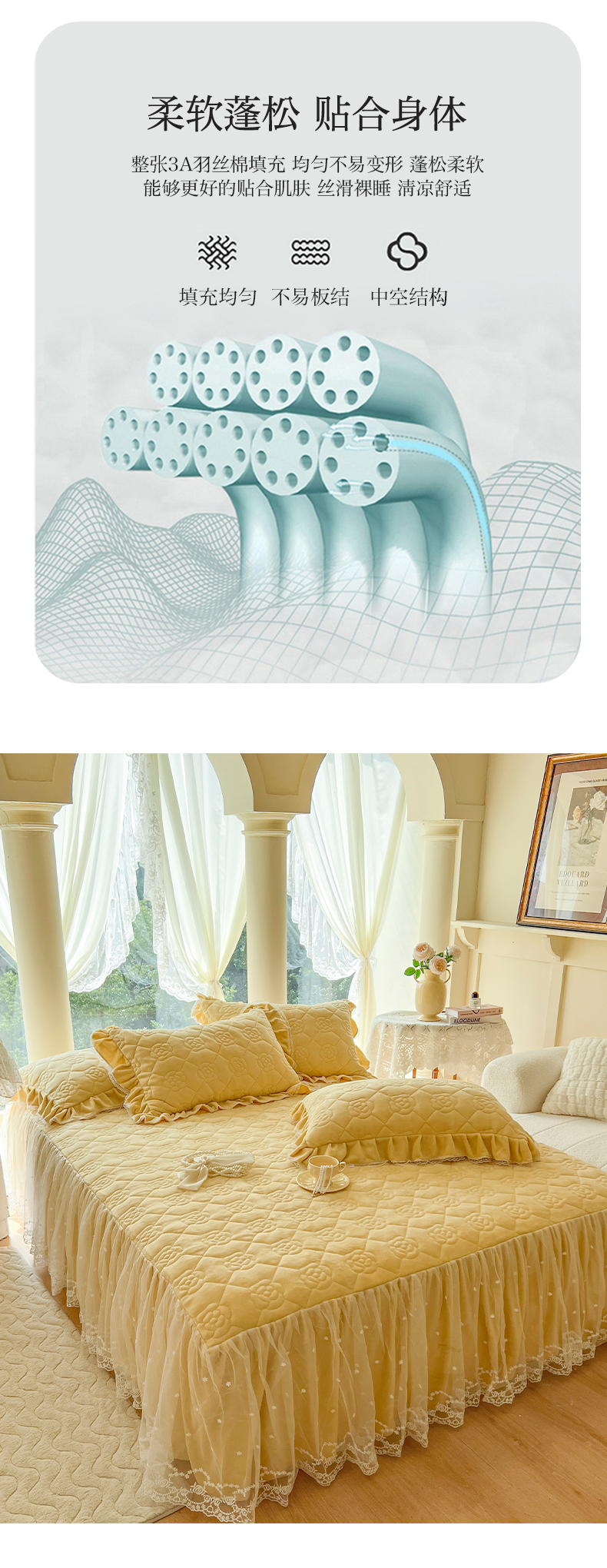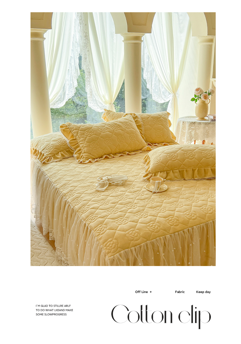 网红馆 2025新款高克重牛奶绒花边单床裙-山茶系列 山茶-黄