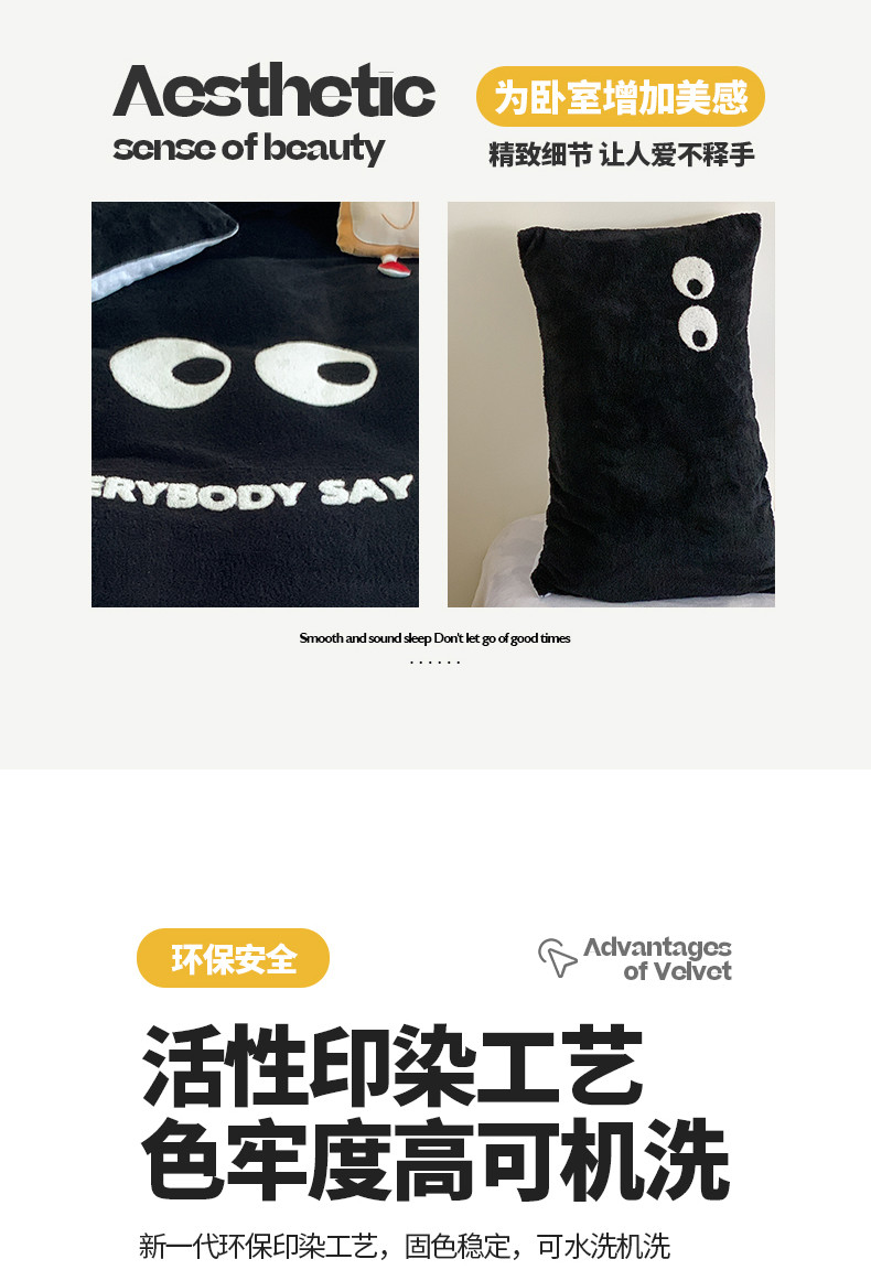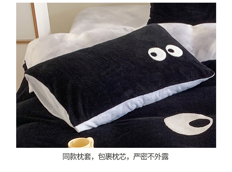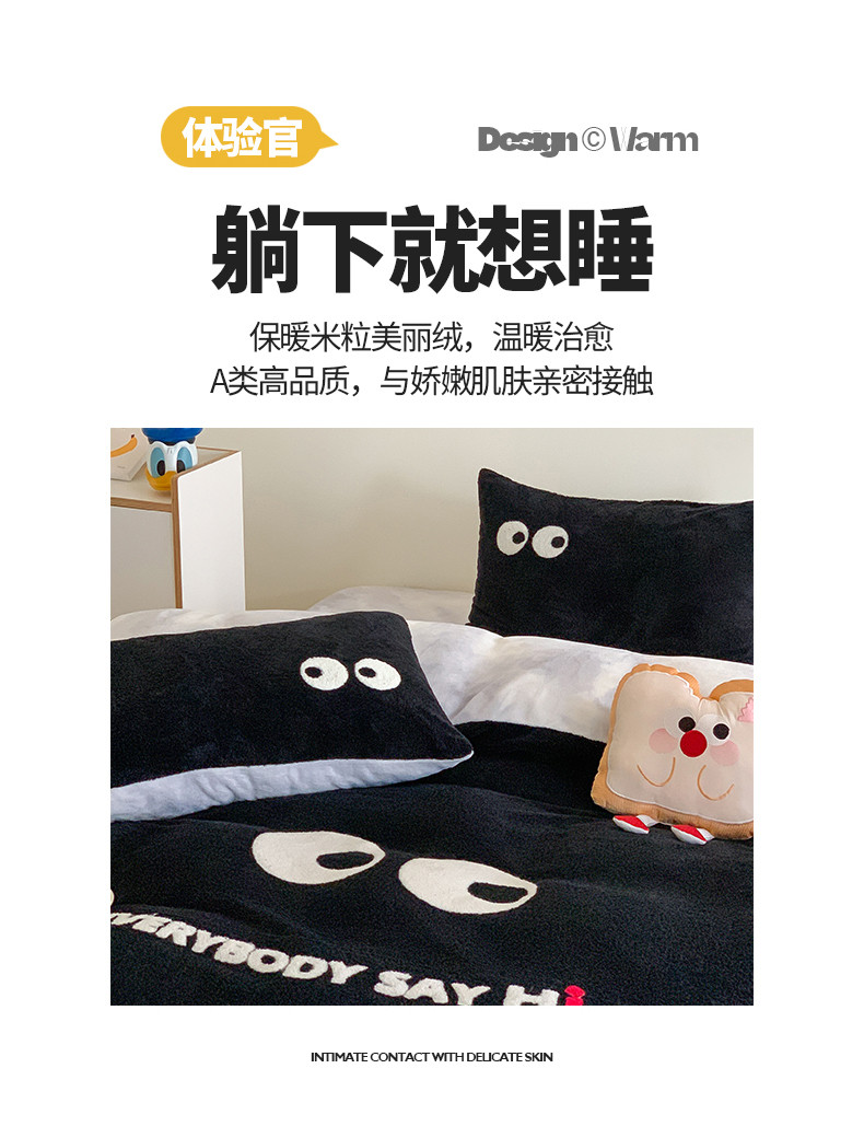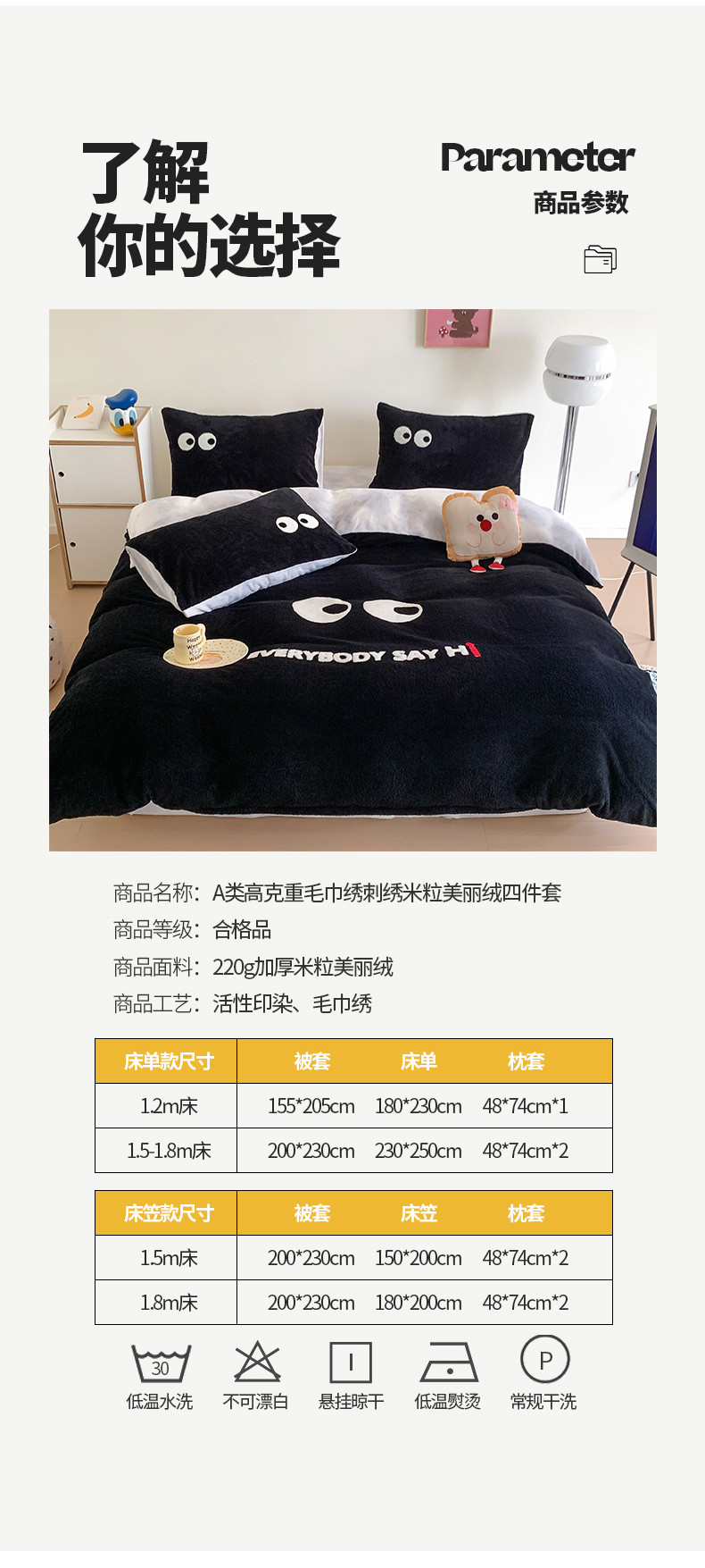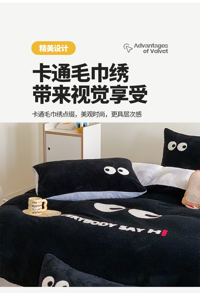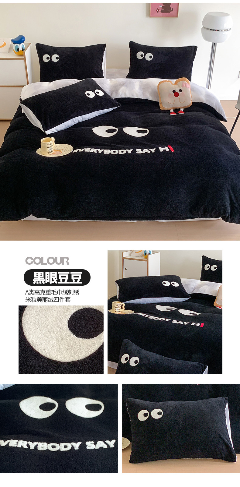 桃子家居 2023新款A类高克重毛巾绣刺绣米粒美丽绒牛奶绒四件套 绒毛巾绣-黑眼豆豆