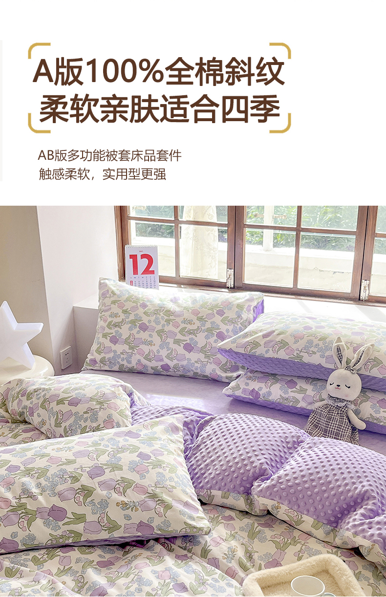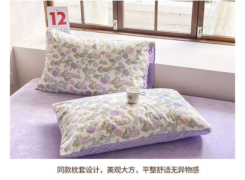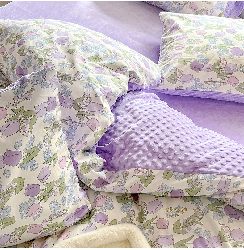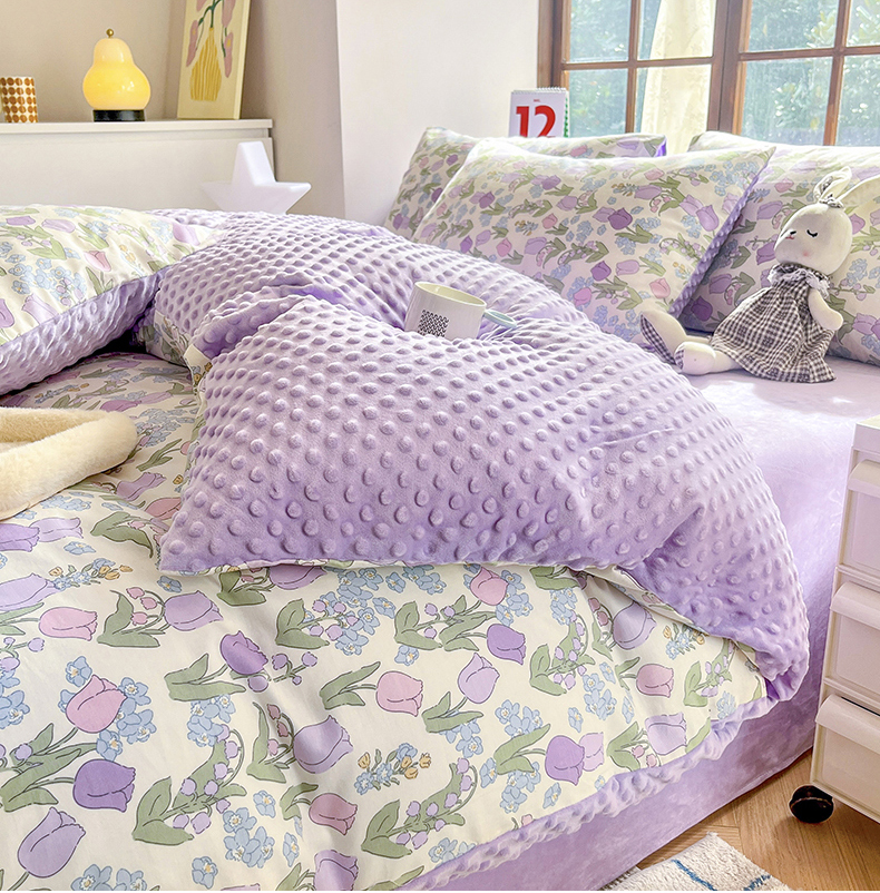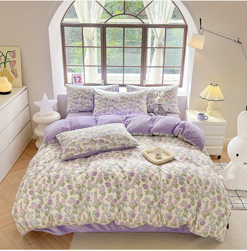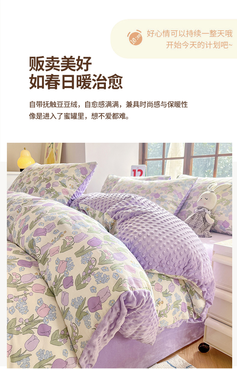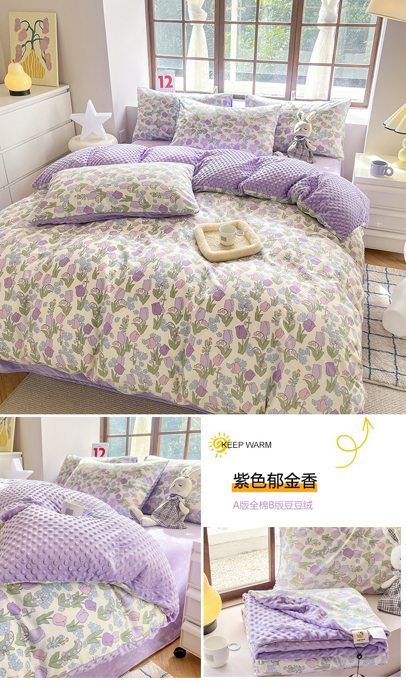 当前位置: 91家纺网 > 商品网购 > 床品套件 > 四件套 > 全棉普通四件套 > 麦伦家居 2023秋冬新品多功能床品全棉+豆豆绒四件套卡通小清新系列 紫色郁金香