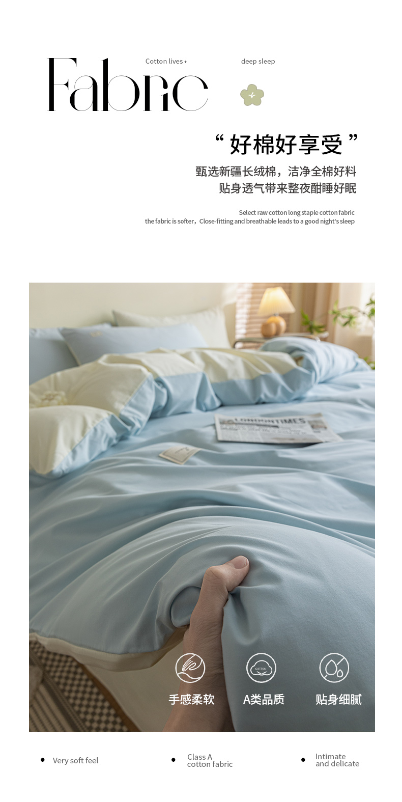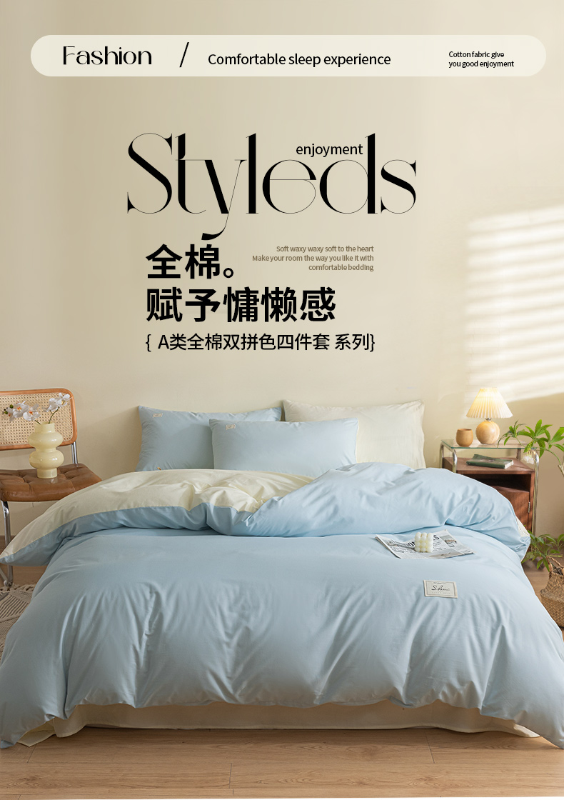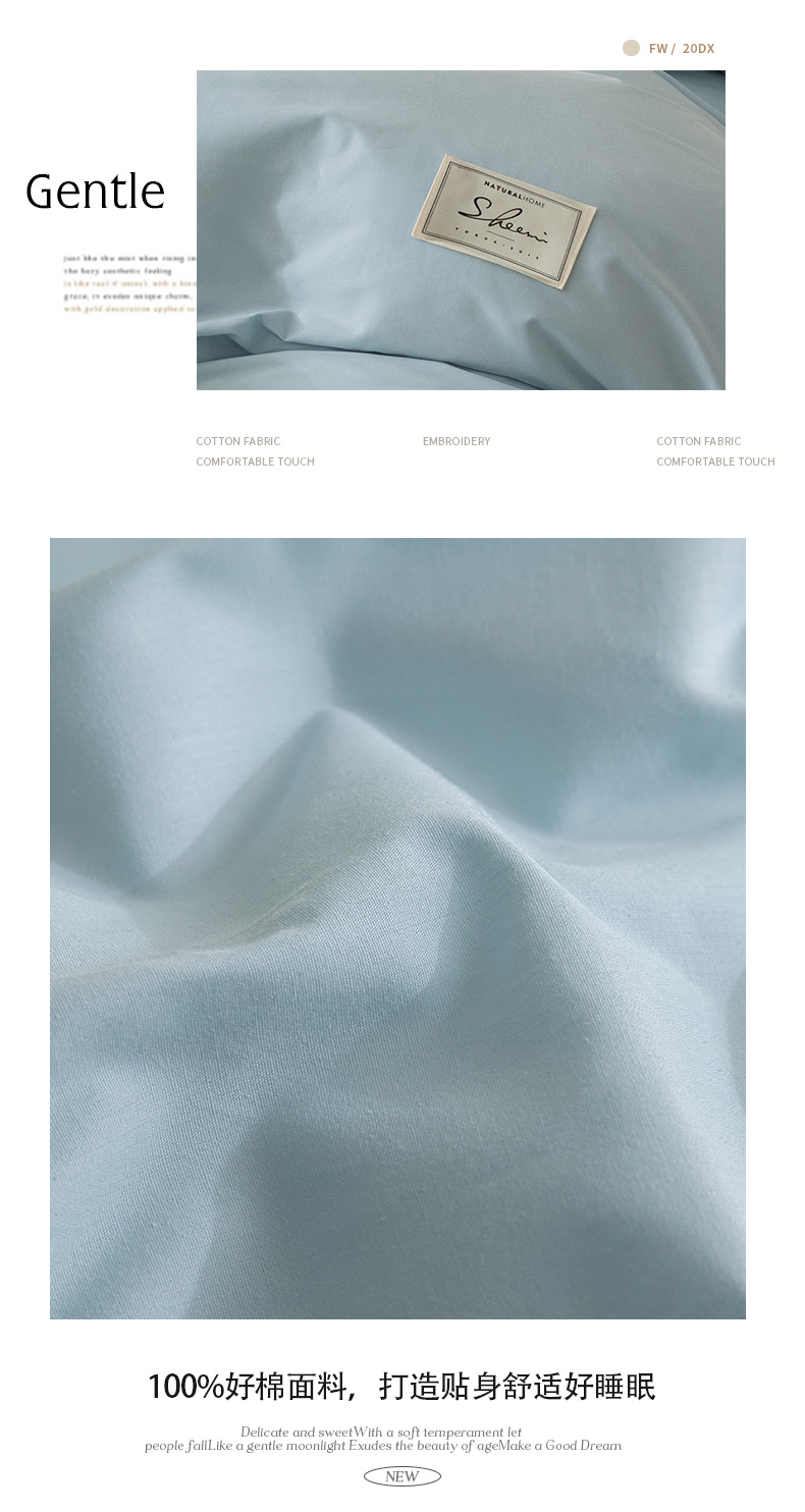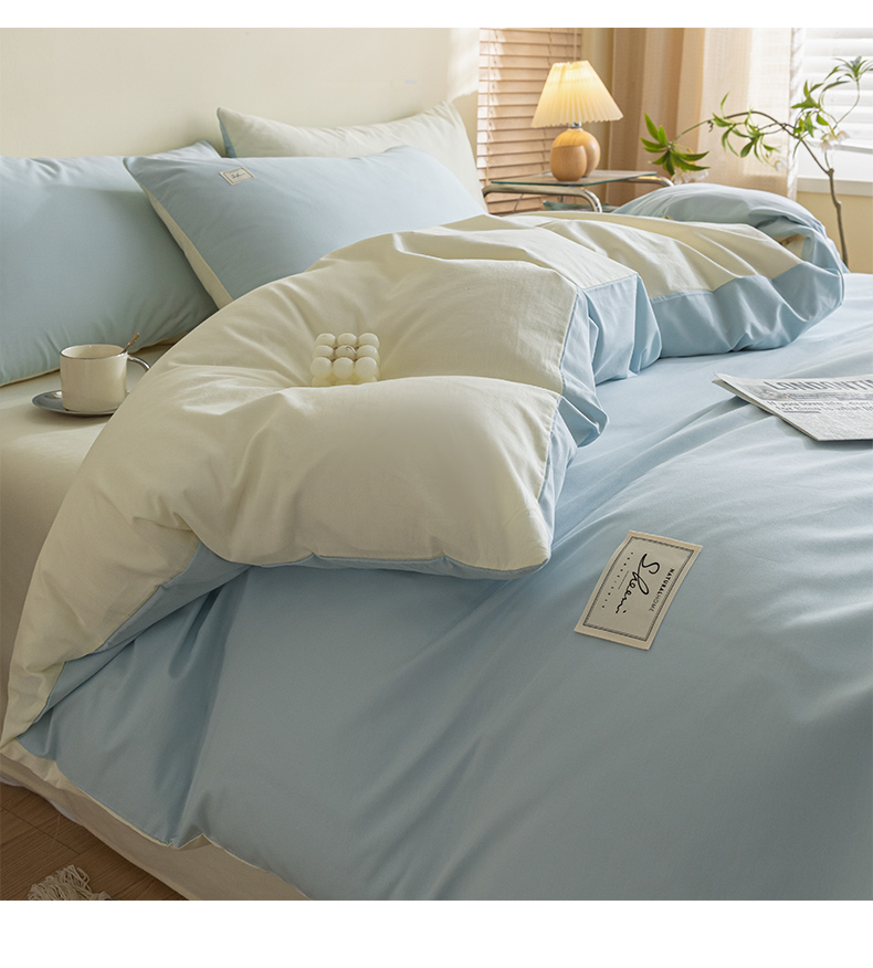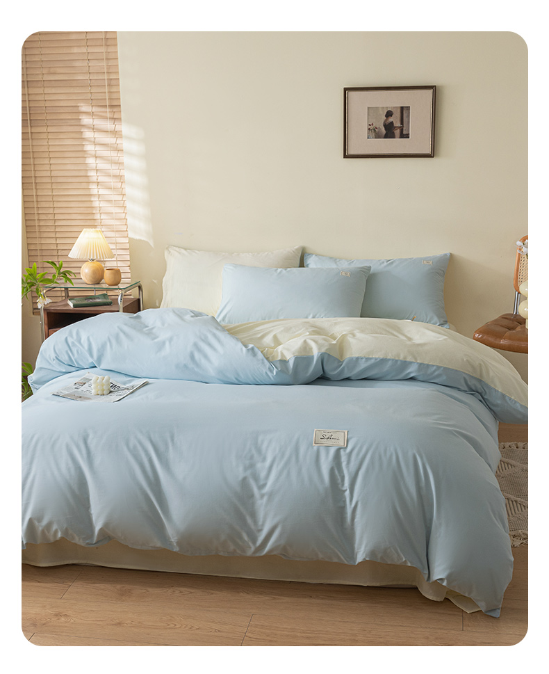 当前位置: 91家纺网 > 商品网购 > 床品套件 > 四件套 > 全棉普通四件套 > 木子家纺 2024新款纯色双拼40支全棉水洗棉四件套 天空蓝杏黄
