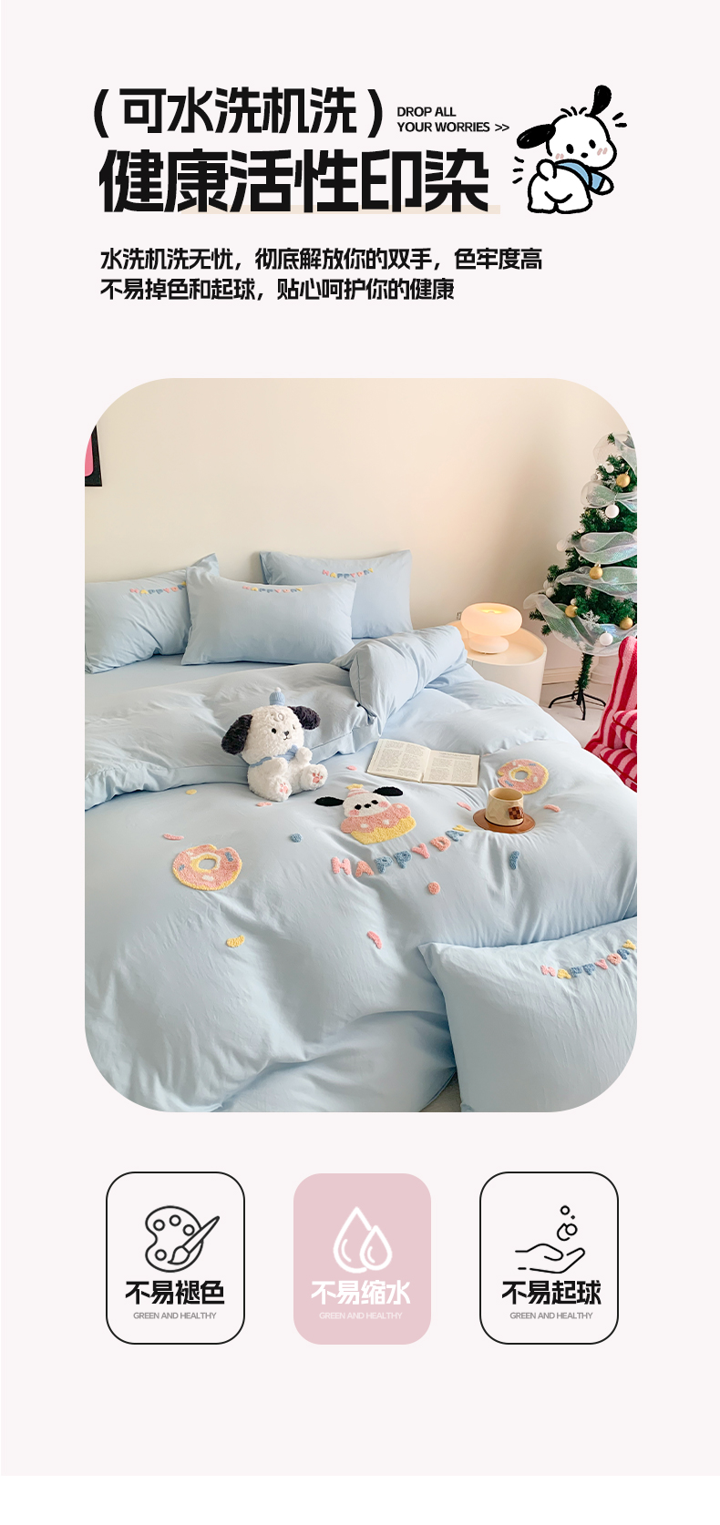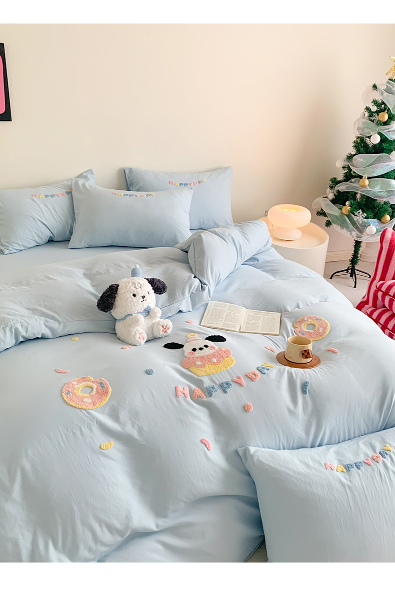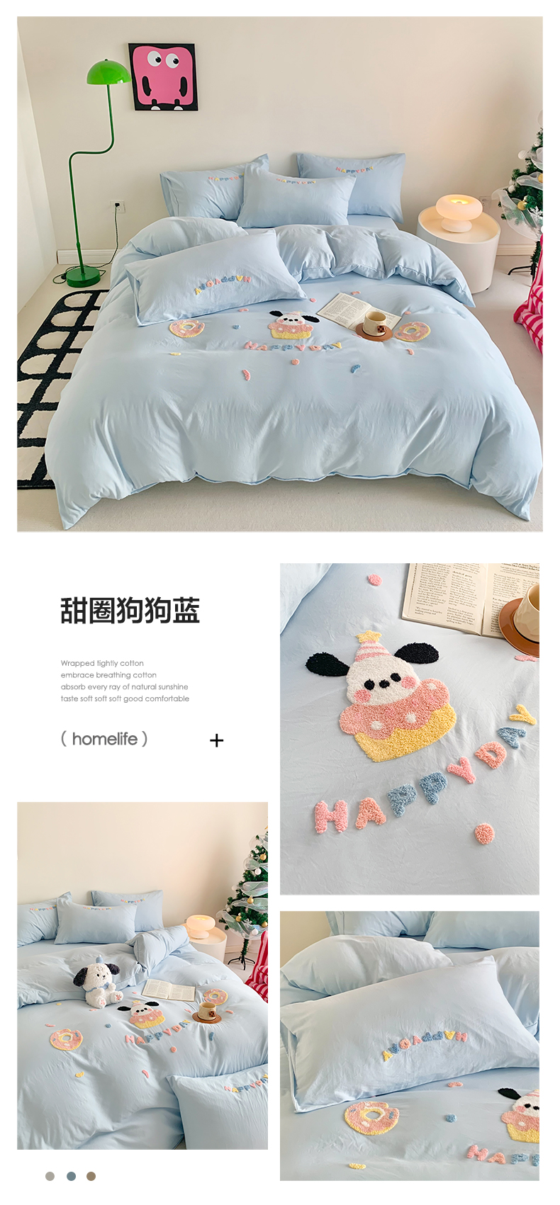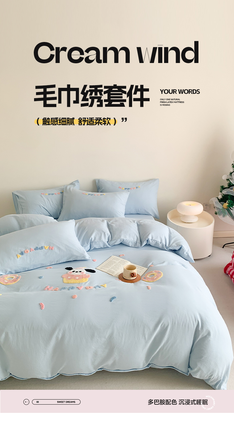 当前位置: 91家纺网 > 商品网购 > 床品套件 > 四件套 > 其它四件套 > 凯儿2024新款水洗棉卡通毛巾绣四件套-专版花型 甜圈狗狗蓝