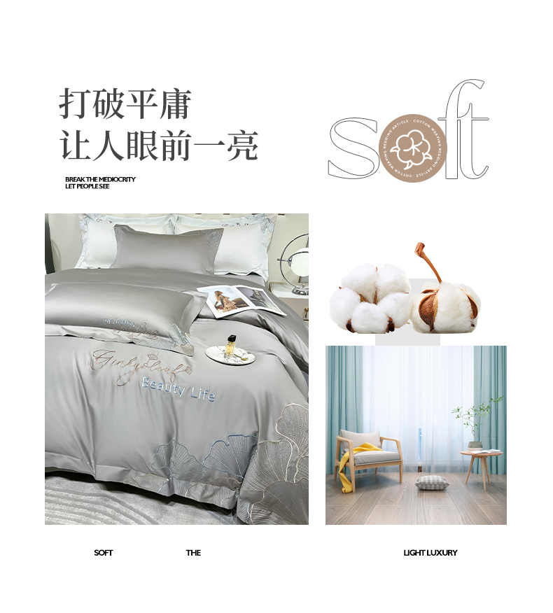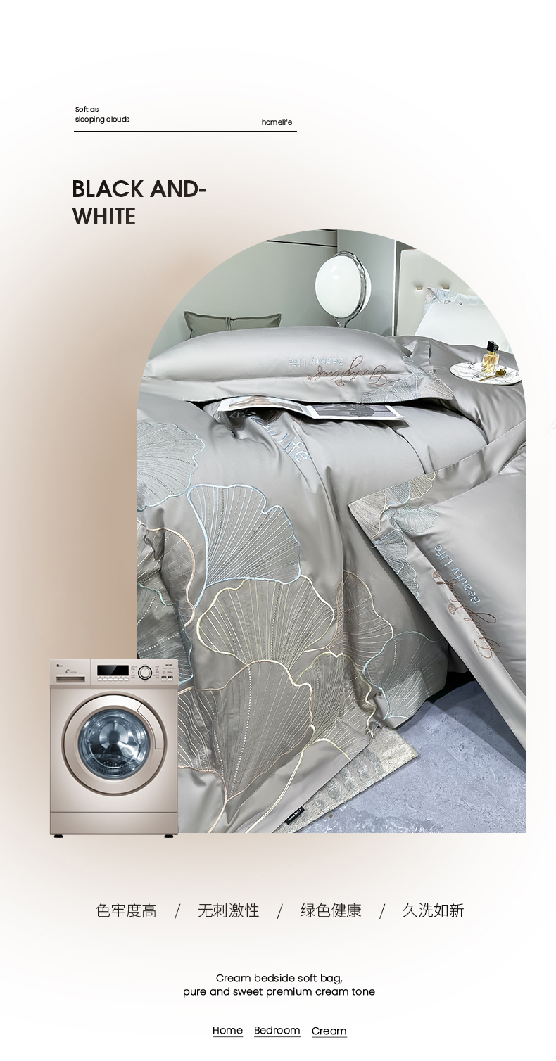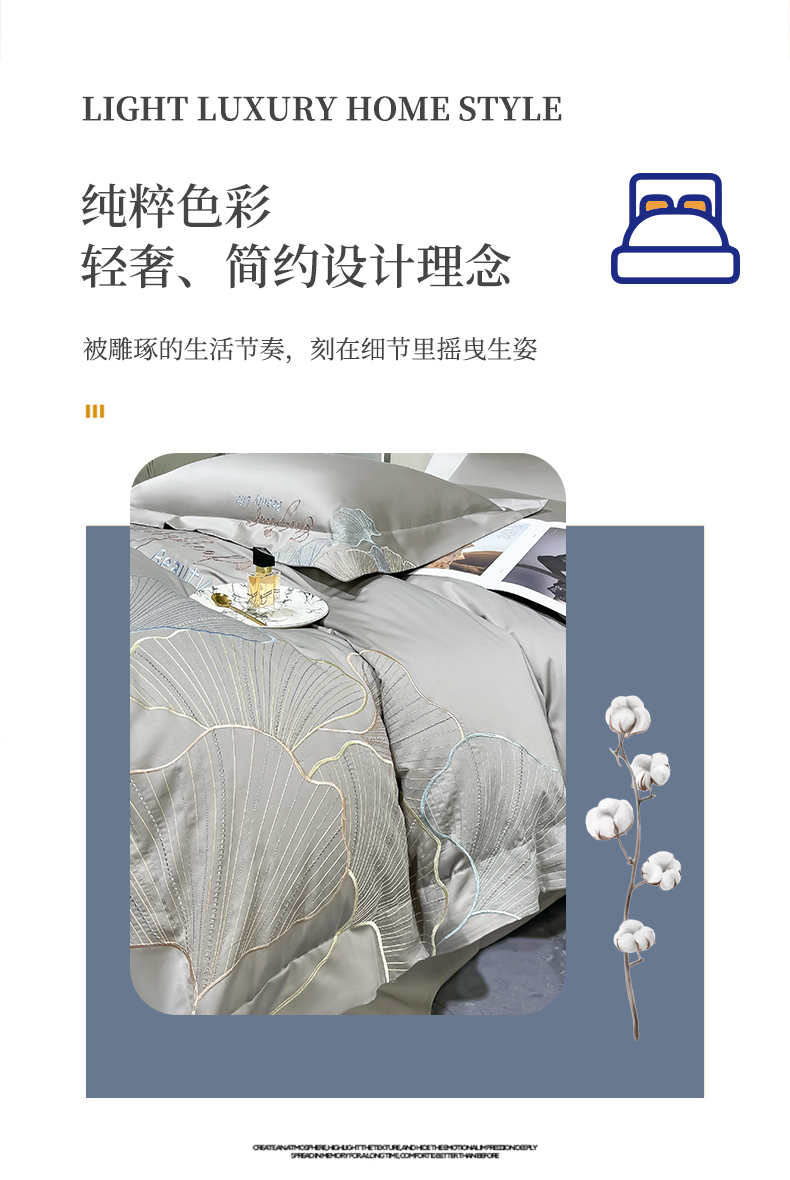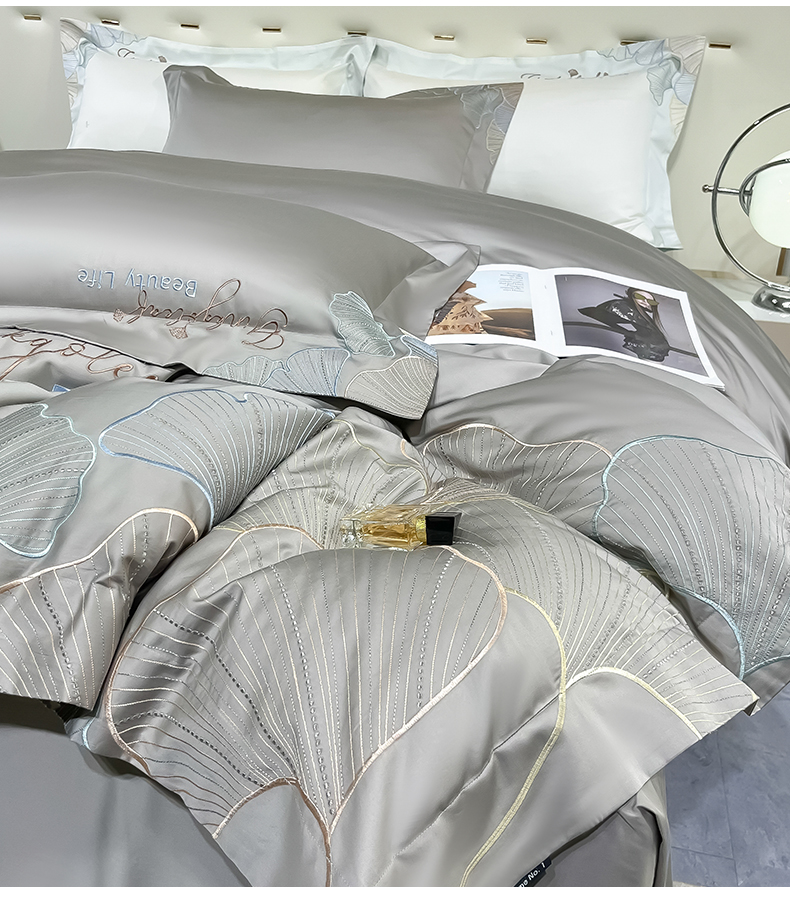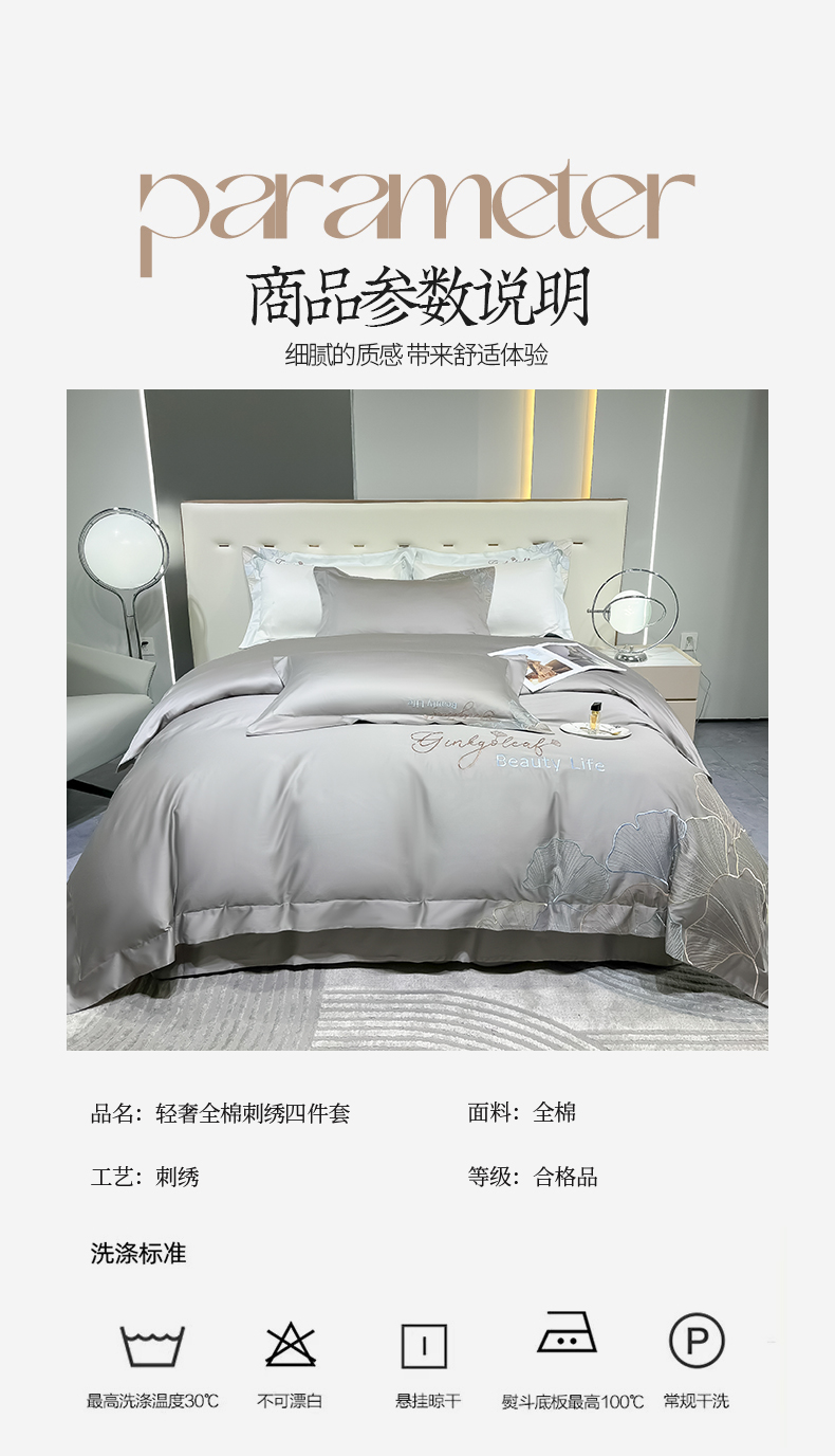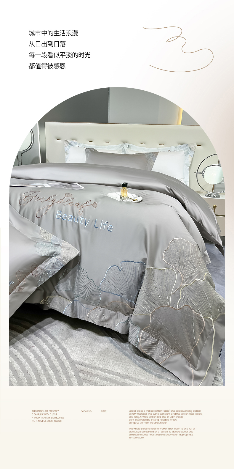 商品名称:家居1号家纺 2024新款轻奢双面100纯棉长绒棉刺绣四件套床单被套全棉床上用品直播热款-银杏花语 银杏花语-绅士灰