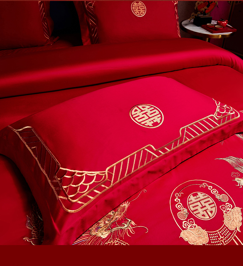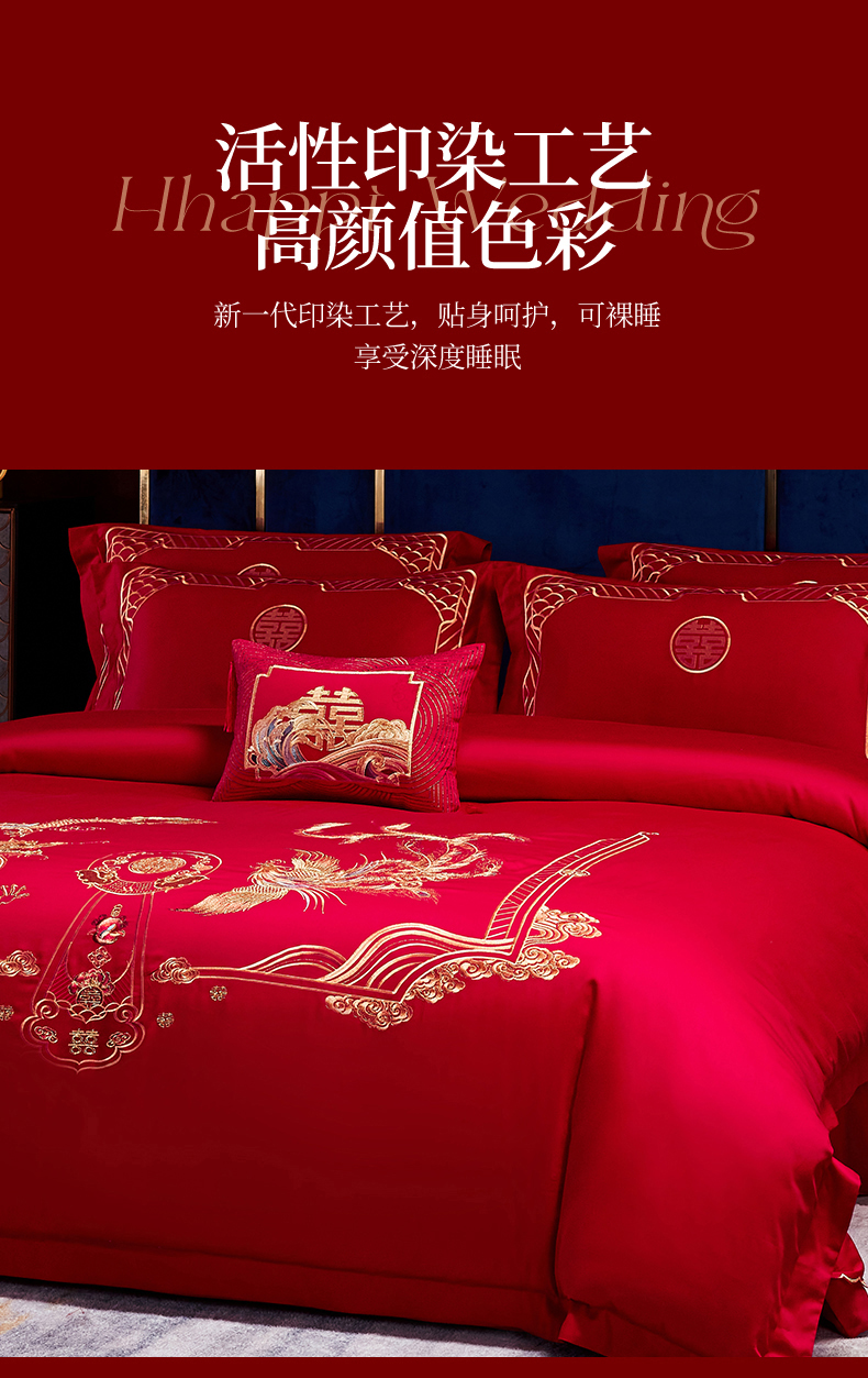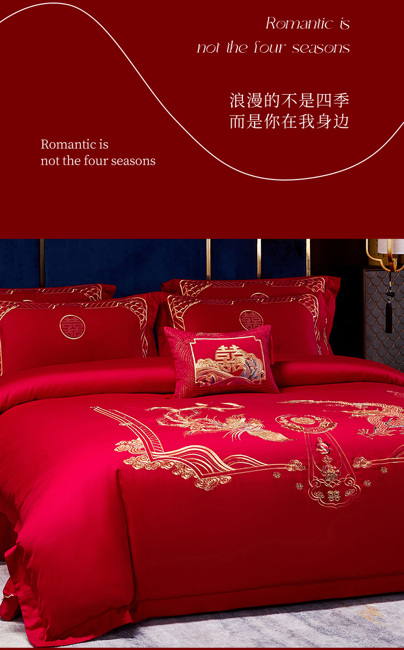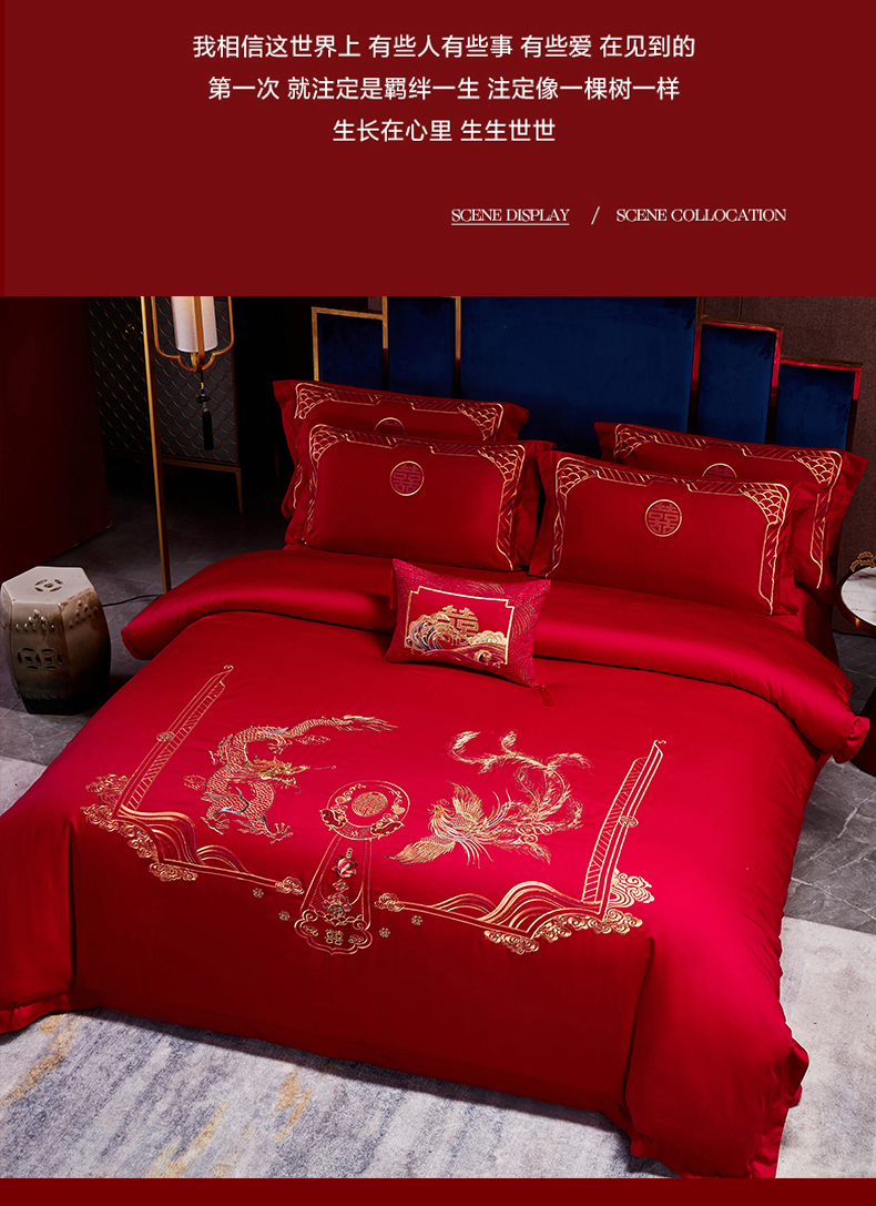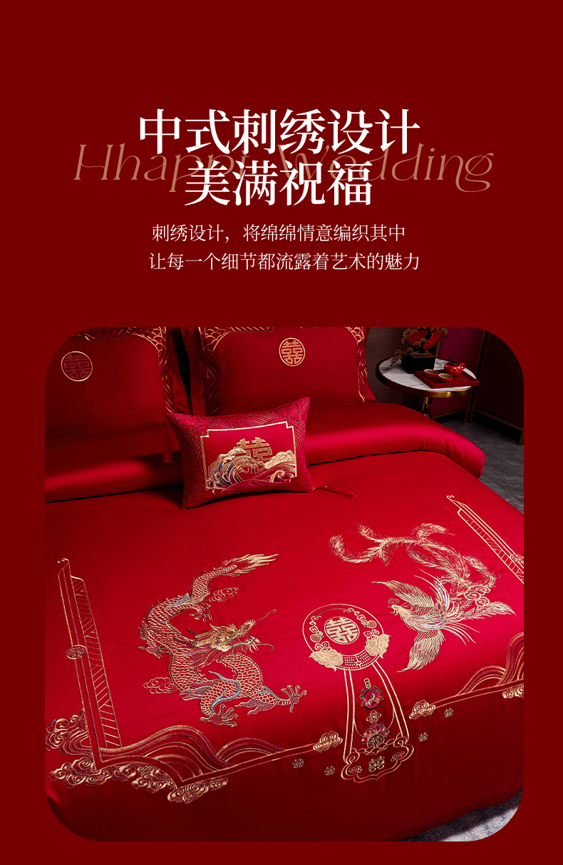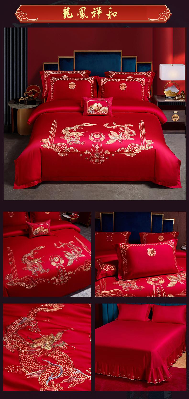 商品名称:晶缦家纺 2024纯棉全棉60支贡缎长绒棉刺绣花婚庆四件套--绣花贴边床单款 龙凤祥和