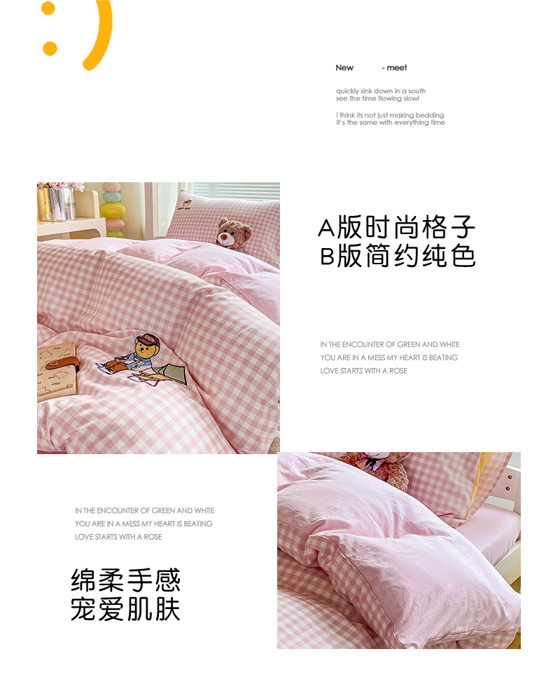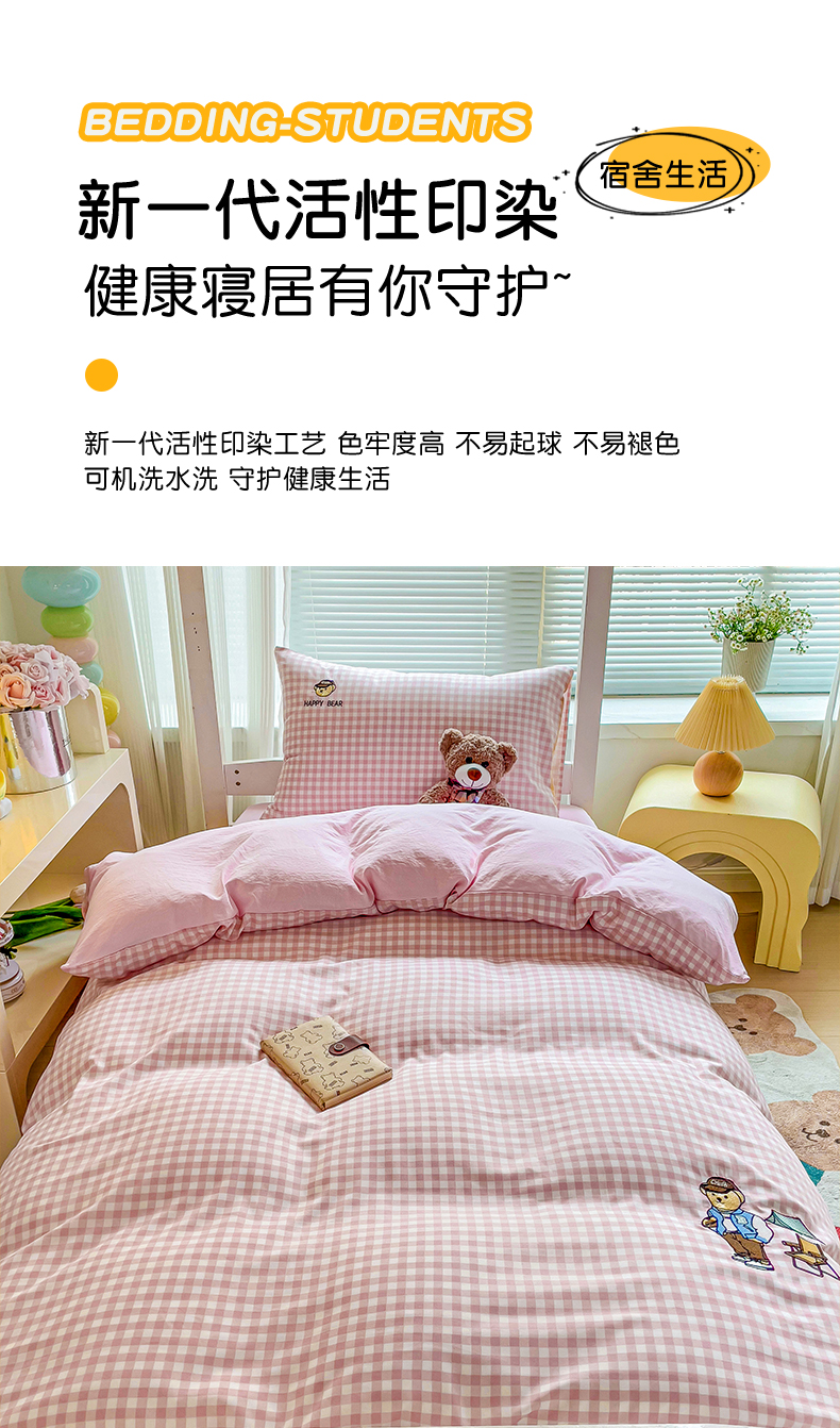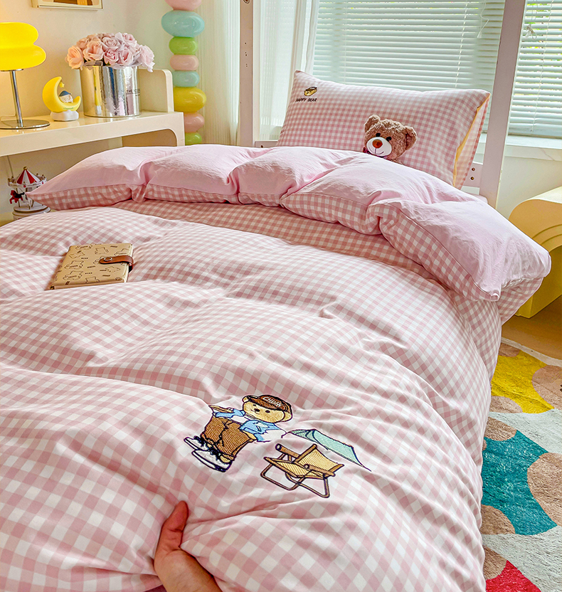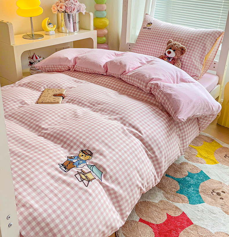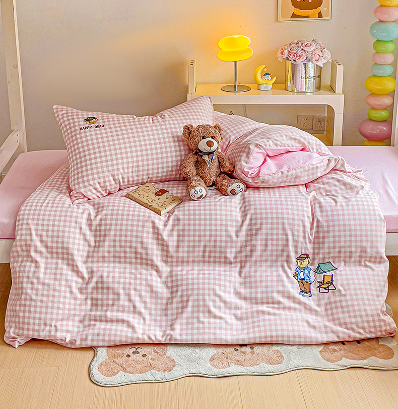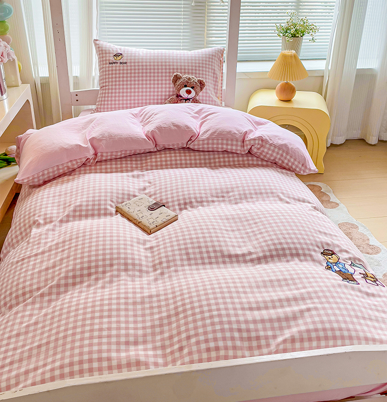 商品名称:2024新款磨毛水洗棉学生宿舍精美刺绣时尚格子四件套--小熊老师系列 小熊老师-粉