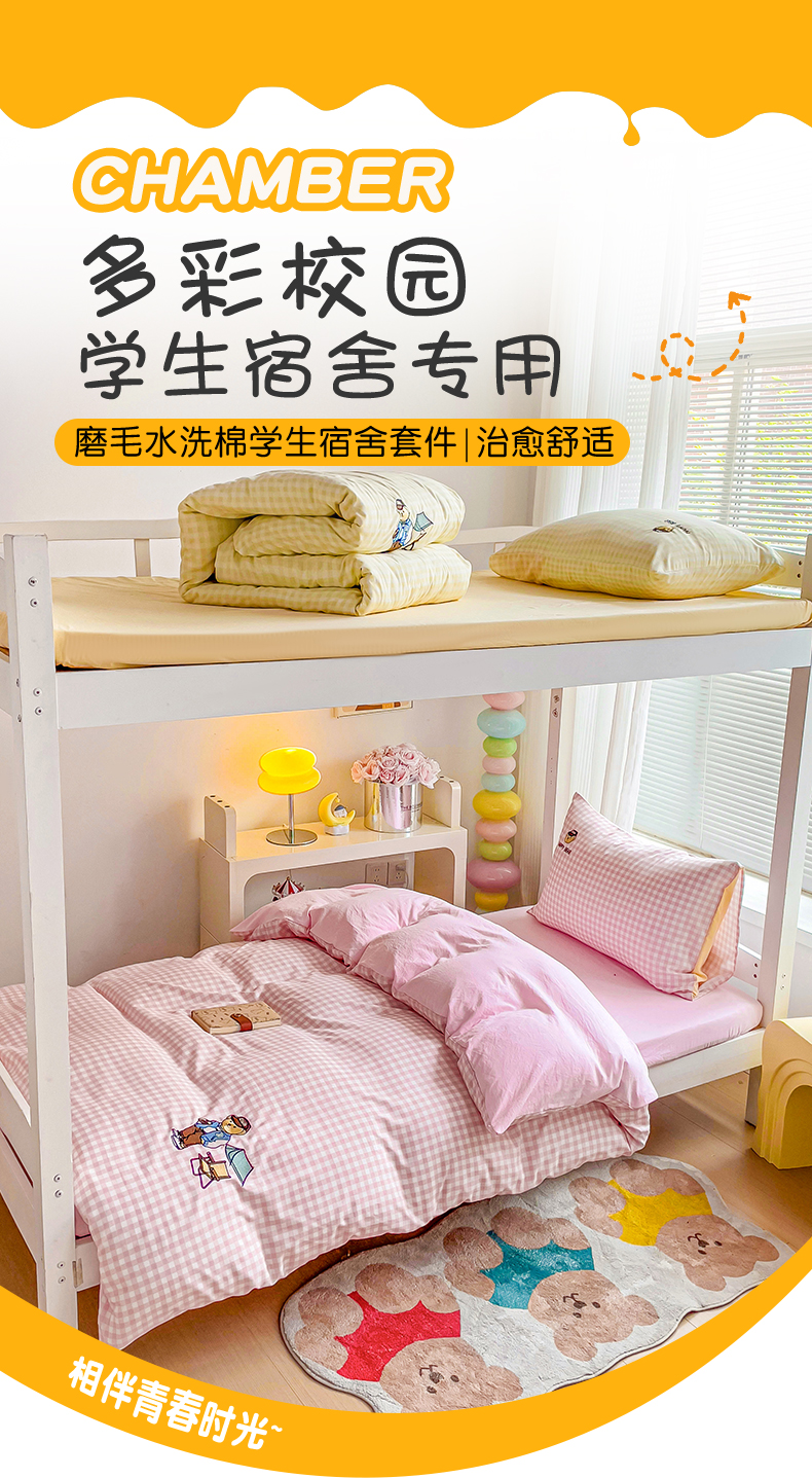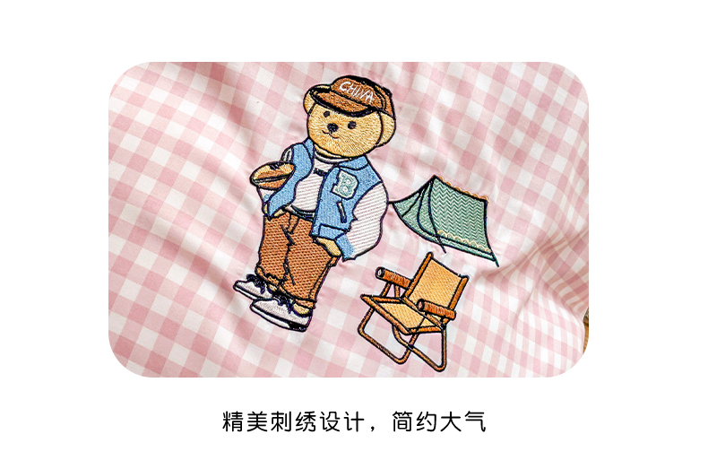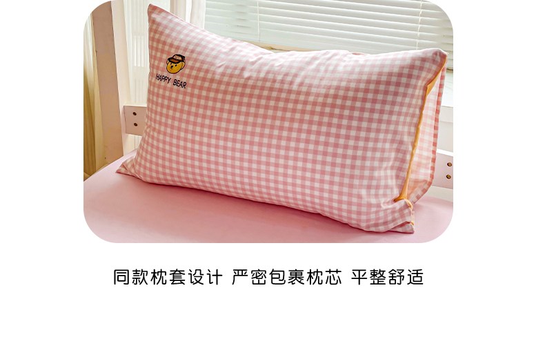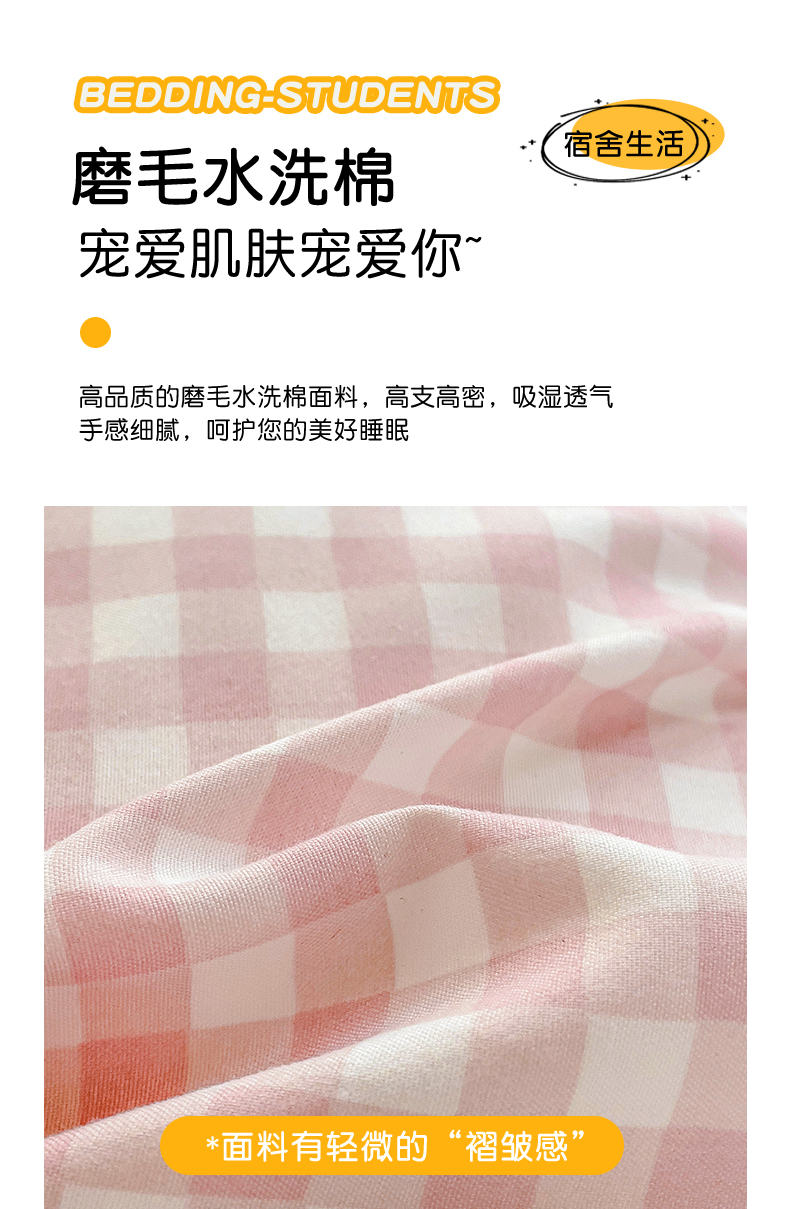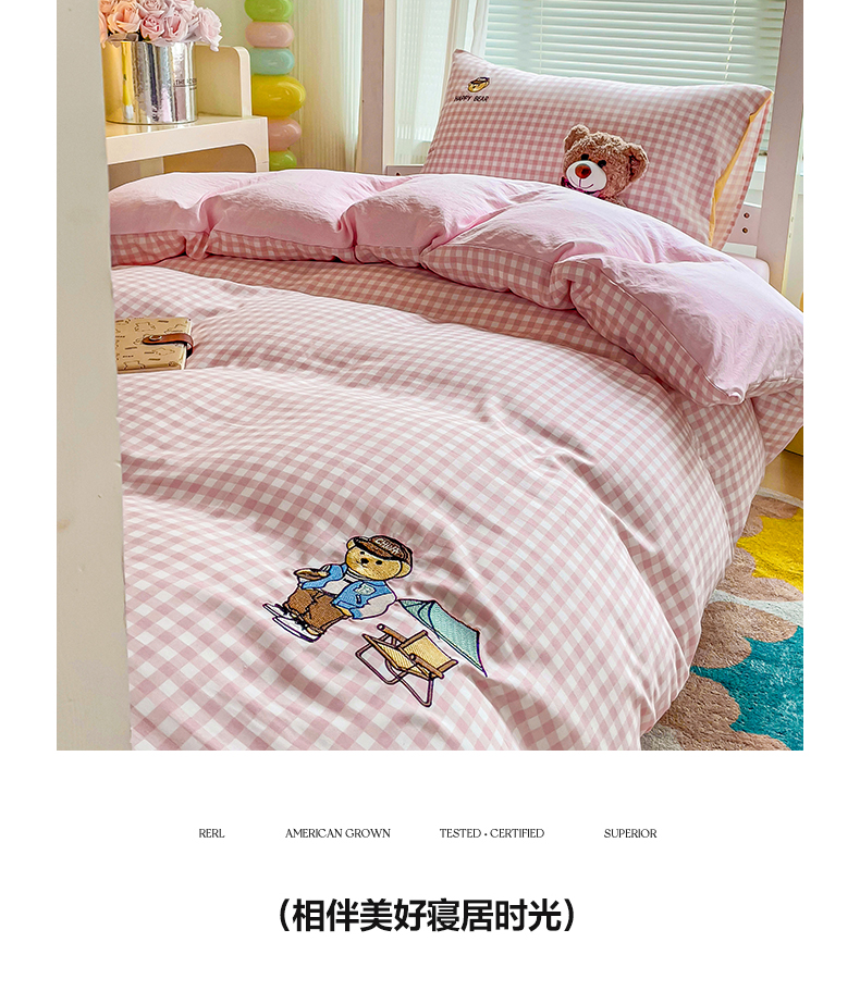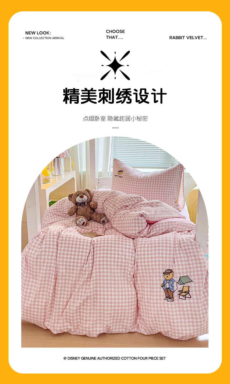 商品名称:2024新款磨毛水洗棉学生宿舍精美刺绣时尚格子四件套--小熊老师系列 小熊老师-粉