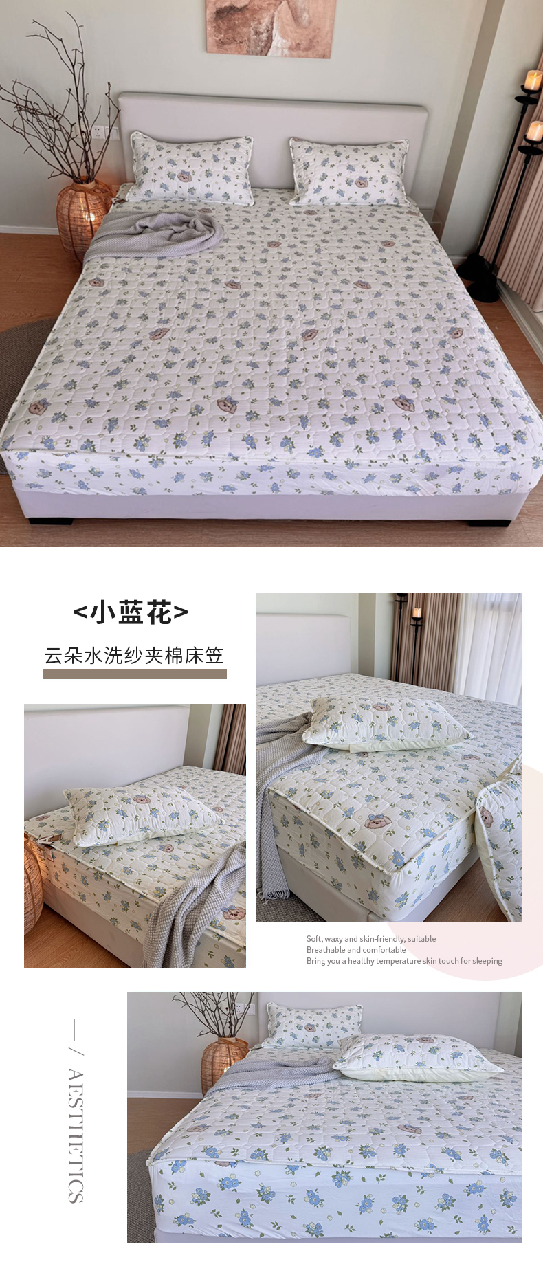 商品名称:兜米家居 2024新款云朵水洗纱夹棉单品床笠 小蓝花