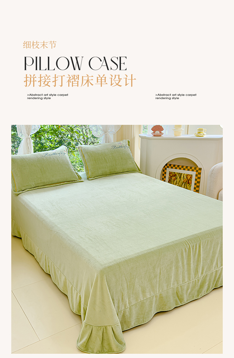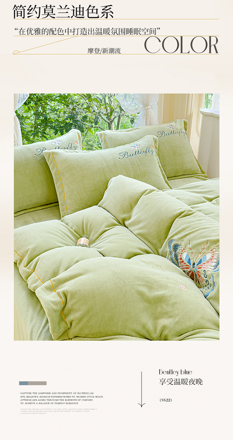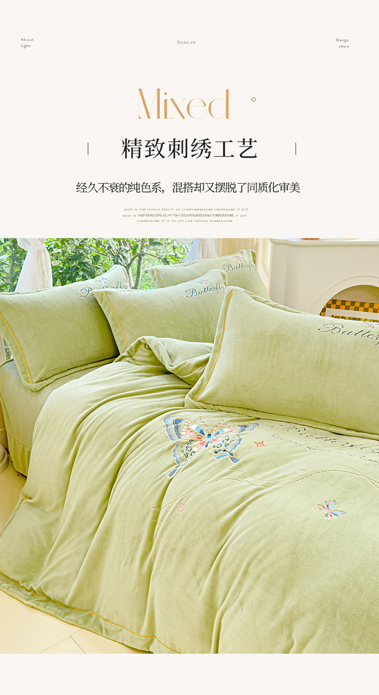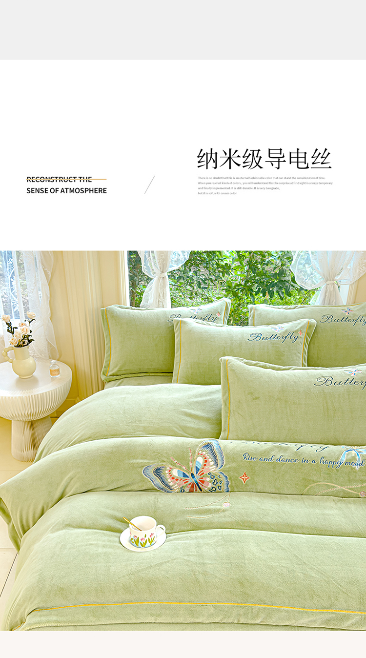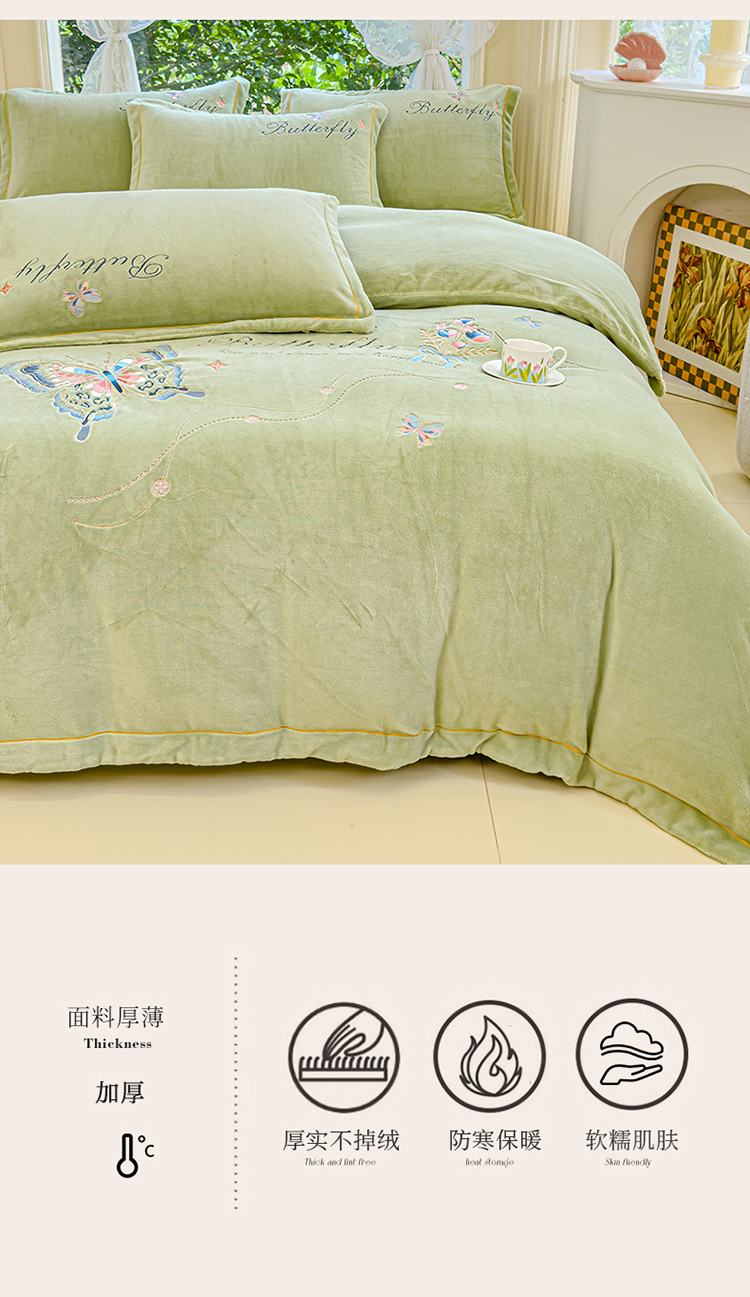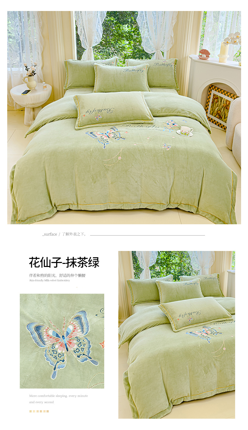 商品名称:慕克斯 2024新款重工刺绣牛奶绒四件套-花仙子 花仙子抹茶绿
