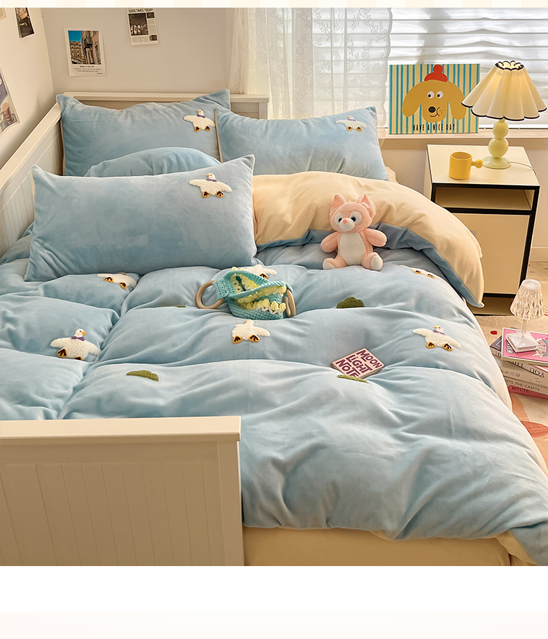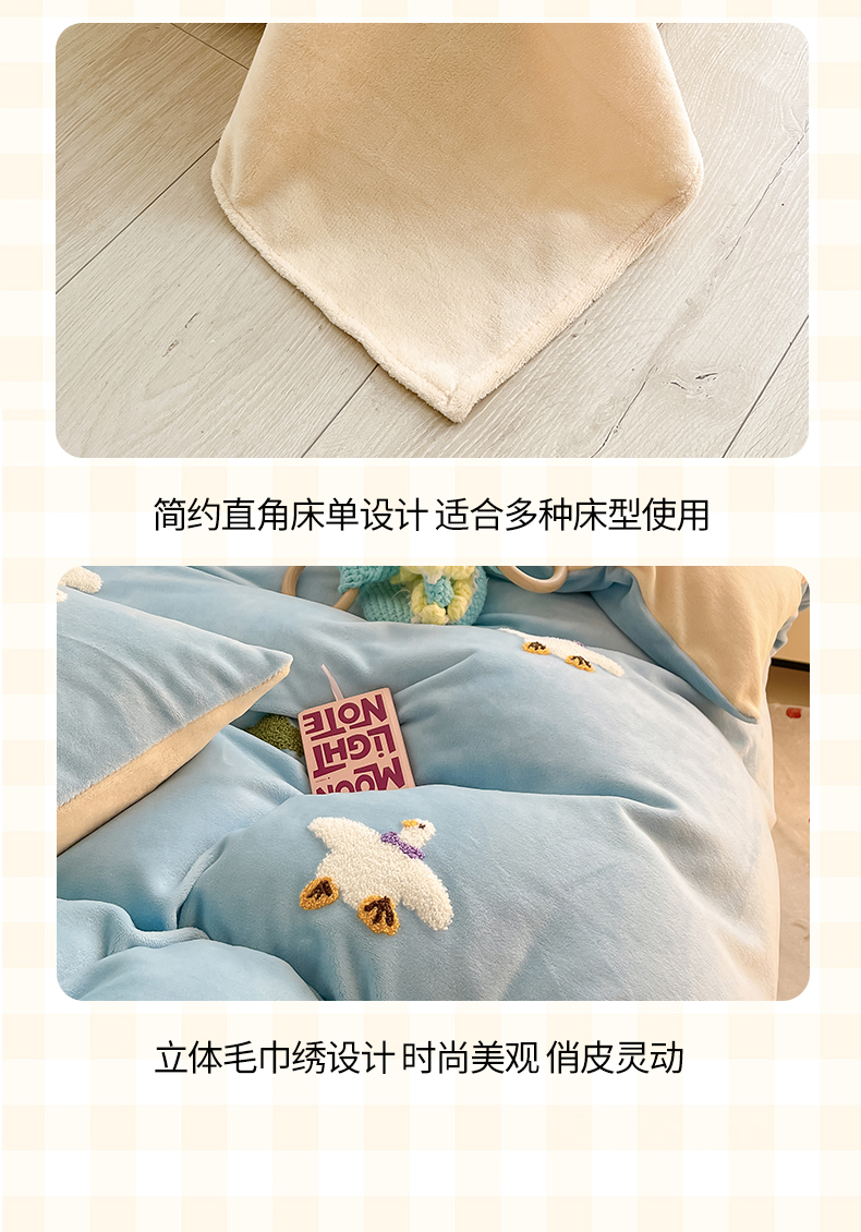 (总)羚羊语家纺 2025新款牛奶绒手作款樱桃女孩四件套毛巾绣刺绣花秋冬加厚法莱绒法兰绒珊瑚绒三件套(买家秀请联系客服!),手作女孩-奶油粉,毛巾绣-平古企鹅,手作女孩-柔雾紫,毛巾绣-自由大鹅,毛巾绣-腊肠狗,手作女孩-燕麦奶,手作女孩-清新绿