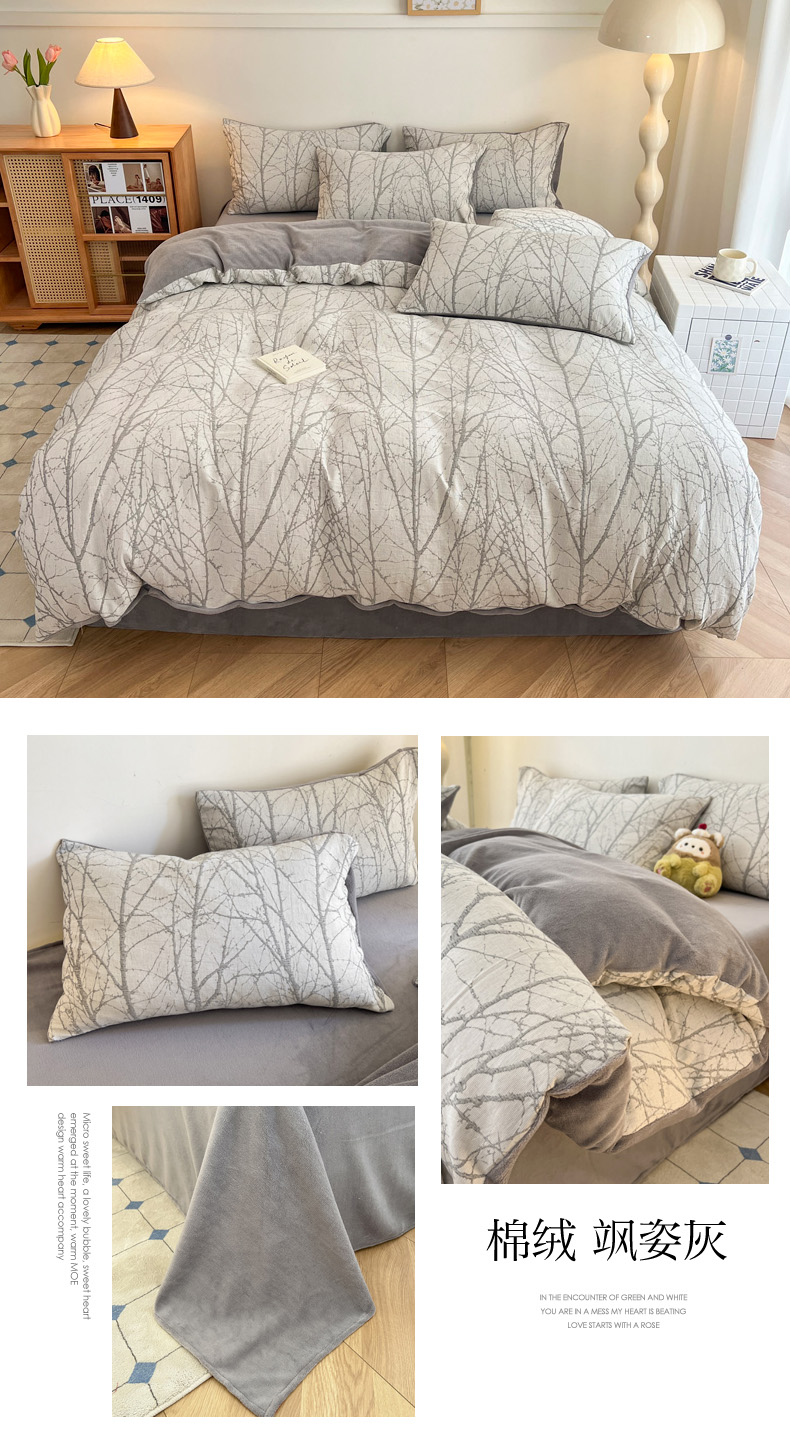 商品名称:柠馨 2024新款轻奢全棉三层纱牛奶绒棉绒加厚保暖四件套 棉绒-飒姿灰